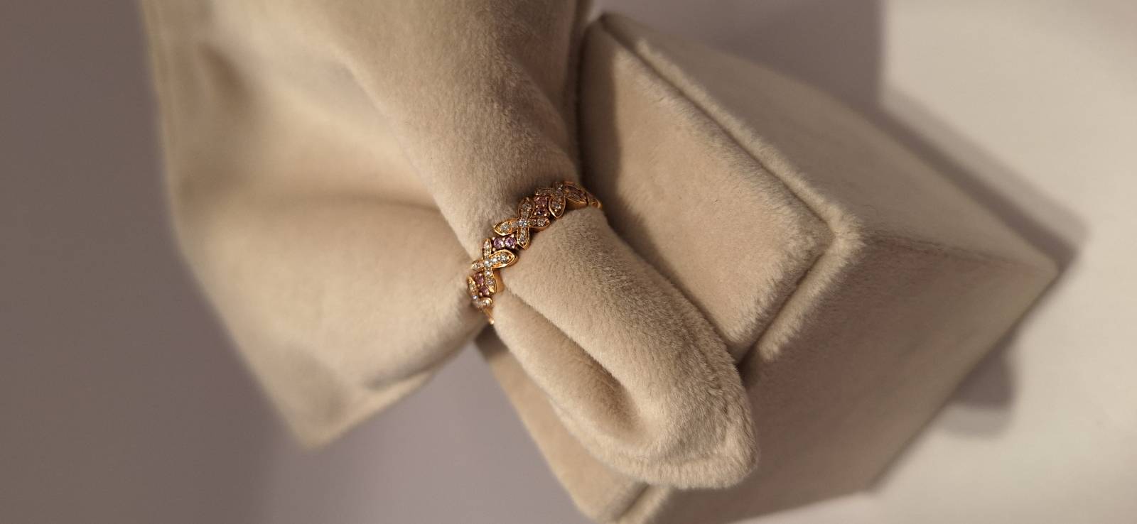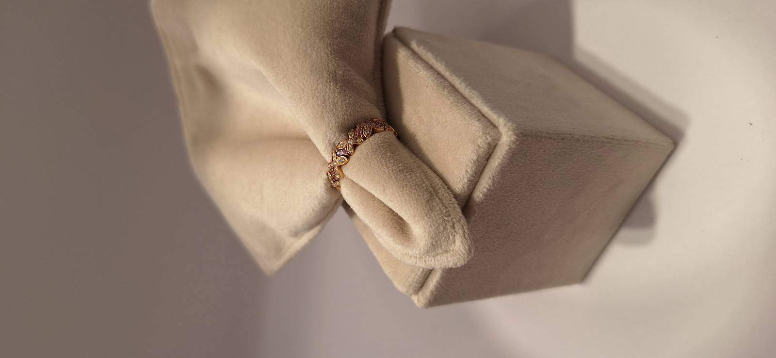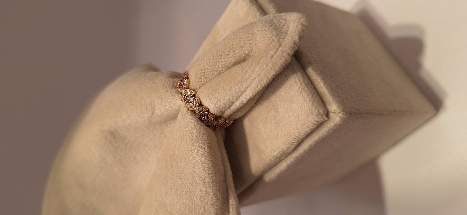Delizioso anello a fascetta in oro rosa 18 Kt composto da un susseguirsi di piccole farfalle stilizzate tempestate di brillanti per ct 0,32 ed intervallate da piccoli zaffiri rosa per ct 0,20. L'anello raffigurato è misura 13 0 53.
