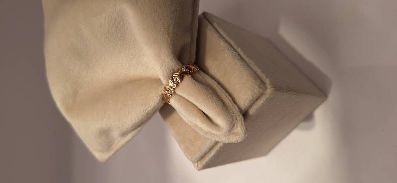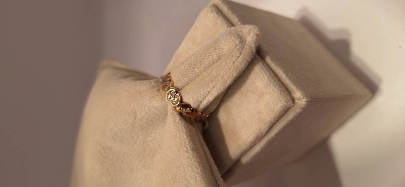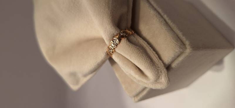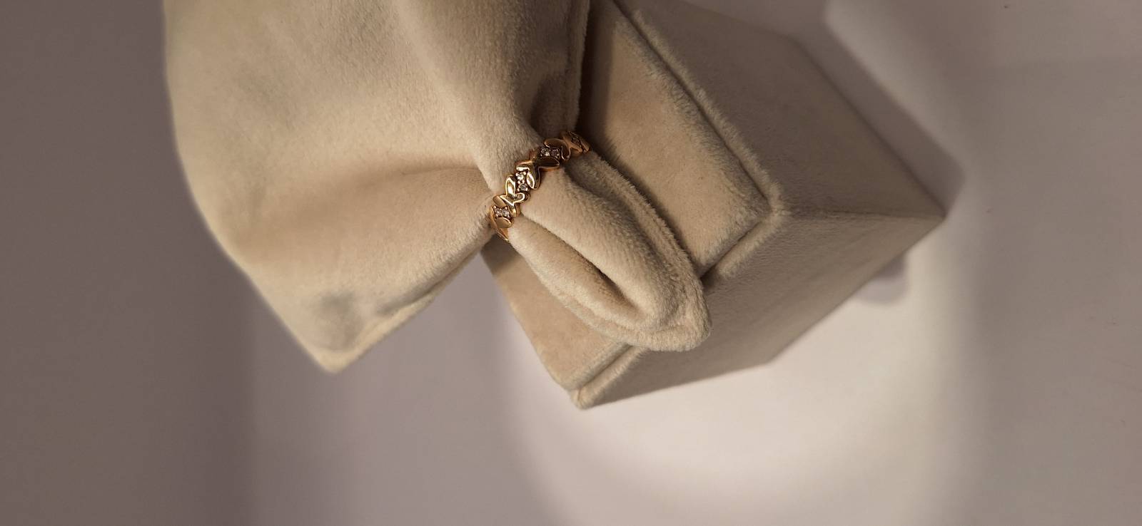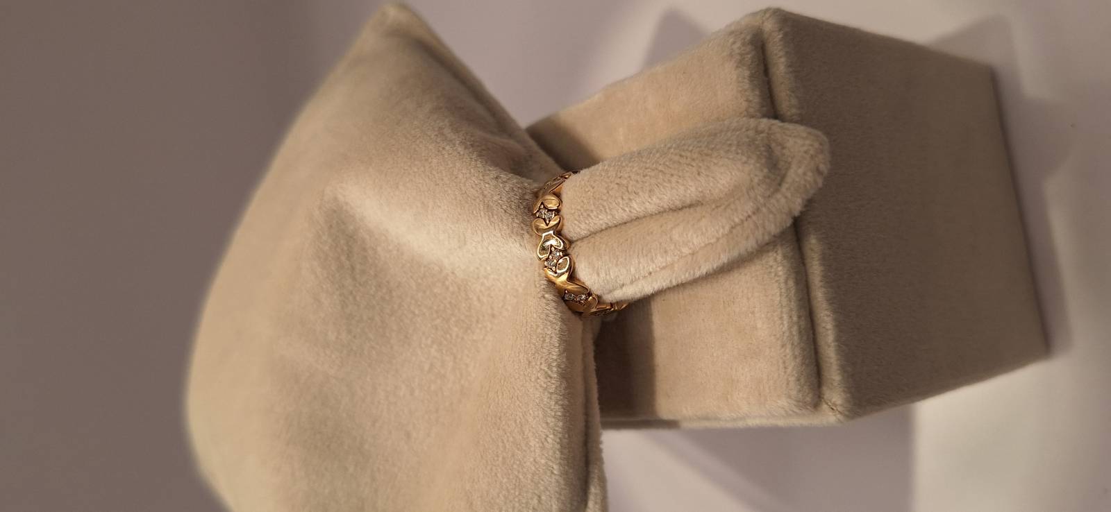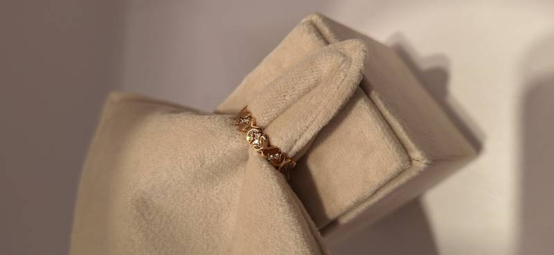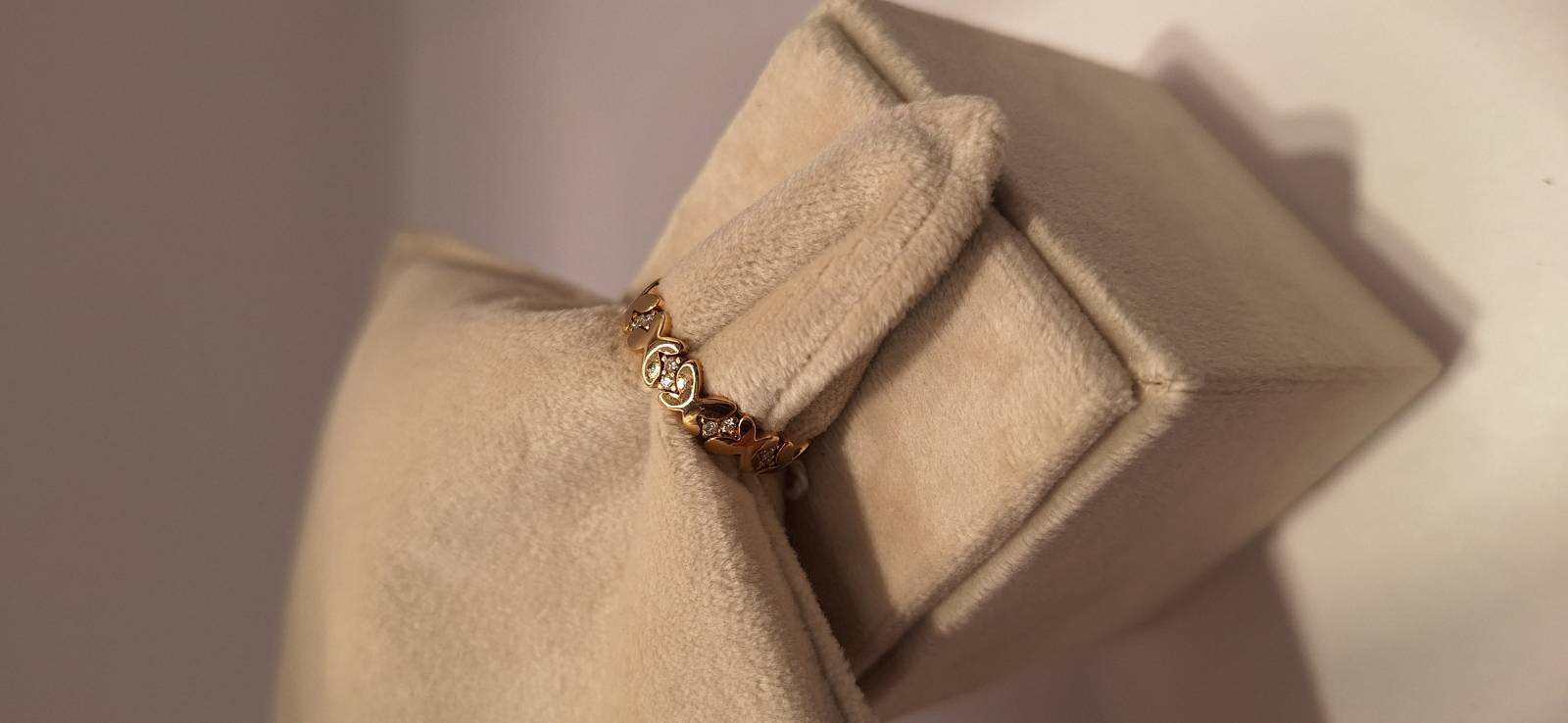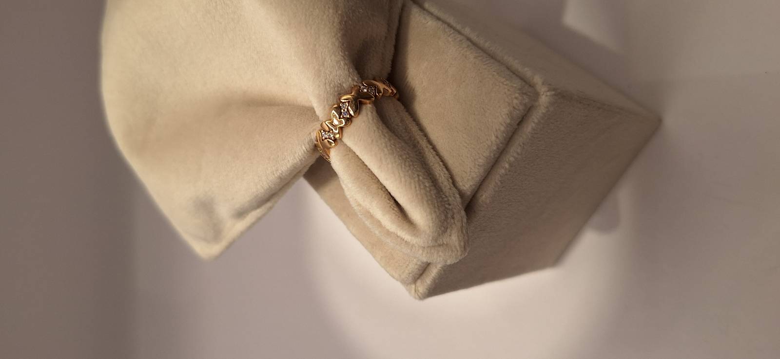 Delizioso anello a fascetta in oro rosa 18 Kt composto da un susseguirsi di piccole farfalle stilizzate intervallate da piccoli brillanti per ct 0,18. L'anello raffigurato è misura 13 0 53.