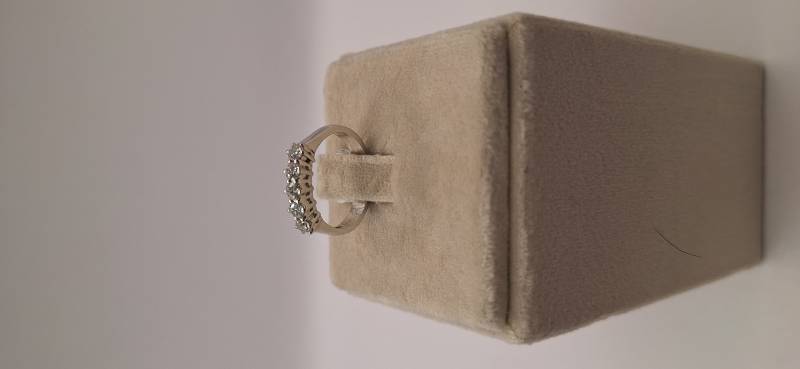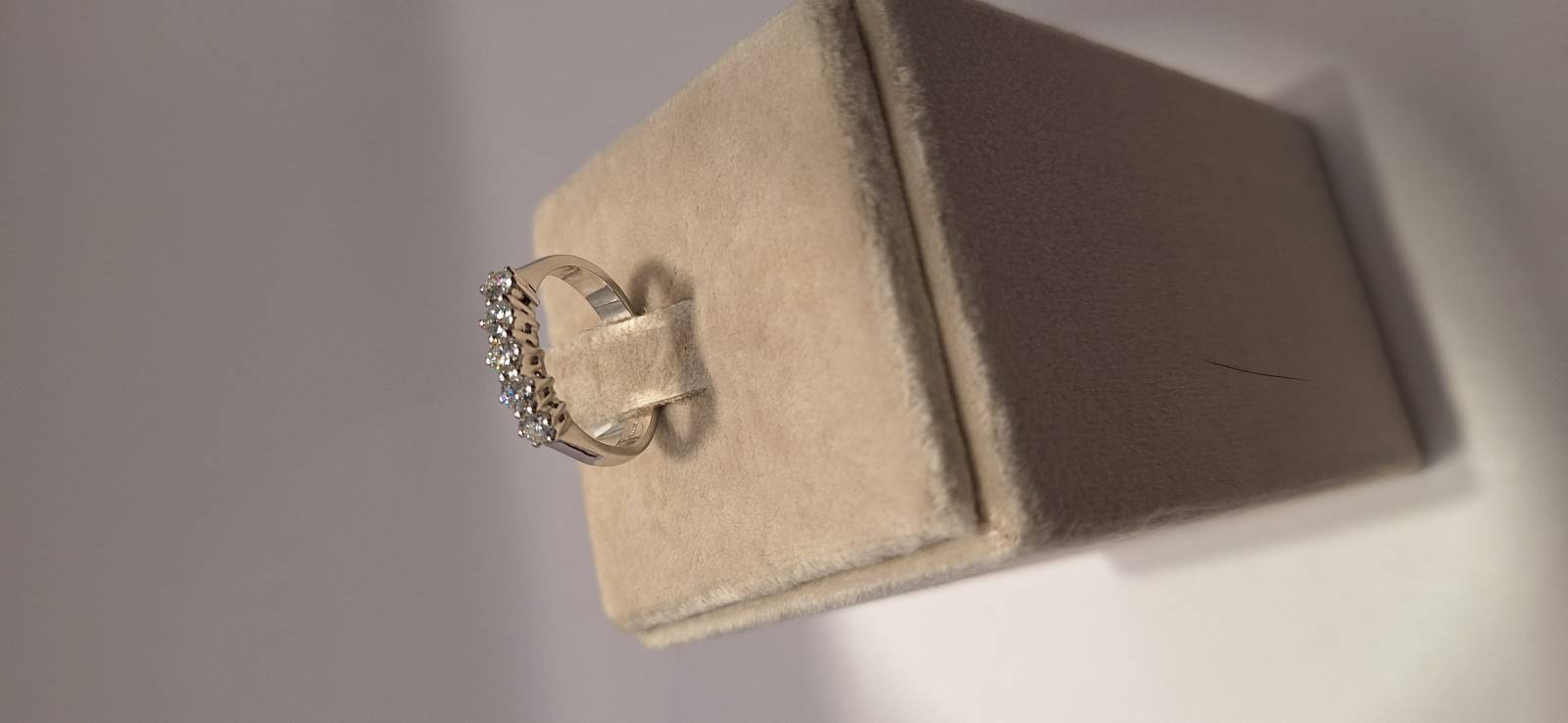 Deliziosa fedina in oro bianco 18 Kt con 12 brillanti di grandezza a scalare montati su griffes per un totale di ct 0,51 colore G, purezza VS. L'anello fotografato è misura 14 (o 54) ma puo' essere realizzato anche in diverse misure.