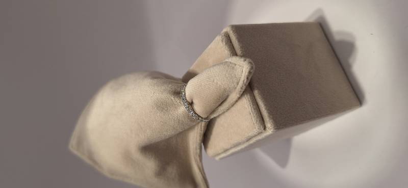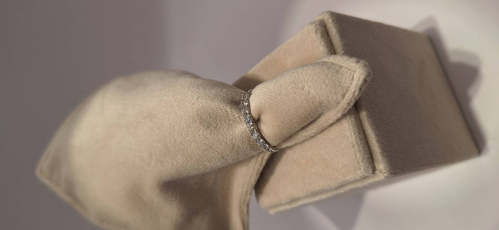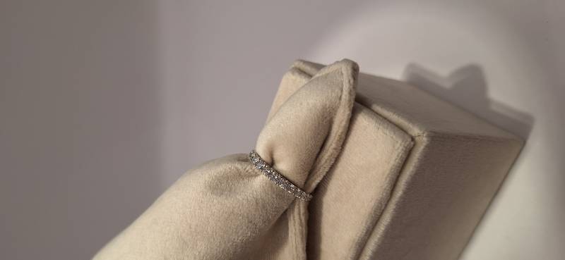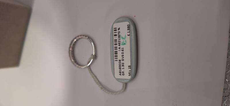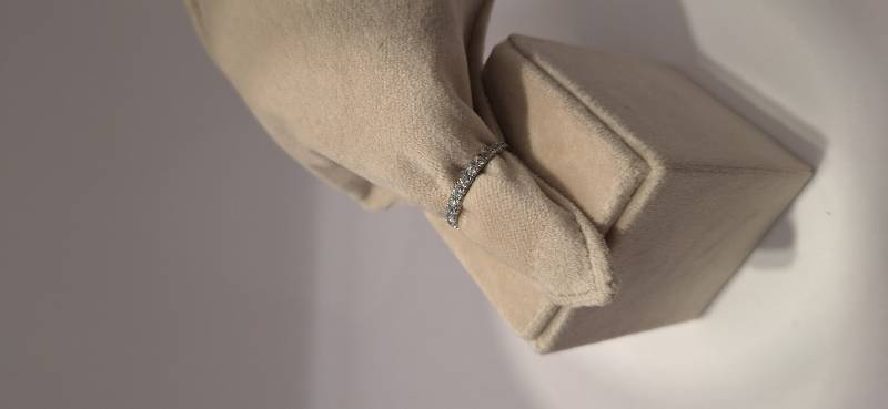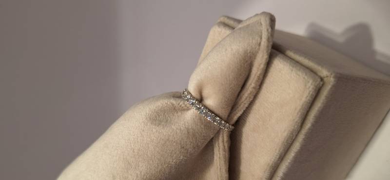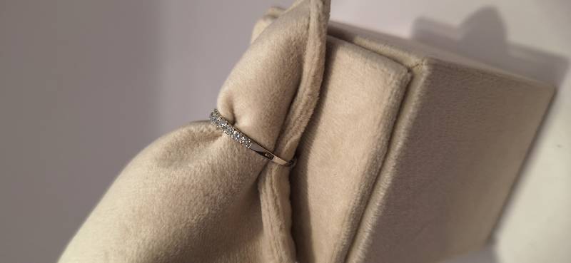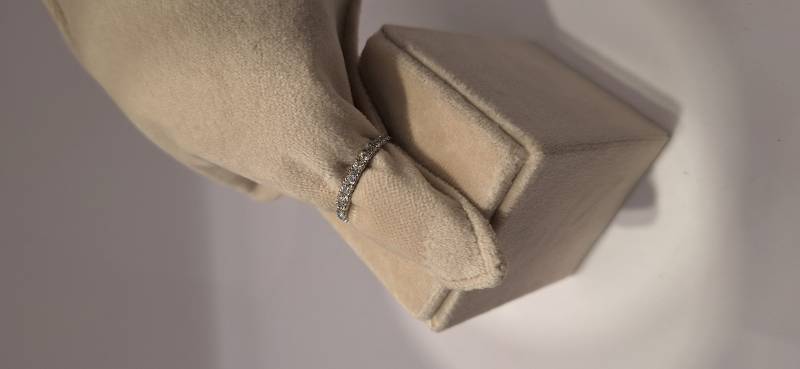 Deliziosa fedina in oro bianco 18 Kt con 17 brillanti di grandezza a scalare montati su griffes per un totale di ct 0,61 colore f-G, purezza VS. L'anello fotografato è misura 15 (o 55) ma puo' essere realizzato anche in diverse misure.
