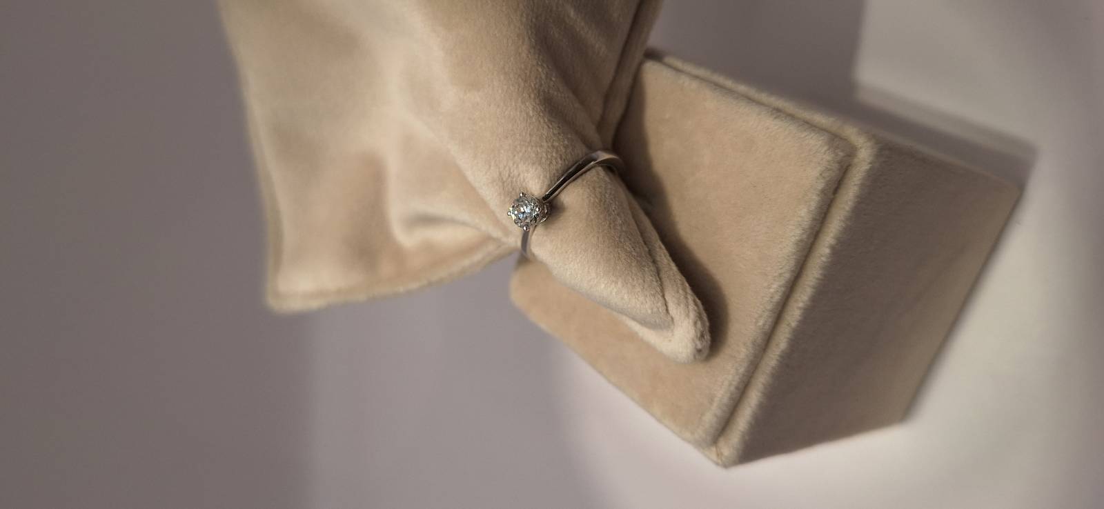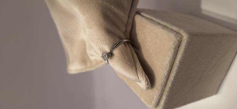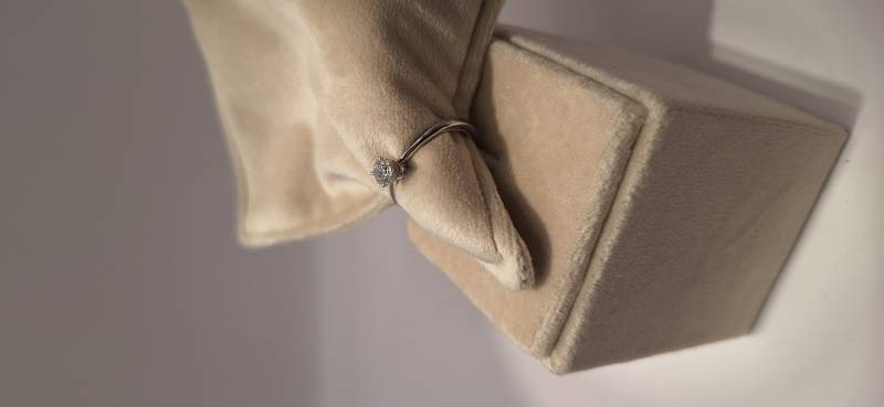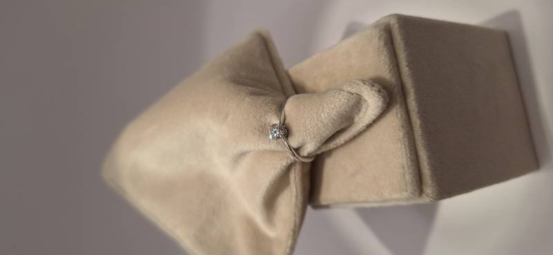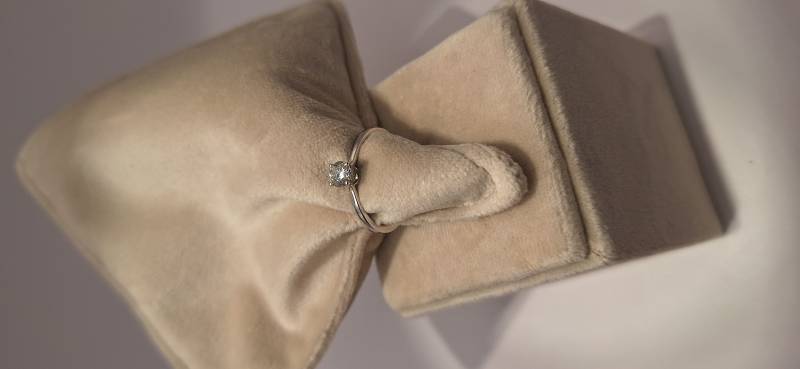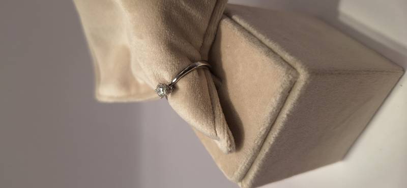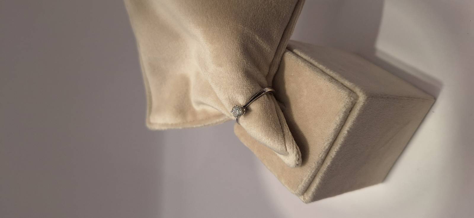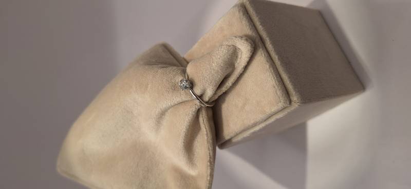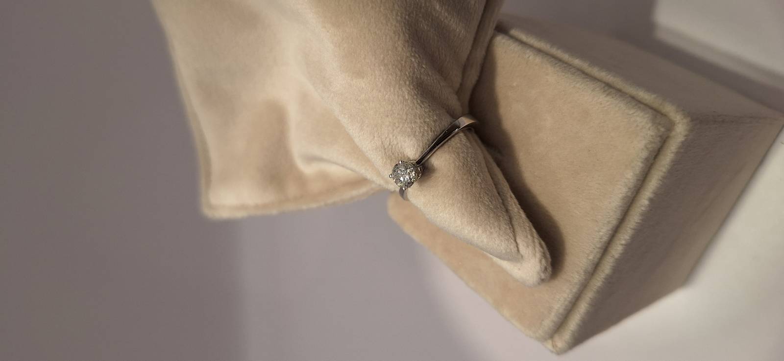 Delizioso anello in oro bianco 18 Kt con solitario di ct 0,40, colore G, purezza VS. Il modello si caratterizza per avere il castone del solitario tempestato di piccoli brillanti per un totale di ct 0,05. L'anello rappresentato è misura 13 (o 53) ma può essere realizzato anche in misure diverse. Ogni anello di Giorgio Visconti viene consegnato con certificato di autenticità e con assicurazione contro i furti valida un anno.