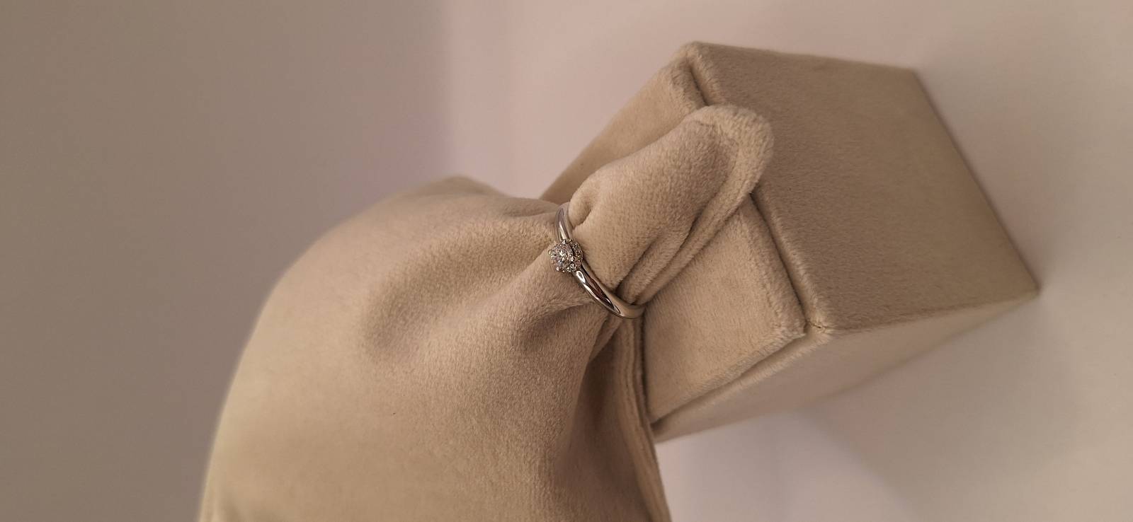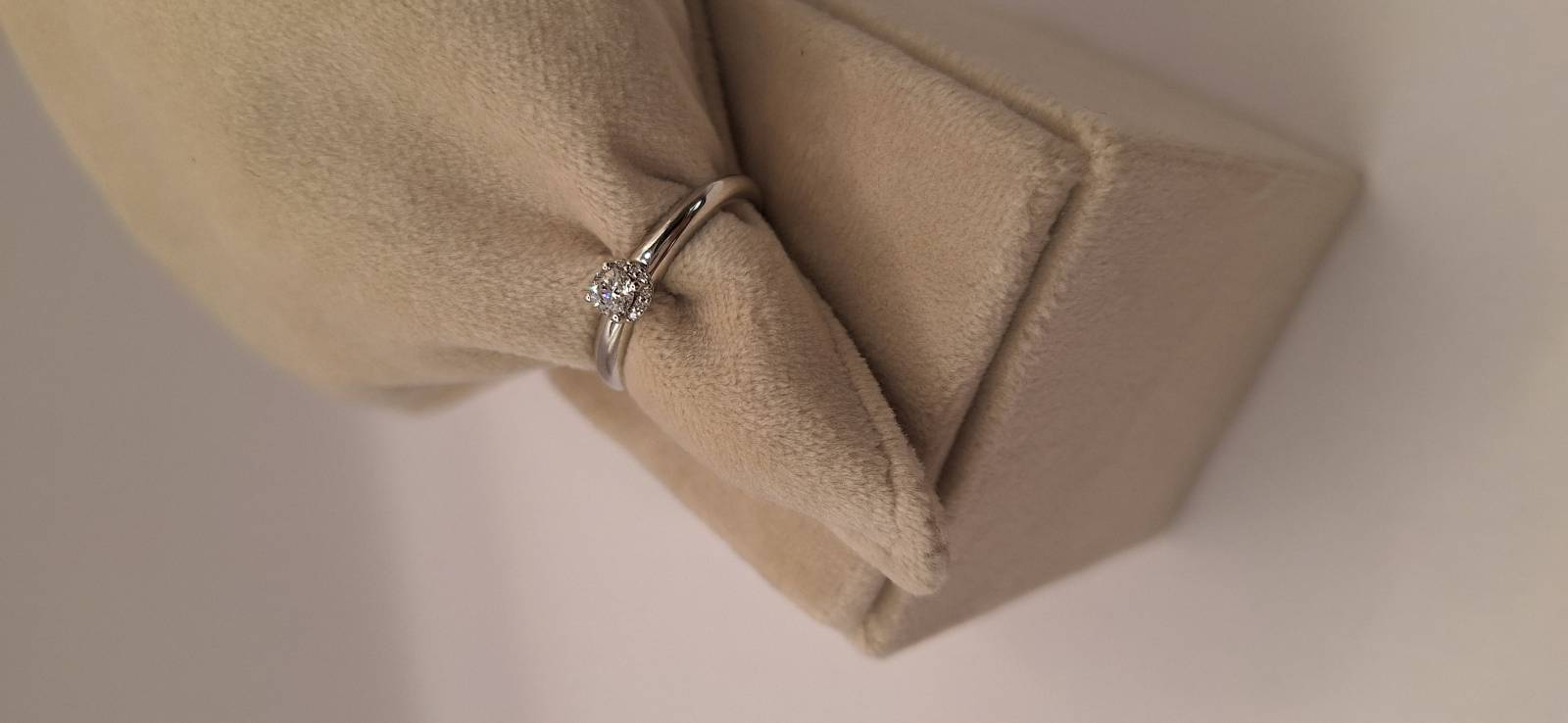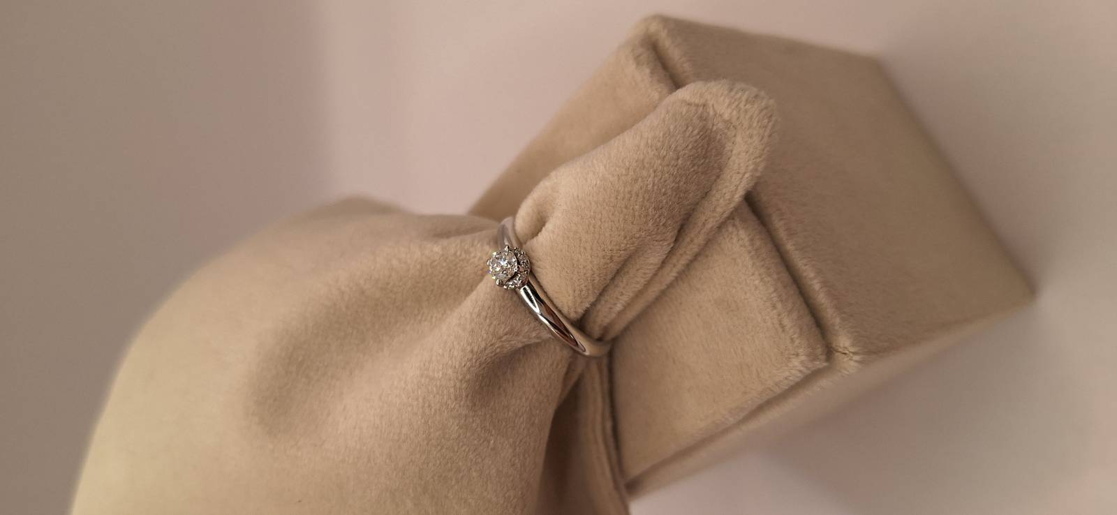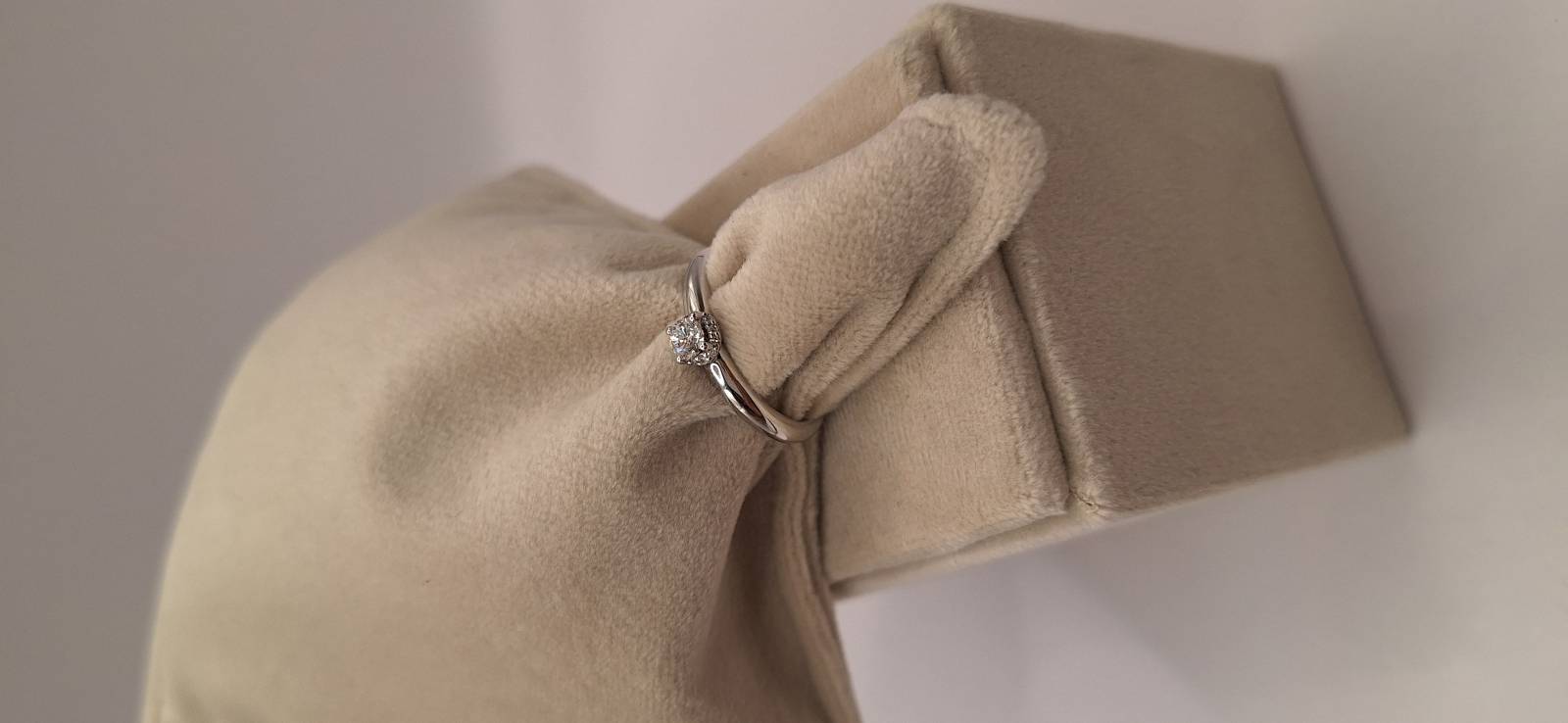 Delizioso anello in oro bianco 18 Kt composto da una fascetta liscia con al centro un solitario di ct. 0,20 colore F, purezza VS, circondato da piccoli brillanti per ct 0,05. L'anello rappresentato è misura 12 (o 52) ma può essere realizzato anche in misure diverse.