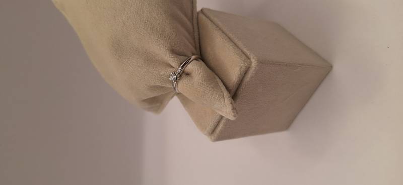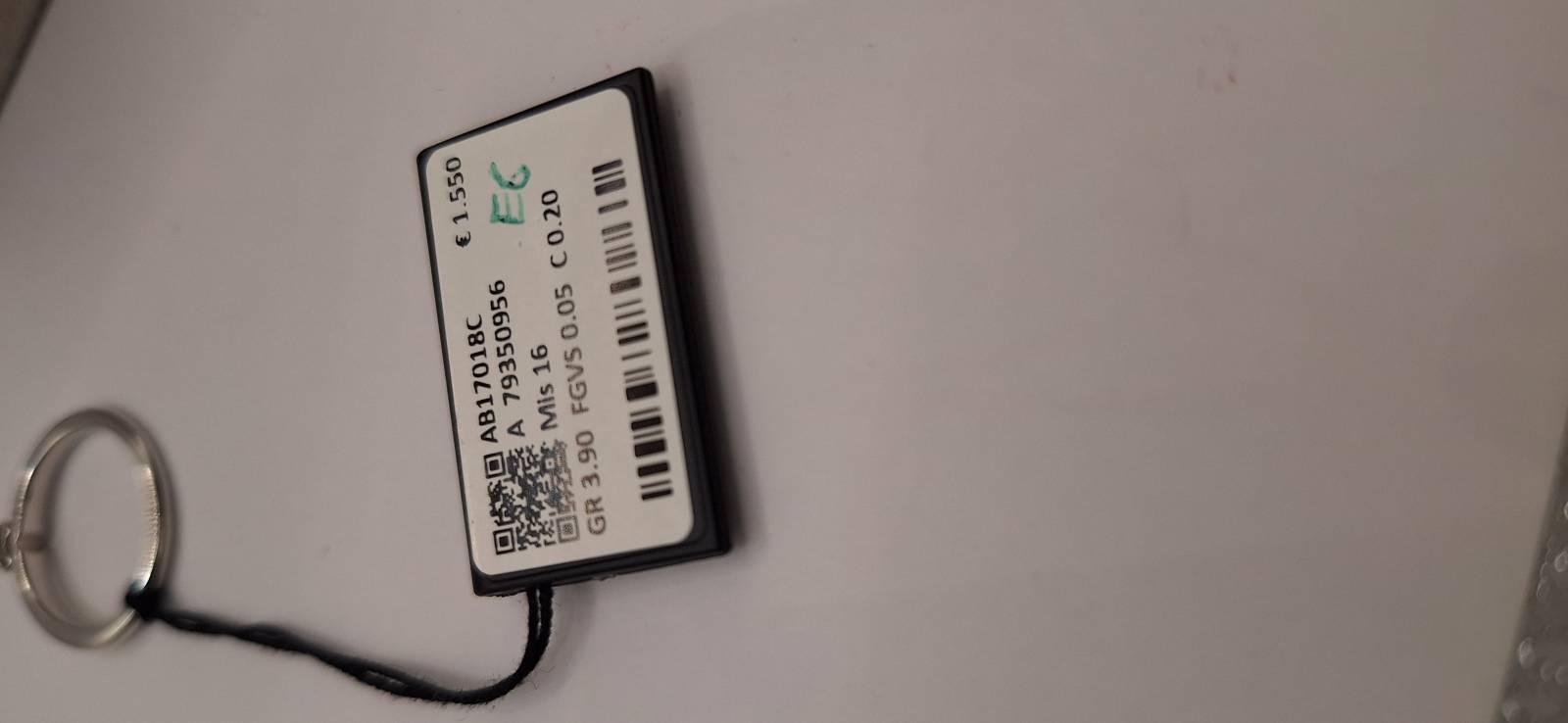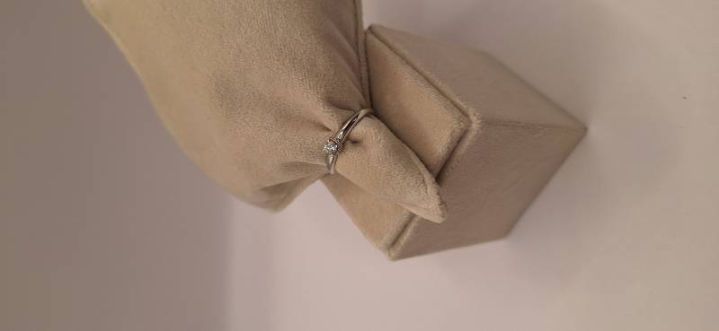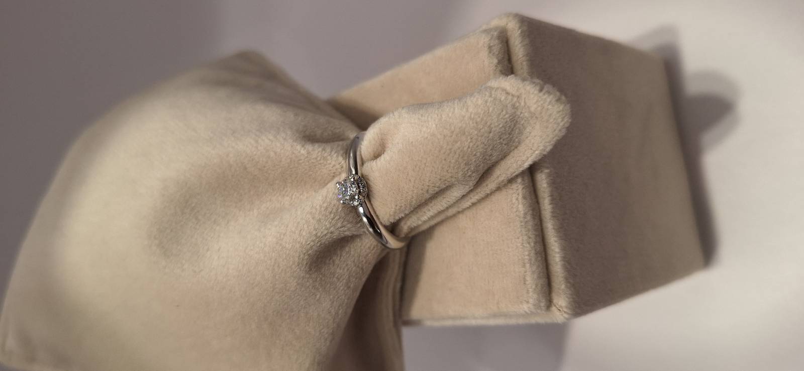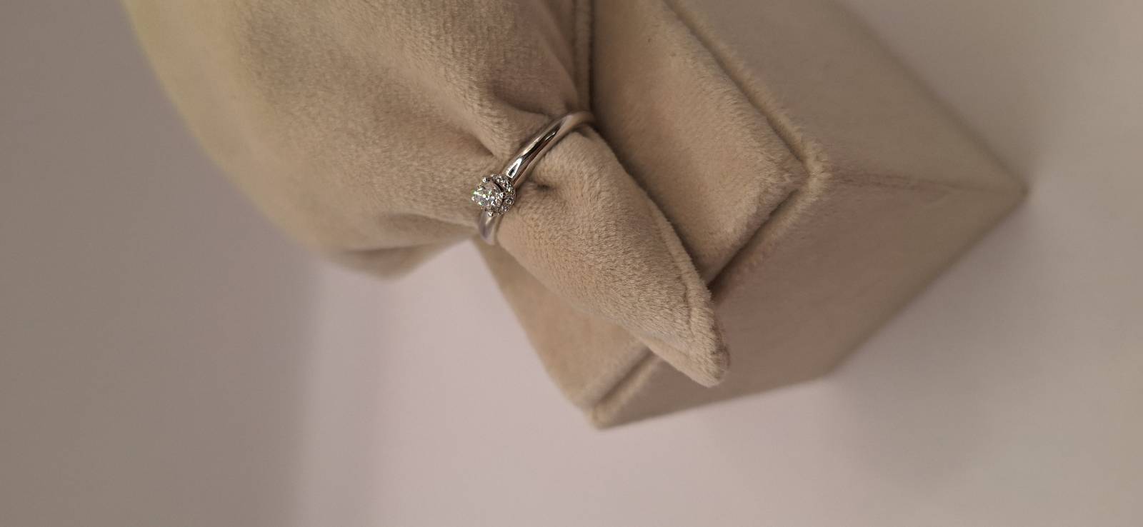 Delizioso anello in oro bianco 18 Kt composto da una fascetta liscia con al centro un solitario di ct. 0,20 colore F, purezza VS, circondato da piccoli brillanti per ct 0,05. L'anello rappresentato è misura 12 (o 52) ma può essere realizzato anche in misure diverse.