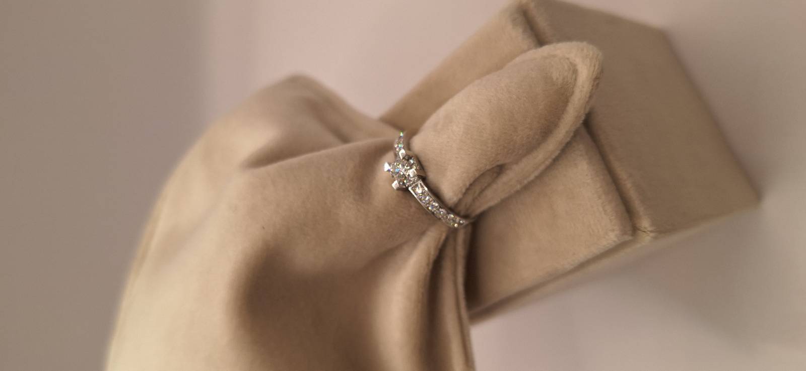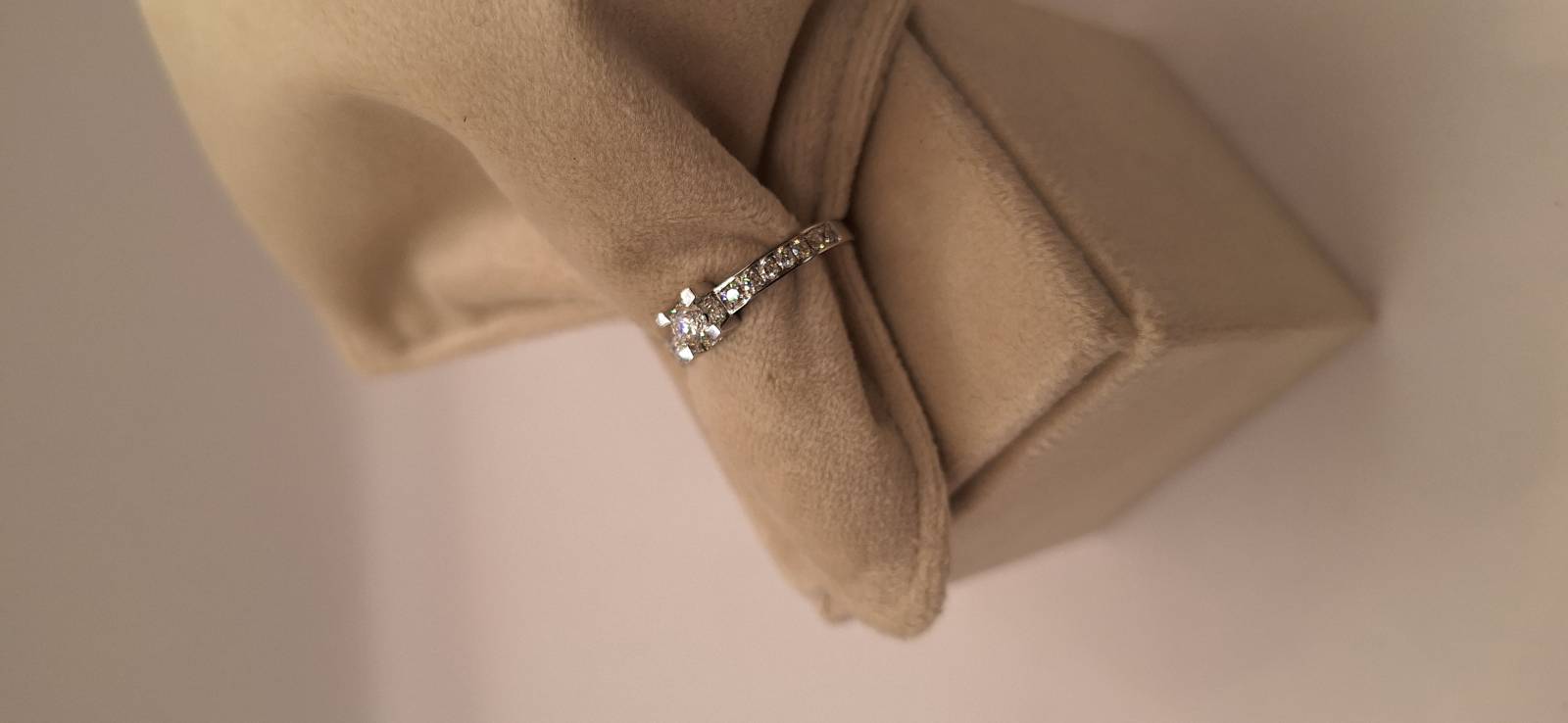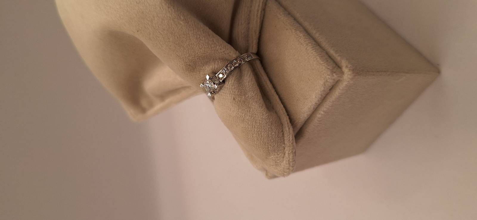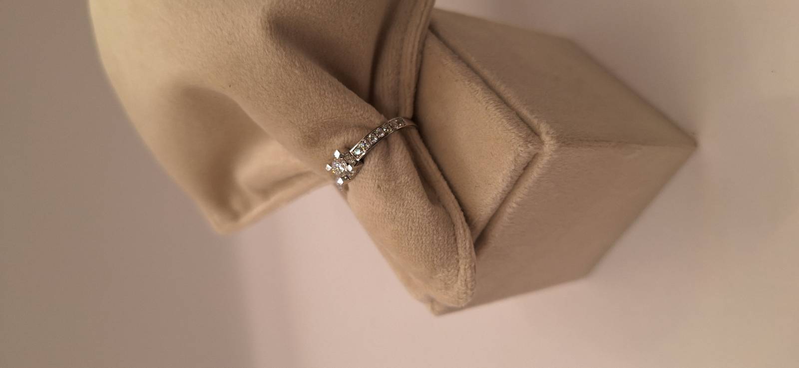 Delizioso anello in oro bianco 18 Kt composto da una fascetta liscia tempestata da brillanti per ct 0,25 con al centro un solitario di ct. 0,39 colore G, purezza VS. L'anello rappresentato è misura 13 (o 53) ma può essere realizzato anche in misure diverse. L'anello viene fornito con certificato di autenticità Giorgio Visconti oltre ad un certificato di assicurazione contro il furto valido un anno dall'acquisto.