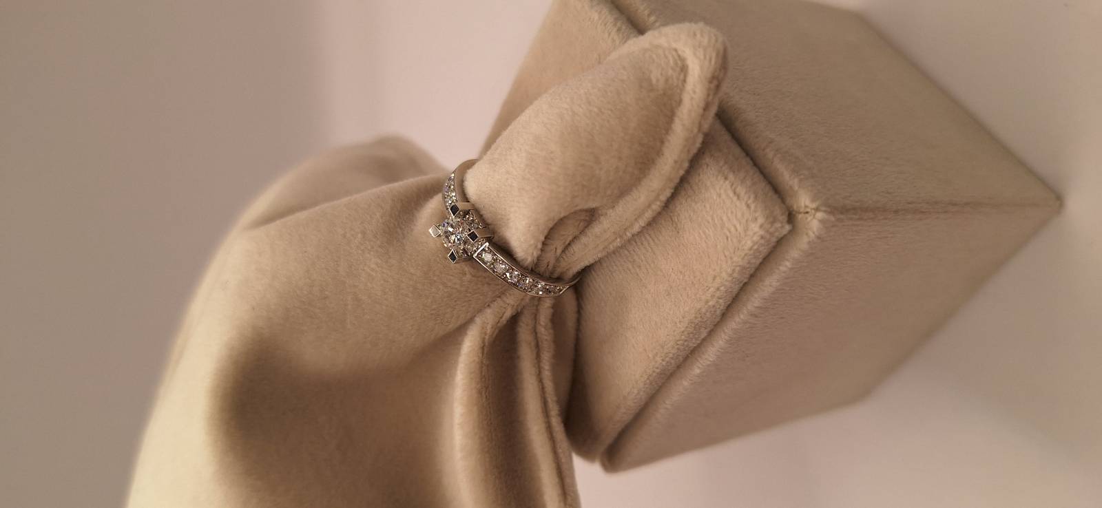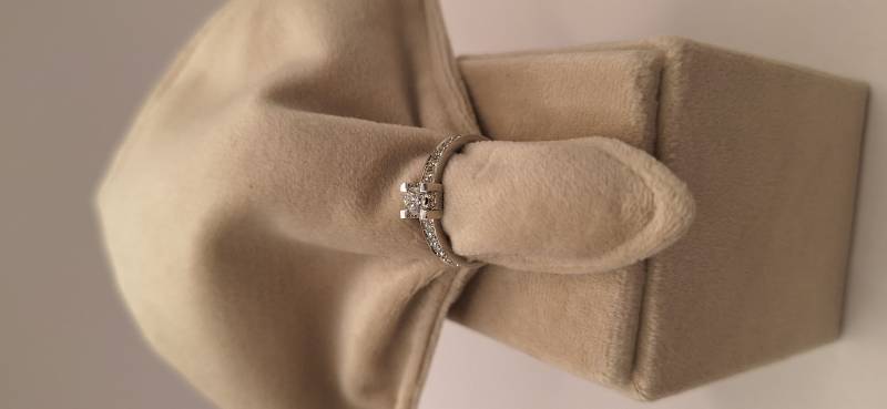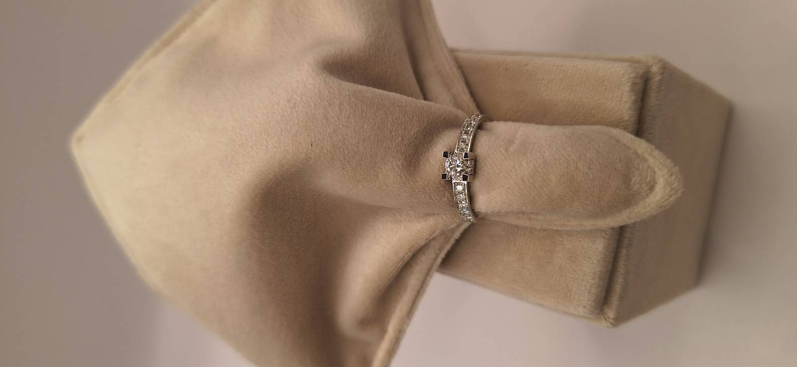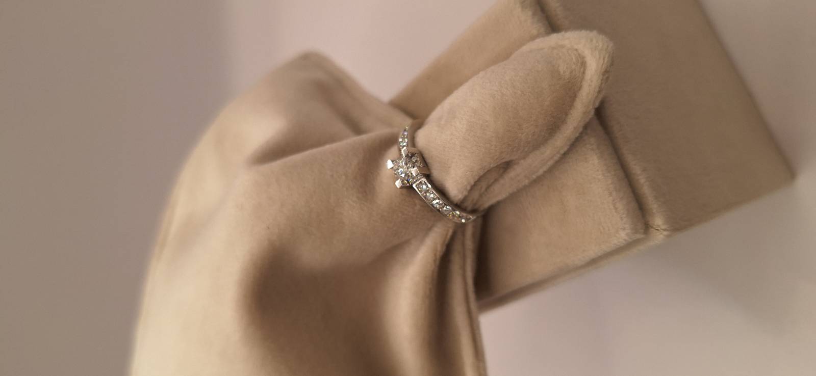 Delizioso anello in oro bianco 18 Kt composto da una fascetta liscia tempestata da brillanti per ct 0,25 con al centro un solitario di ct. 0,39 colore G, purezza VS. L'anello rappresentato è misura 13 (o 53) ma può essere realizzato anche in misure diverse. L'anello viene fornito con certificato di autenticità Giorgio Visconti oltre ad un certificato di assicurazione contro il furto valido un anno dall'acquisto.