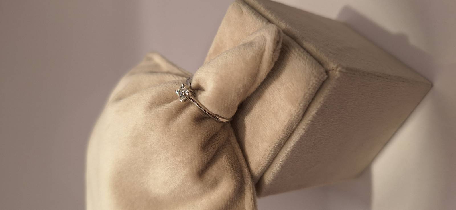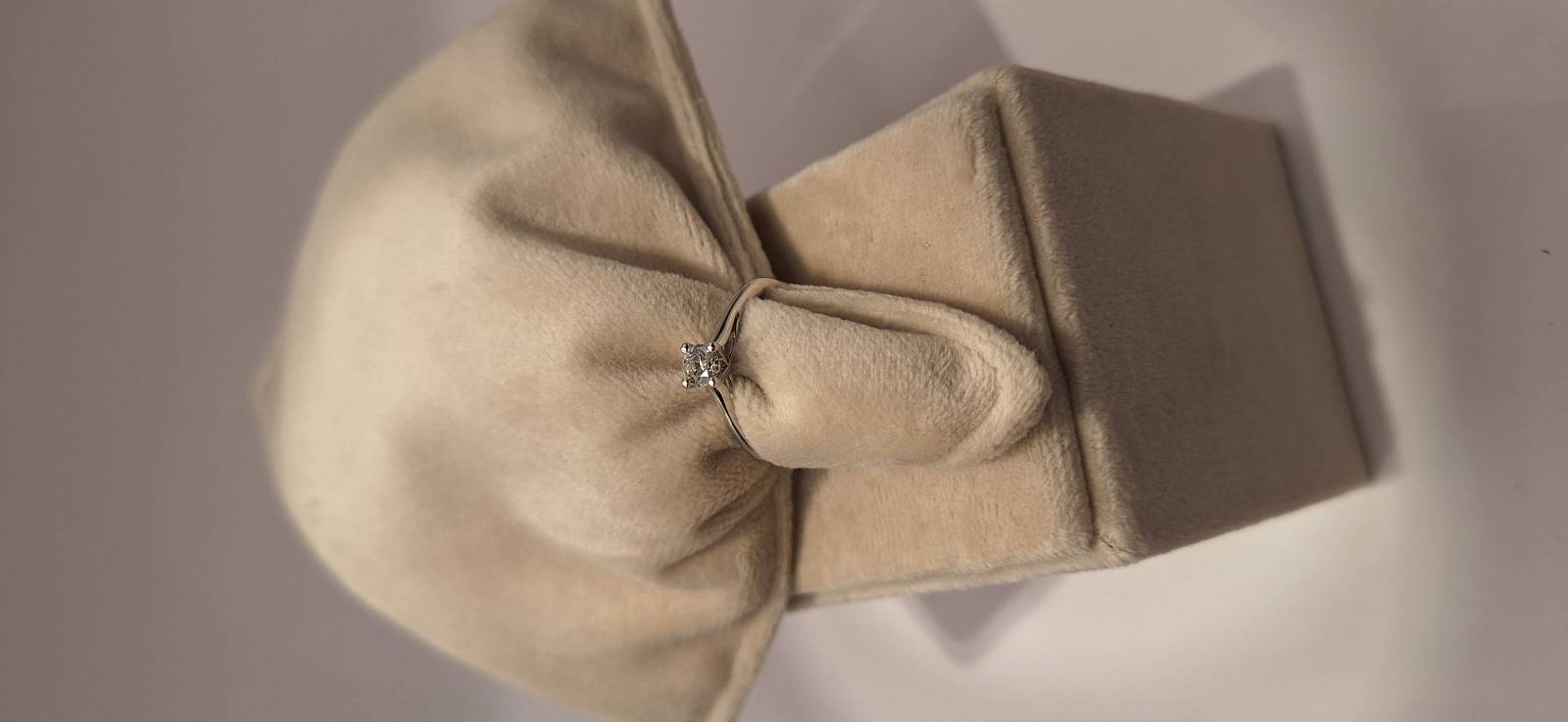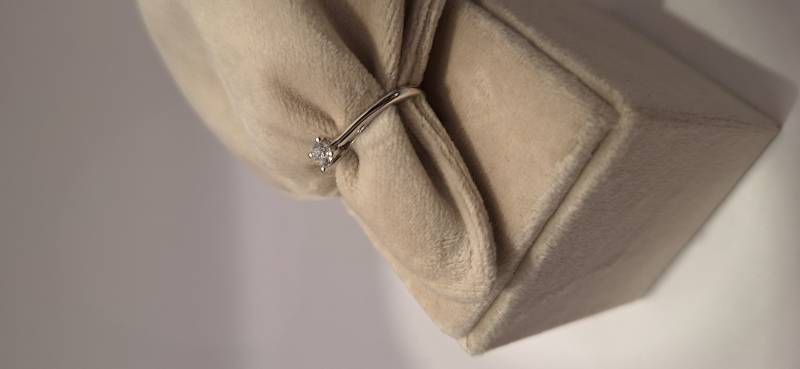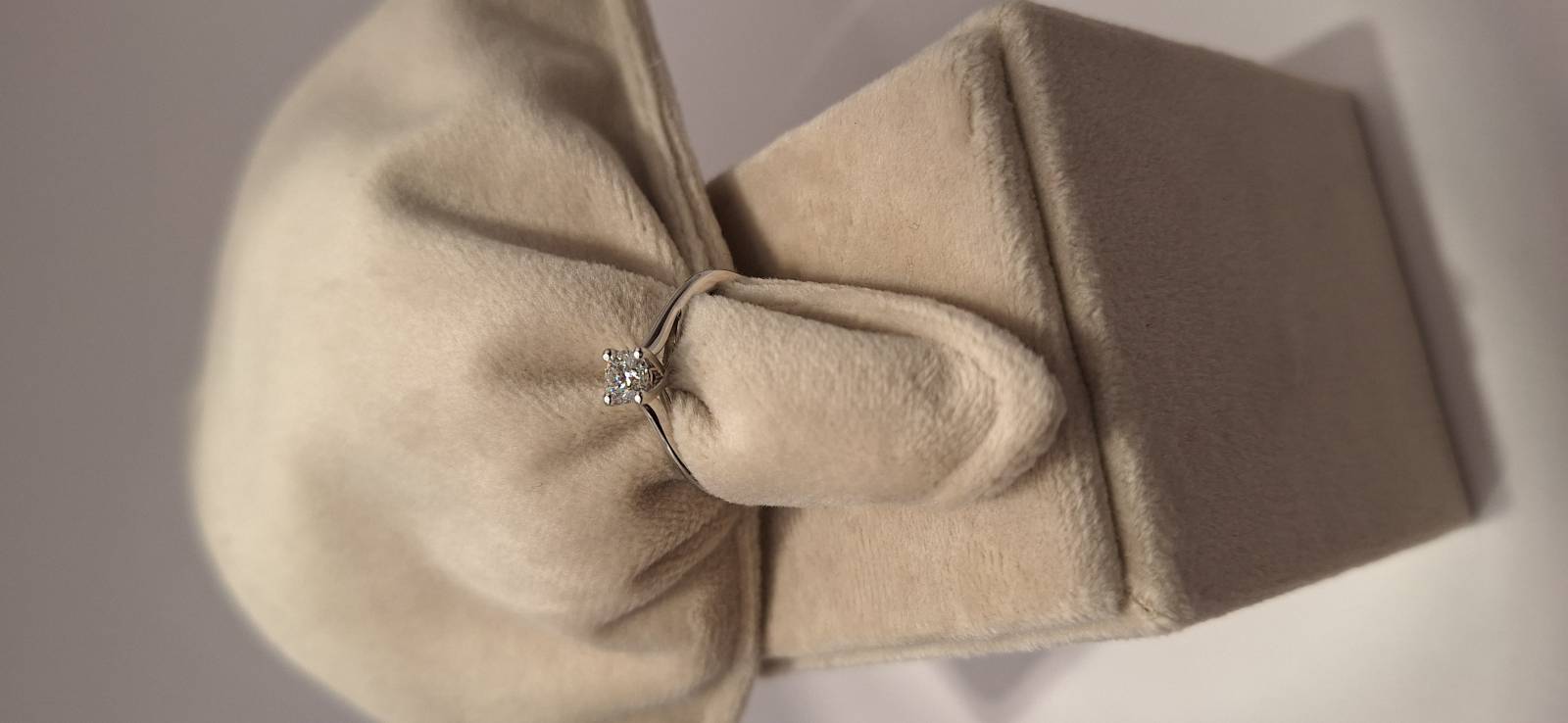 Delizioso anello in oro bianco 18 Kt composto da una sottile fedina con al centro un castone a quattro griffes che trattengono un solitario di ct 0,31 colore G, purezza VS. L'anello raffigurato è misura 12 ma può essere realizzato anche in misure diverse. L'anello è accompagnato da garanzia di originalità Giorgio Visconti oltre che da certificato di assicurazione contro i furti valido un anno dall'acquisto.