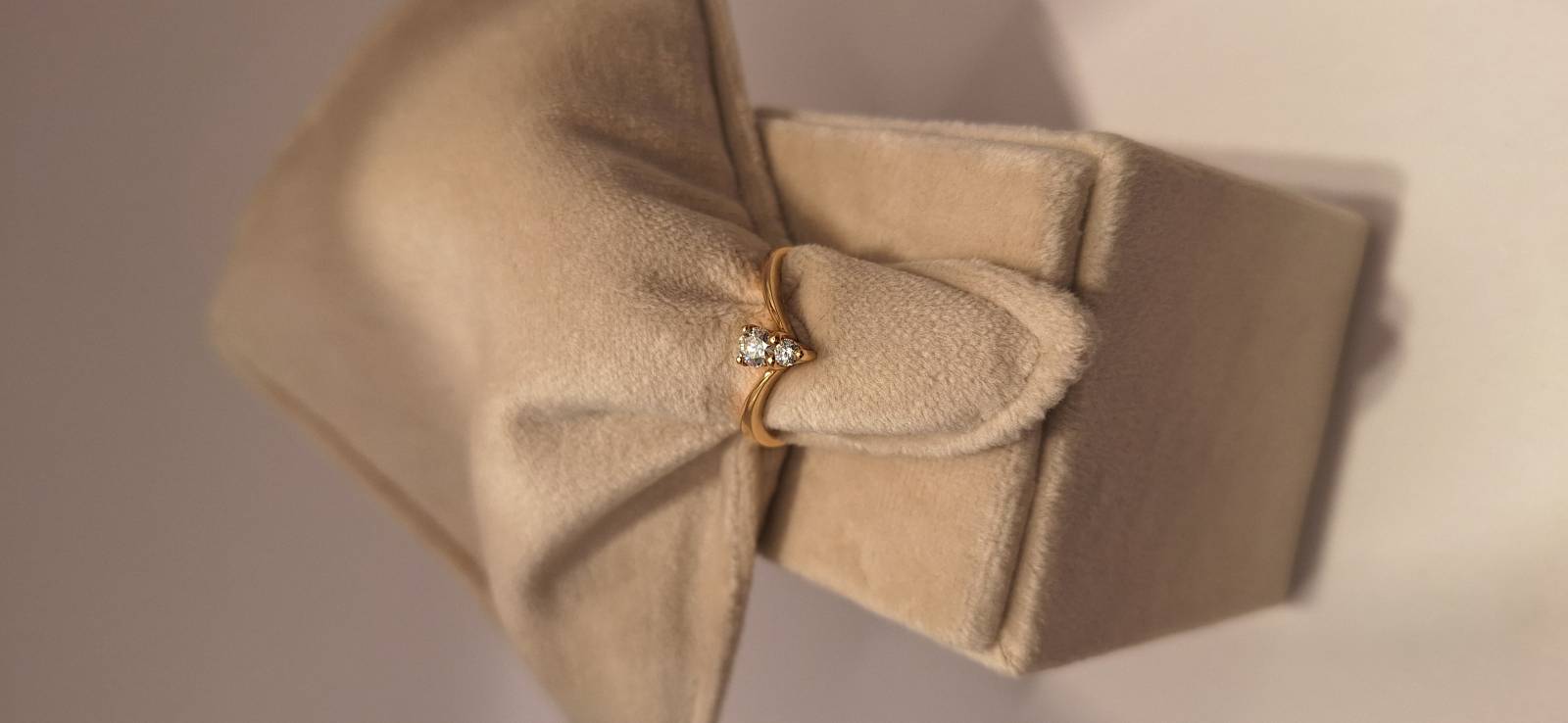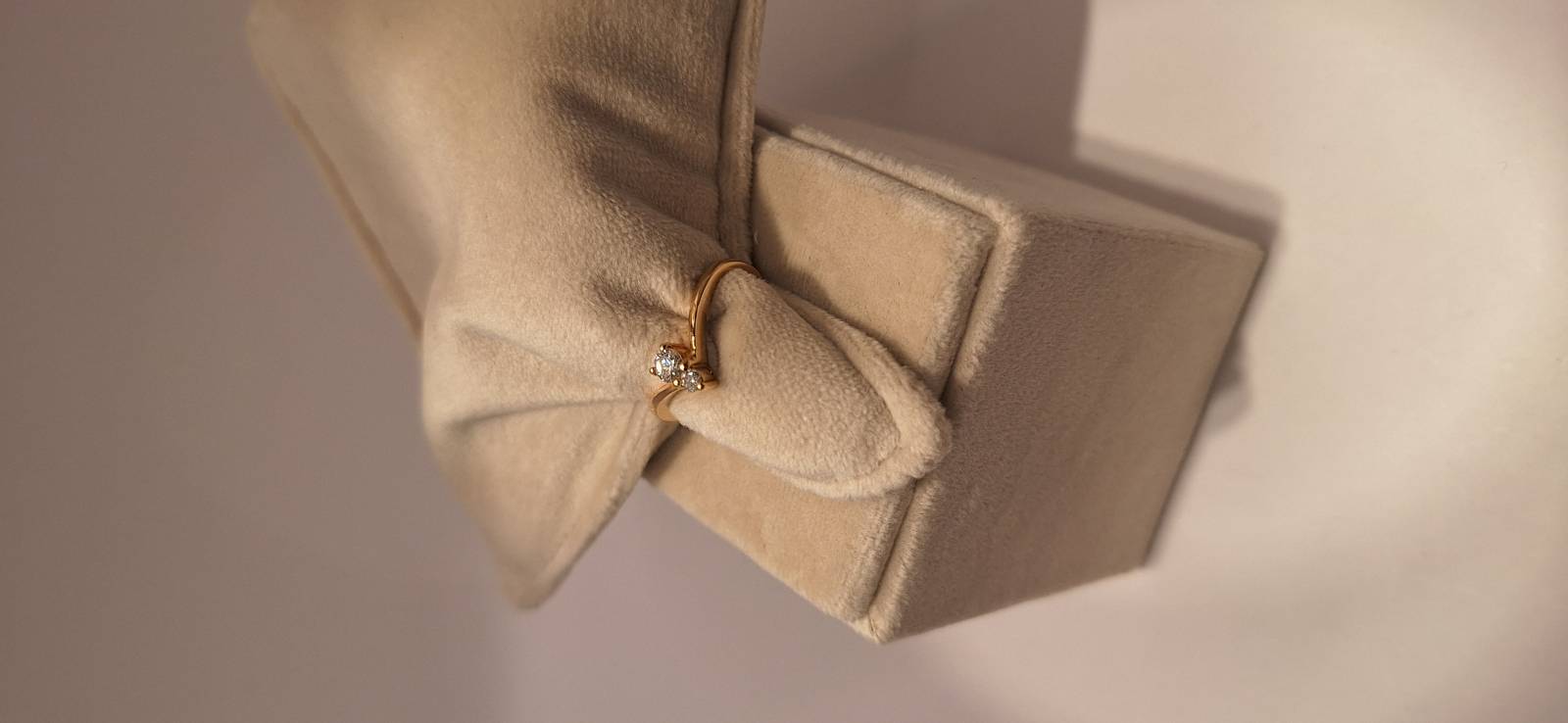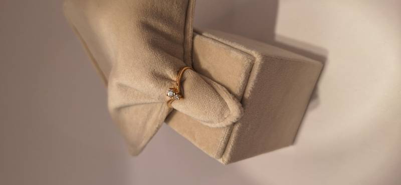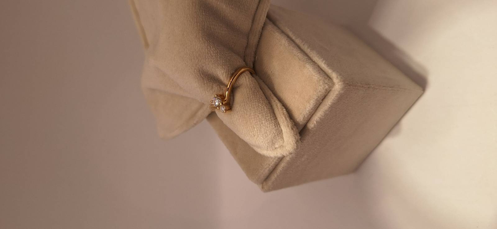 Delizioso anello in oro rosa 18 Kt composto da una sottile fedina che forma al centro un motivo di punta su cui sono incastonati due brillanti di ct 0,06 e ct 0,18, colore G, purezza SI. L'anello raffigurato è misura 15 ma può essere realizzato anche in misure diverse.