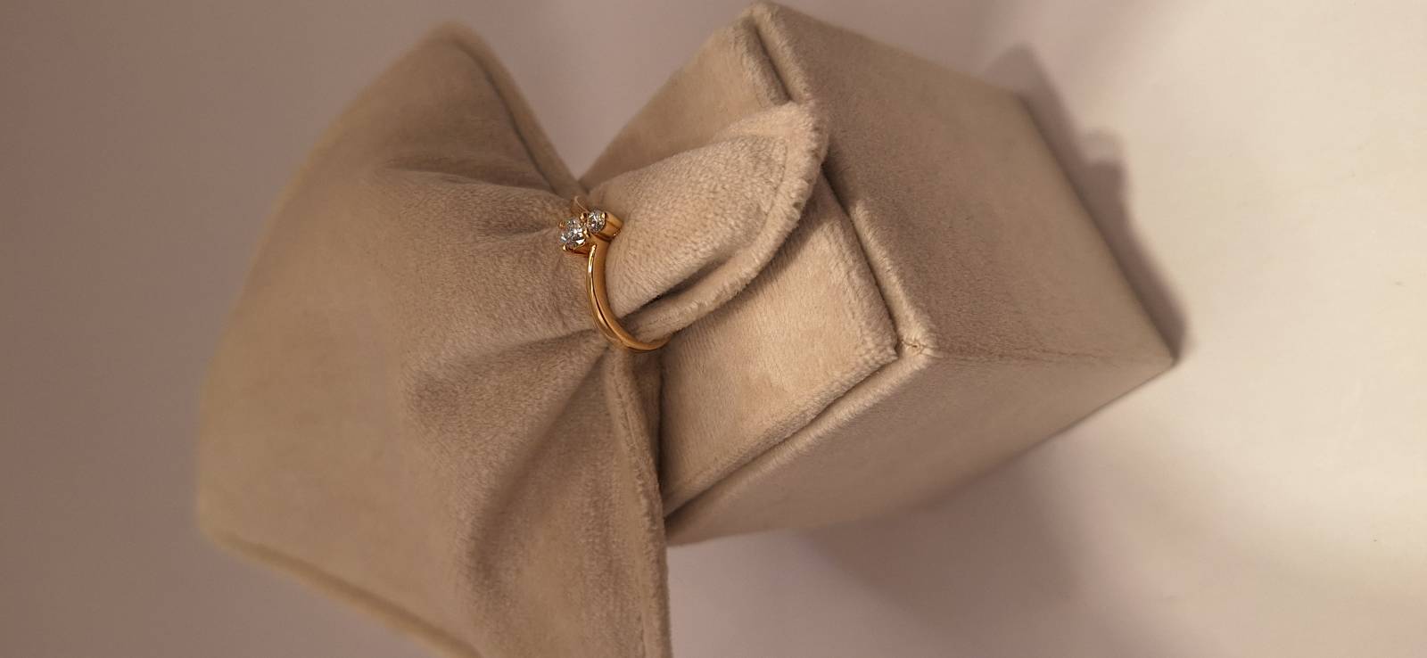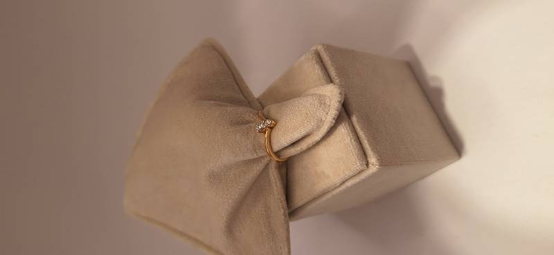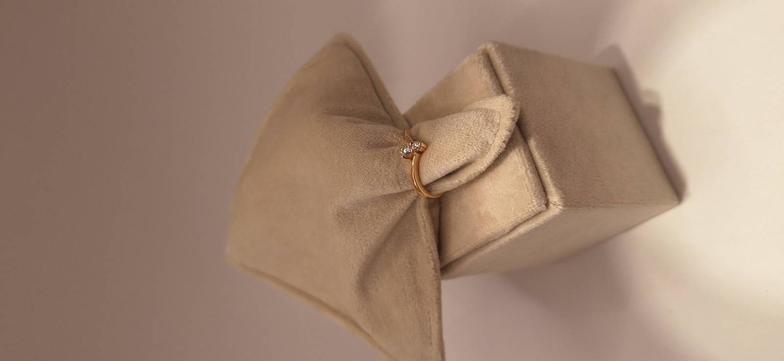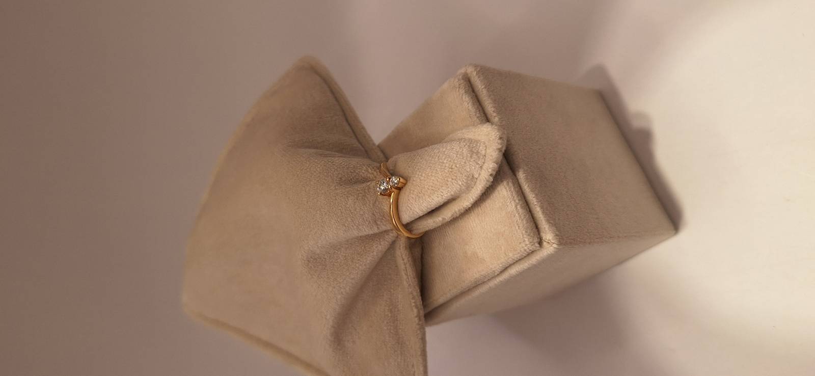 Delizioso anello in oro rosa 18 Kt composto da una sottile fedina che forma al centro un motivo di punta su cui sono incastonati due brillanti di ct 0,06 e ct 0,18, colore G, purezza SI. L'anello raffigurato è misura 15 ma può essere realizzato anche in misure diverse.