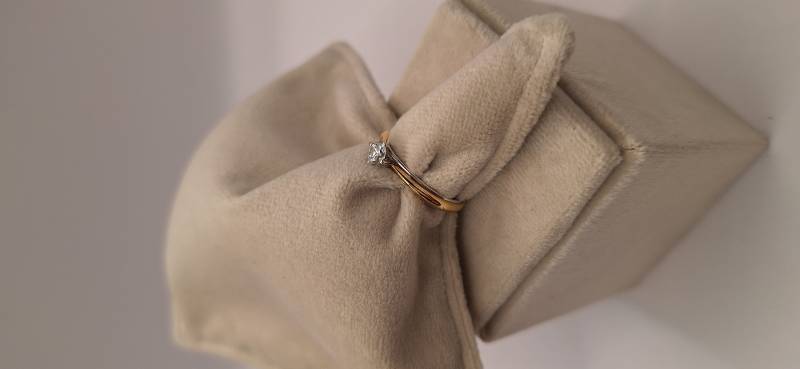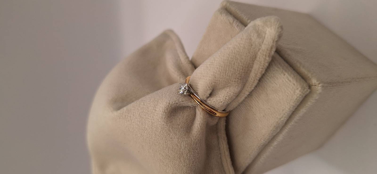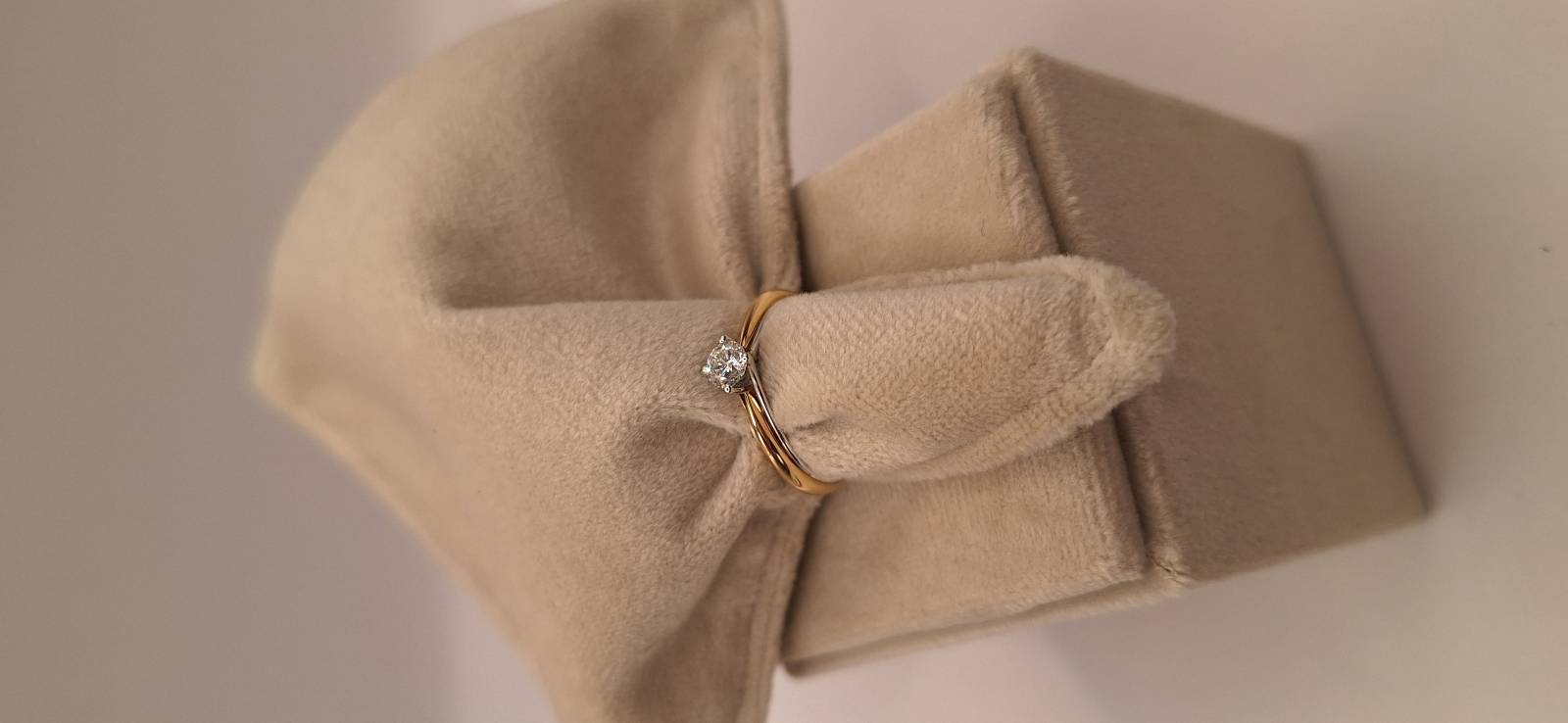 Delizioso solitario in oro 18 Kt composto da una fedina in oro bianco circondata da un filo in oro rosa che sale al centro dell'anello per formare le griffes che trattengono un brillante di ct 0,40, colore F, purezza VS. L'anello rappresentato è misura 11 (o 51) ma può essere realizzato anche in misure diverse. L,anello viene fornito con garanzia di originalità Giorgio Visconti e di assicurazione contro i furti valida per un anno dopo l'acquisto.