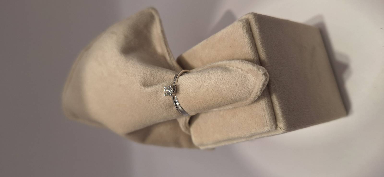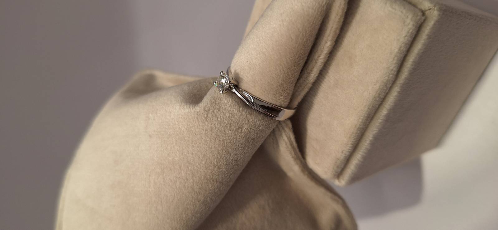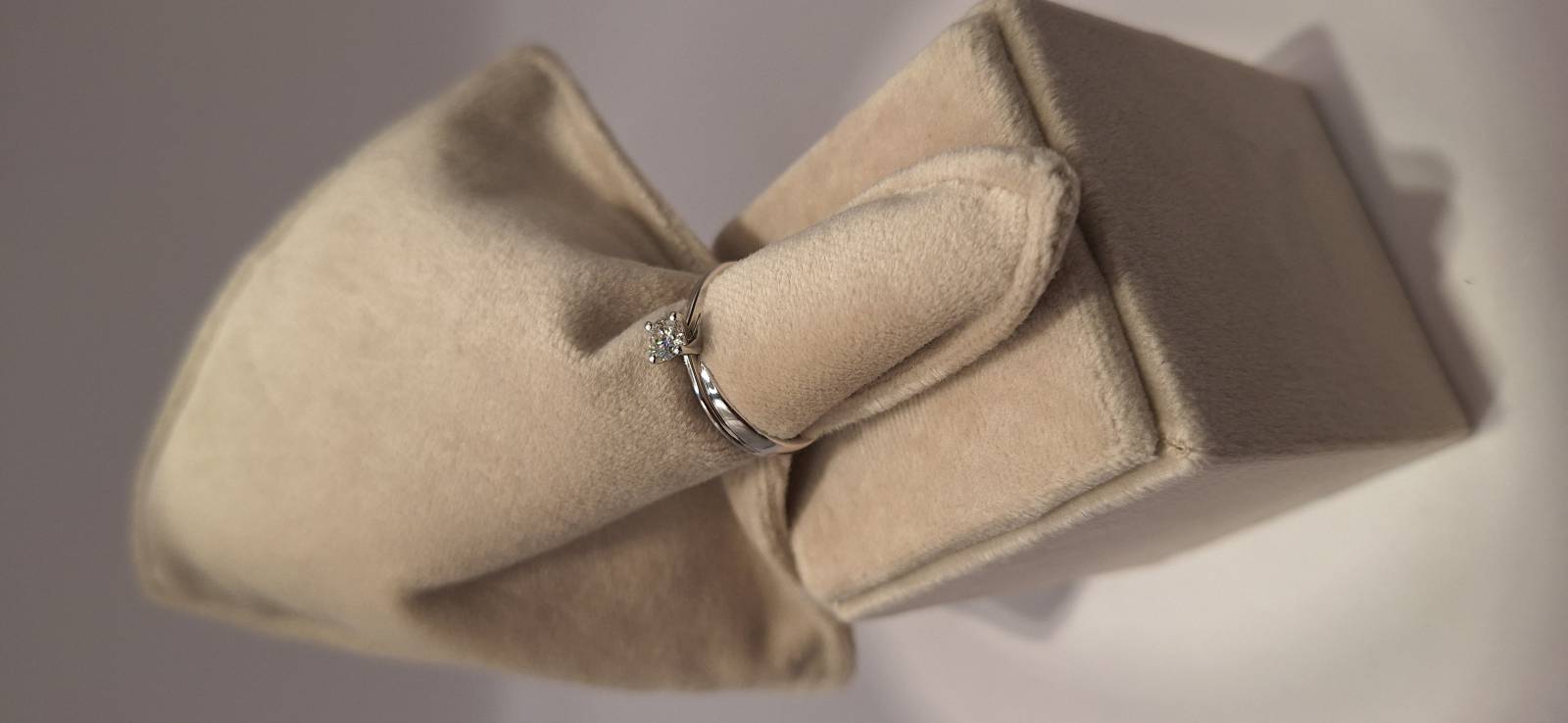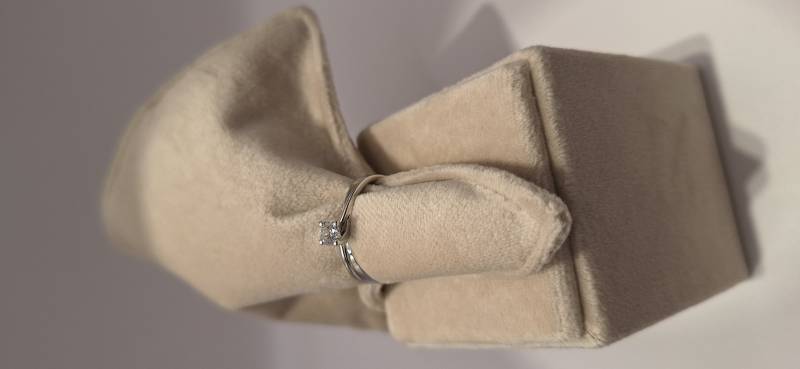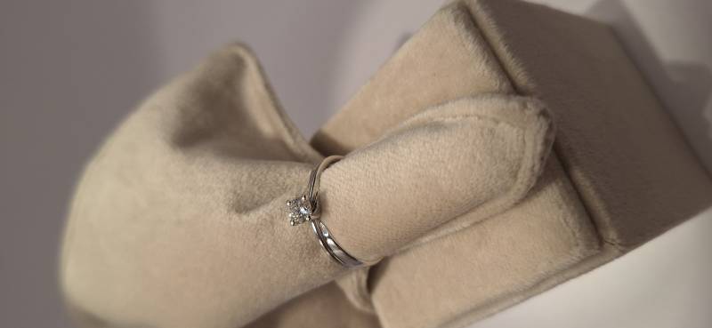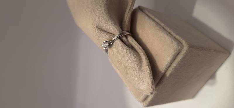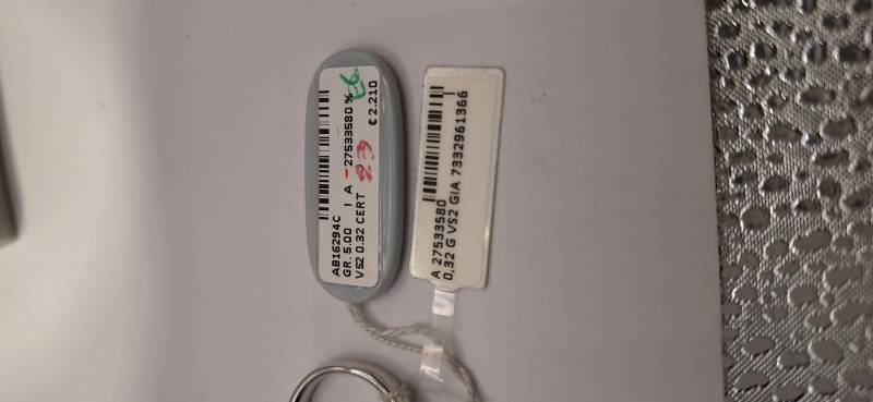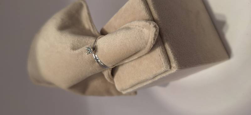 Delizioso anello in oro bianco 18 Kt composto da una sottile fedina con al centro un castone a quattro griffes che trattengono un solitario di ct 0,32 colore G, purezza VS2 certificato GIA. L'anello raffigurato è misura 15 ma può essere realizzato anche in misure diverse. L'anello è accompagnato da garanzia di originalità Giorgio Visconti oltre che da certificato di assicurazione contro i furti valido un anno dall'acquisto e dal certificato gemmologico GIA.