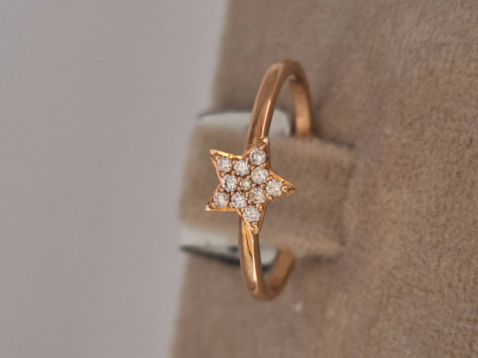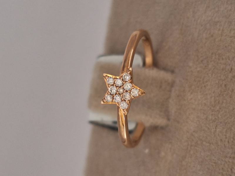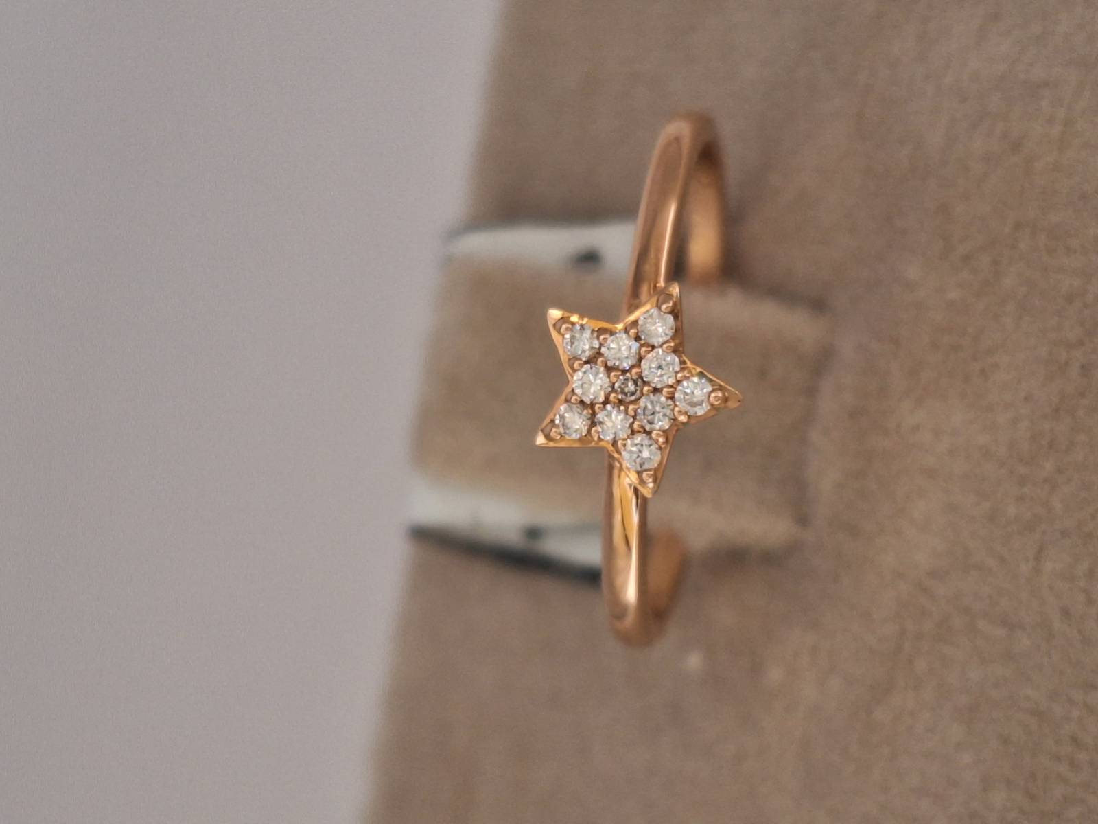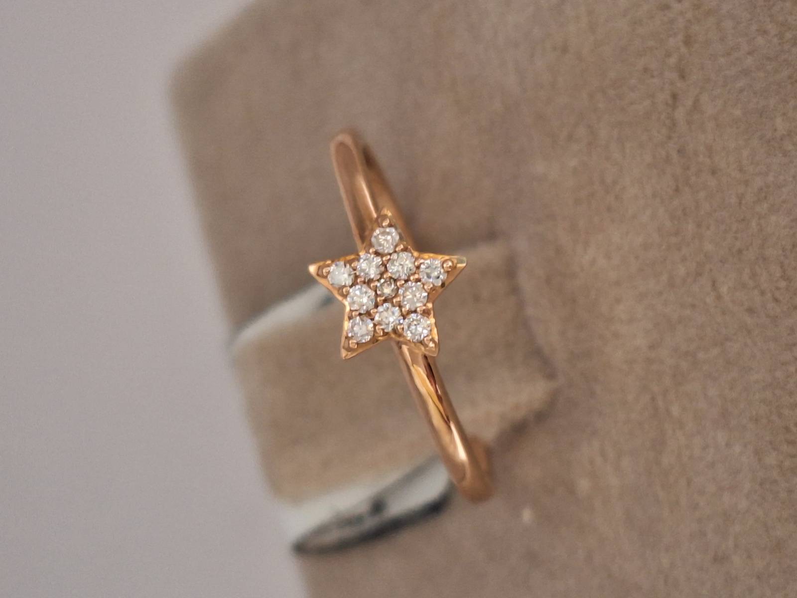 Delizioso anello in oro rosa 18 Kt composto da una sottile fedina con al centro una stellina tempestata di diamanti per un totale di ct 0,09. La foto rappresenta un anello misura 12 (o 52 misura internazionale) ma è disponibile anche in altre dimensioni su richiesta.
