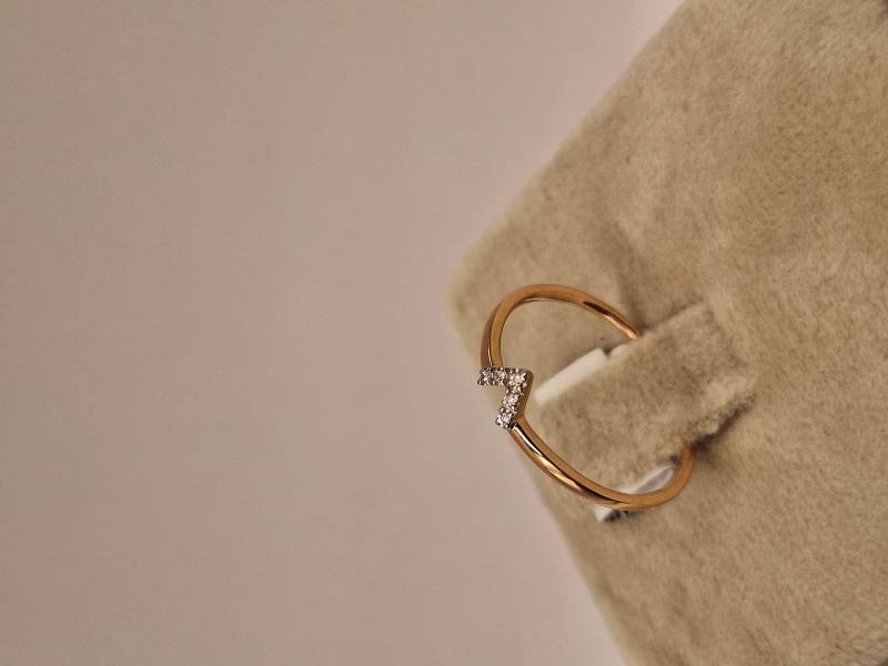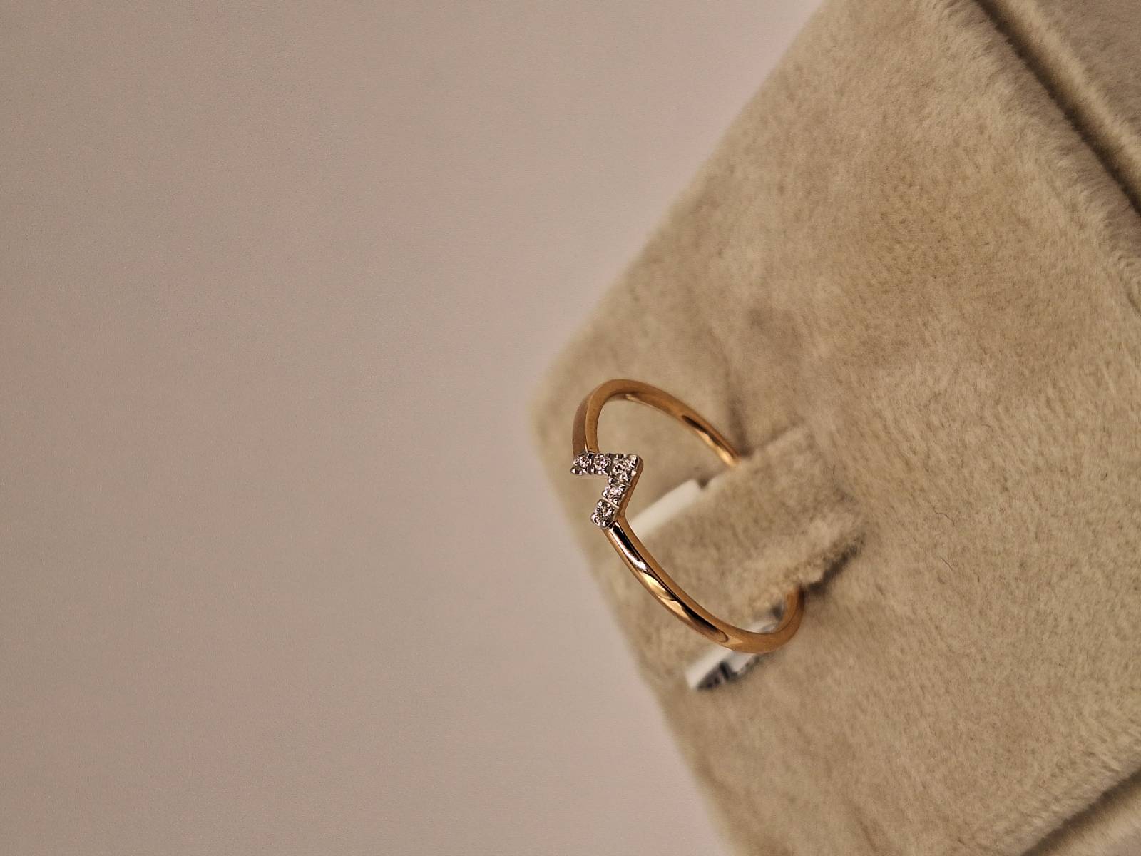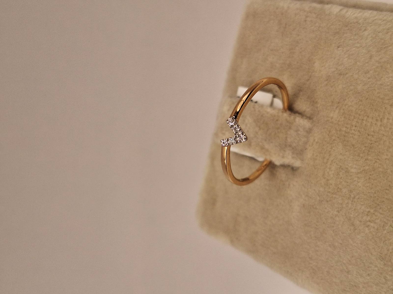 Delizioso anello in oro giallo 18 Kt composto da una sottile fedina con al centro un motivo grafico tempestato di diamanti (per ct 0,02). La foto rappresenta un anello misura 13 (o 53 misura internazionale) ma è disponibile anche in altre dimensioni su richiesta. Ben si adatta ad essere indossato con gli altri anelli della stessa linea realizzati in oro bianco e in oro rosa
