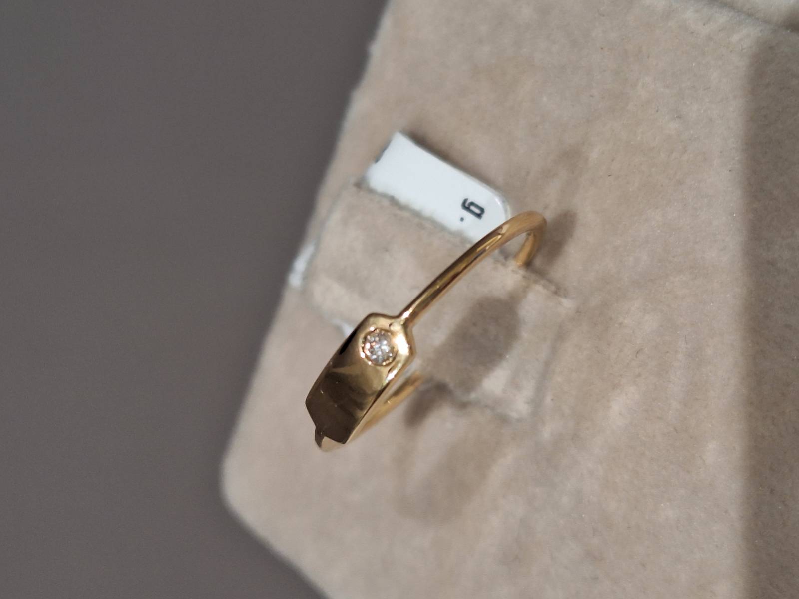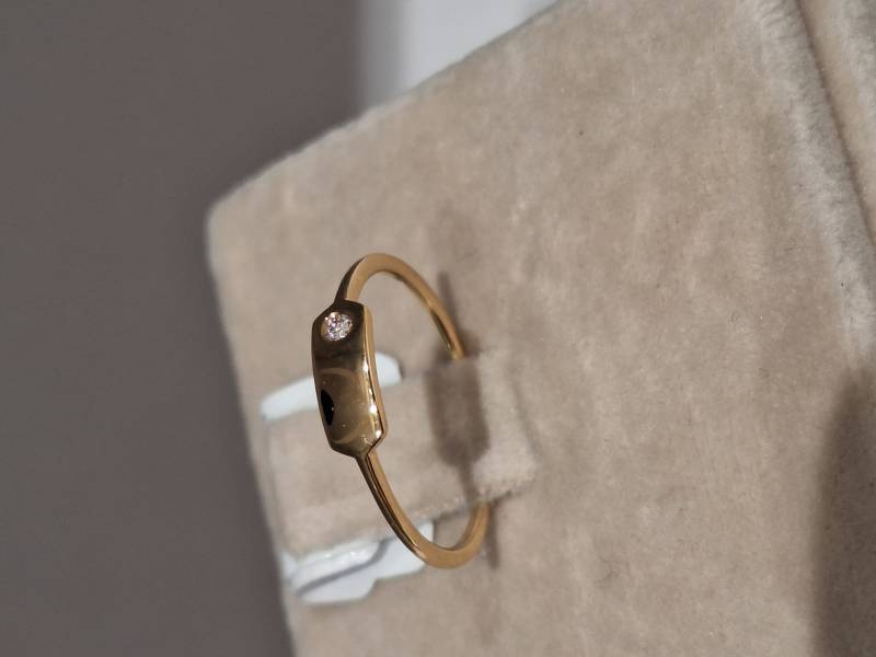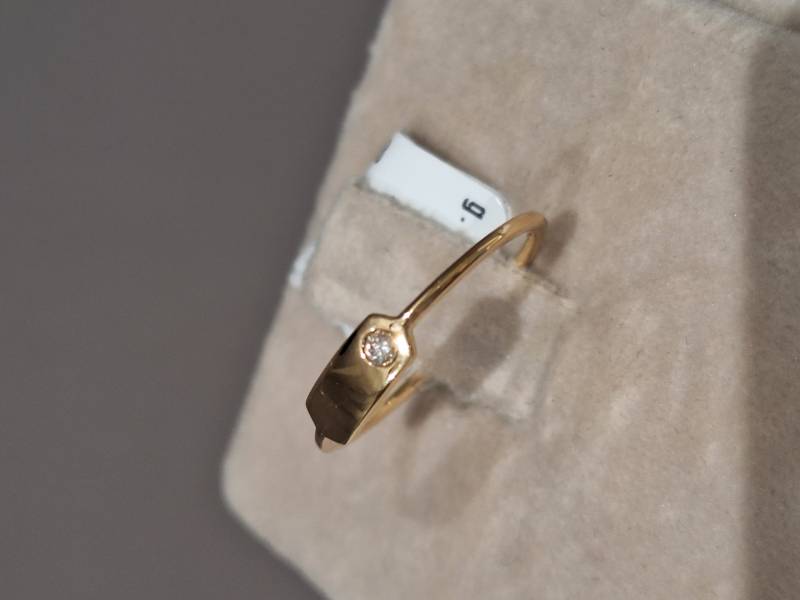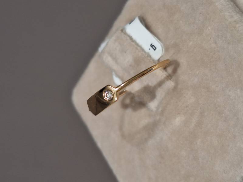 Delizioso anello in oro giallo 18 Kt composto da una sottile fedina con al centro una piastrina con incassato un brillante di ct 0,03. La foto rappresenta un anello misura 13 (o 53 misura internazionale) ma è disponibile anche in altre dimensioni su richiesta. Ben si adatta ad essere indossato con gli altri anelli della stessa linea realizzati in oro bianco e in oro rosa