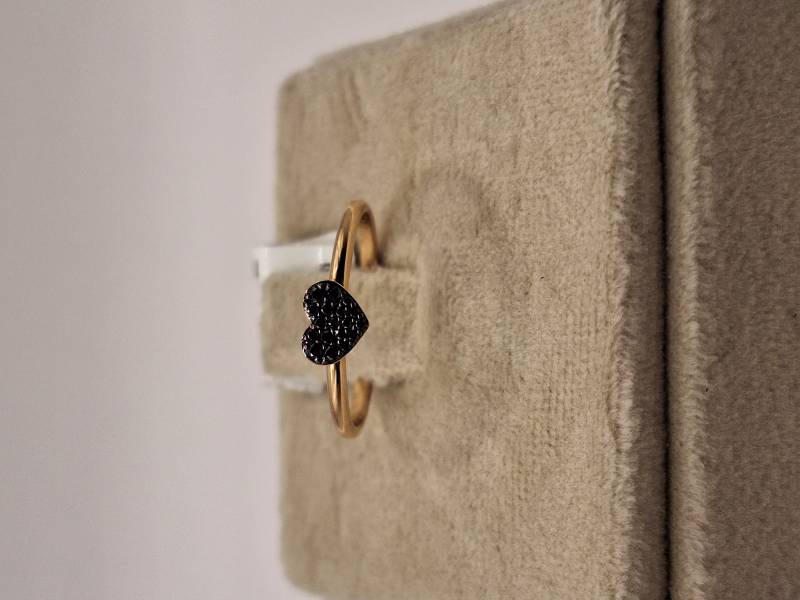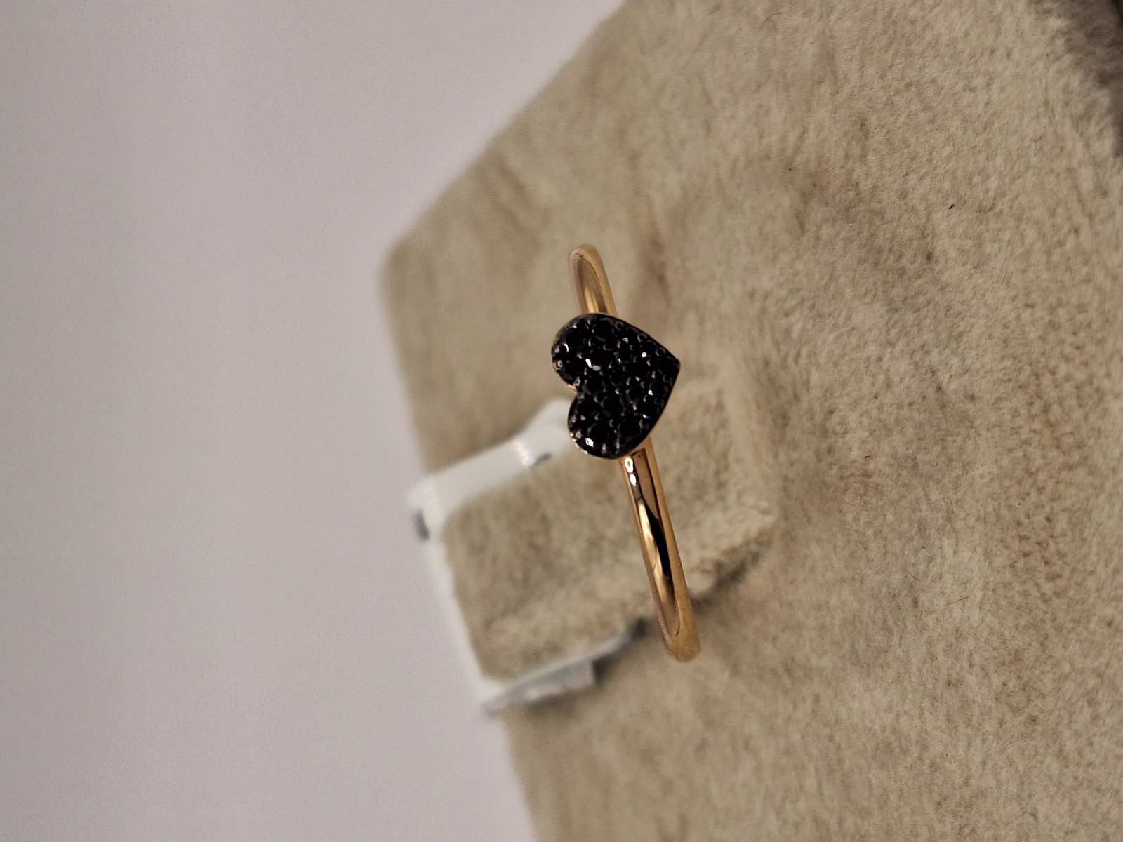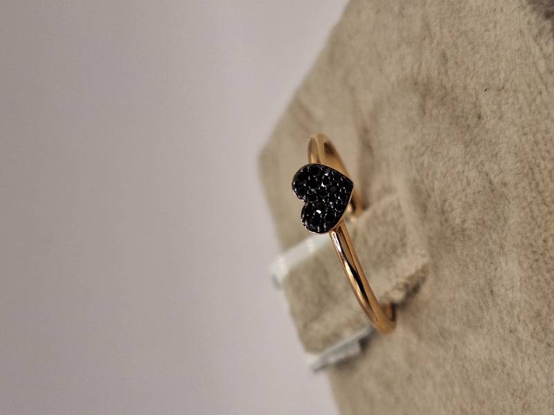 Delizioso anello in oro rosa 18 Kt composto da una sottile fedina con al centro un cuore tempestato di brillanti neri per un torale di ct 0,08. La foto rappresenta un anello misura 12 (o 52 misura internazionale) ma è disponibile anche in altre dimensioni su richiesta.