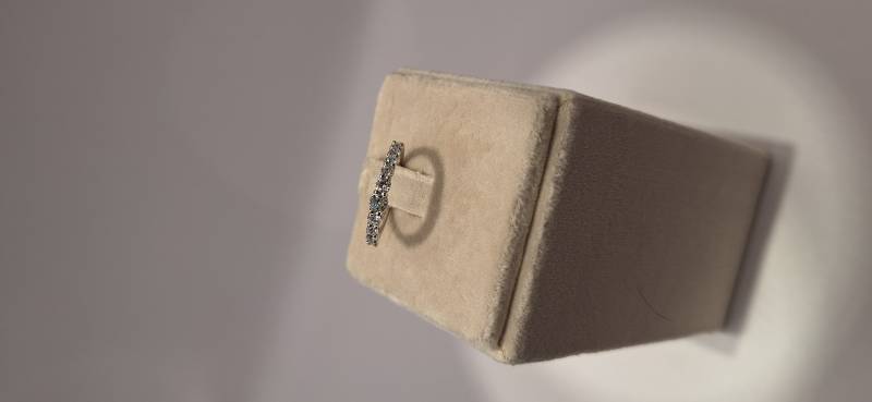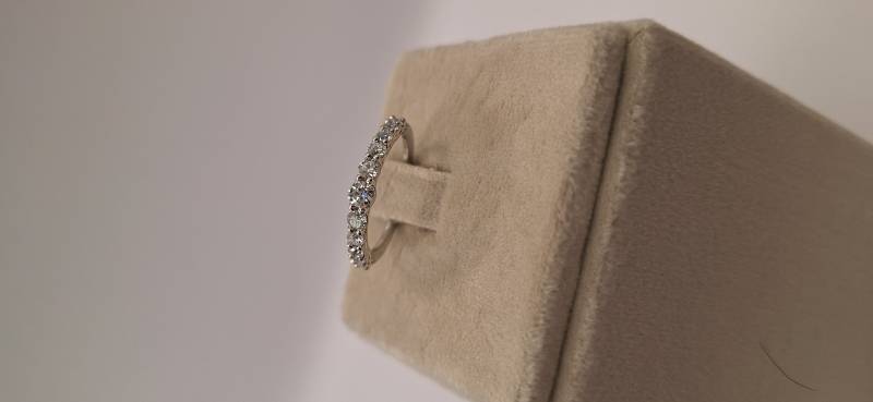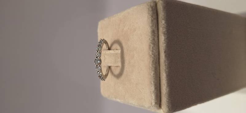 Deliziosa fedina in oro rosa 18 Kt con 17 brillanti di grandezza a scalare montati su griffes per un totale di ct 0,40 colore F- G, purezza VS. L'anello fotografato è misura 14 (o 54) ma puo' essere realizzato anche in misure diverse.