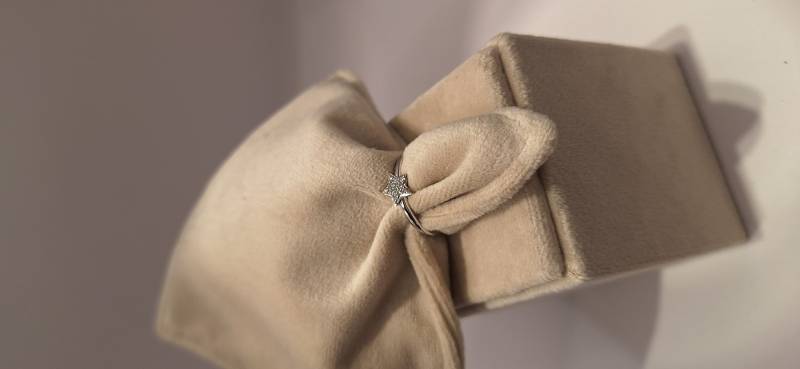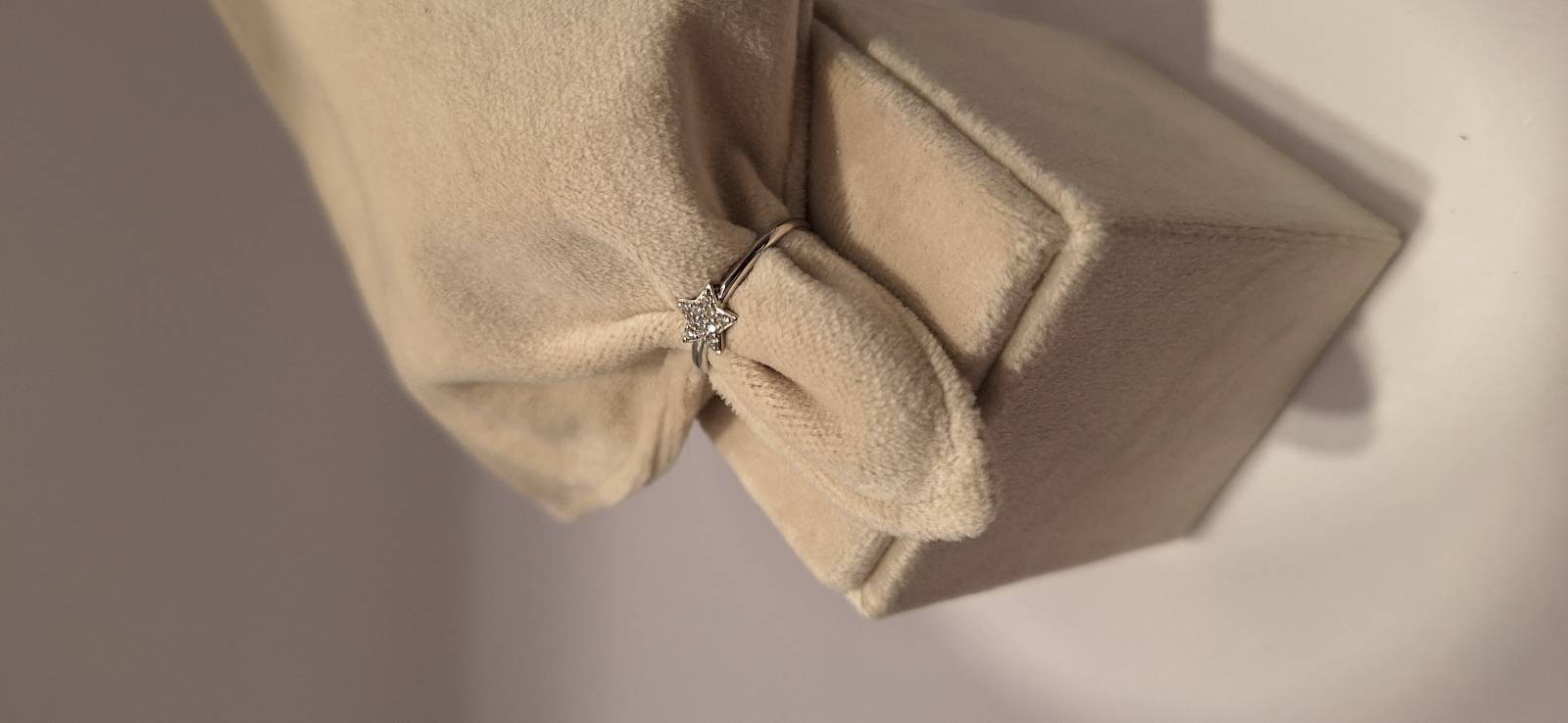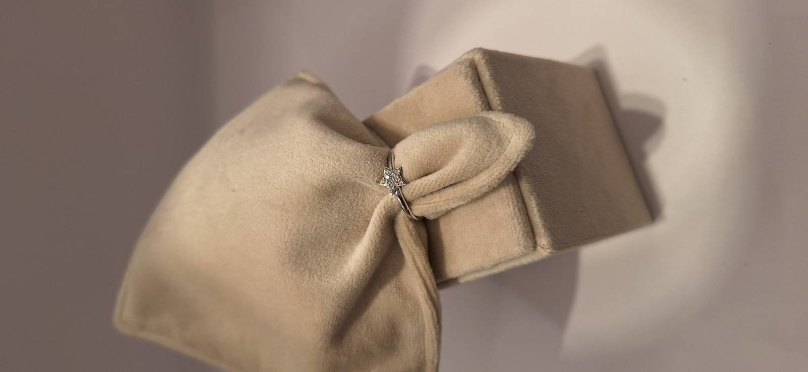 Delizioso anello in oro bianco 18 Kt composto da una sottile fedina con al centro una stella tempestata di brillanti per un totale di ct 0,09. La foto rappresenta un anello misura 12 (o 52 misura internazionale) ma è disponibile anche in altre dimensioni su richiesta.