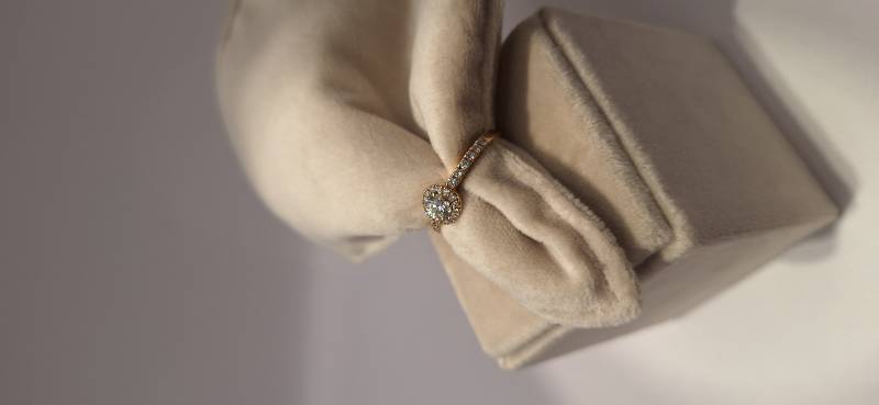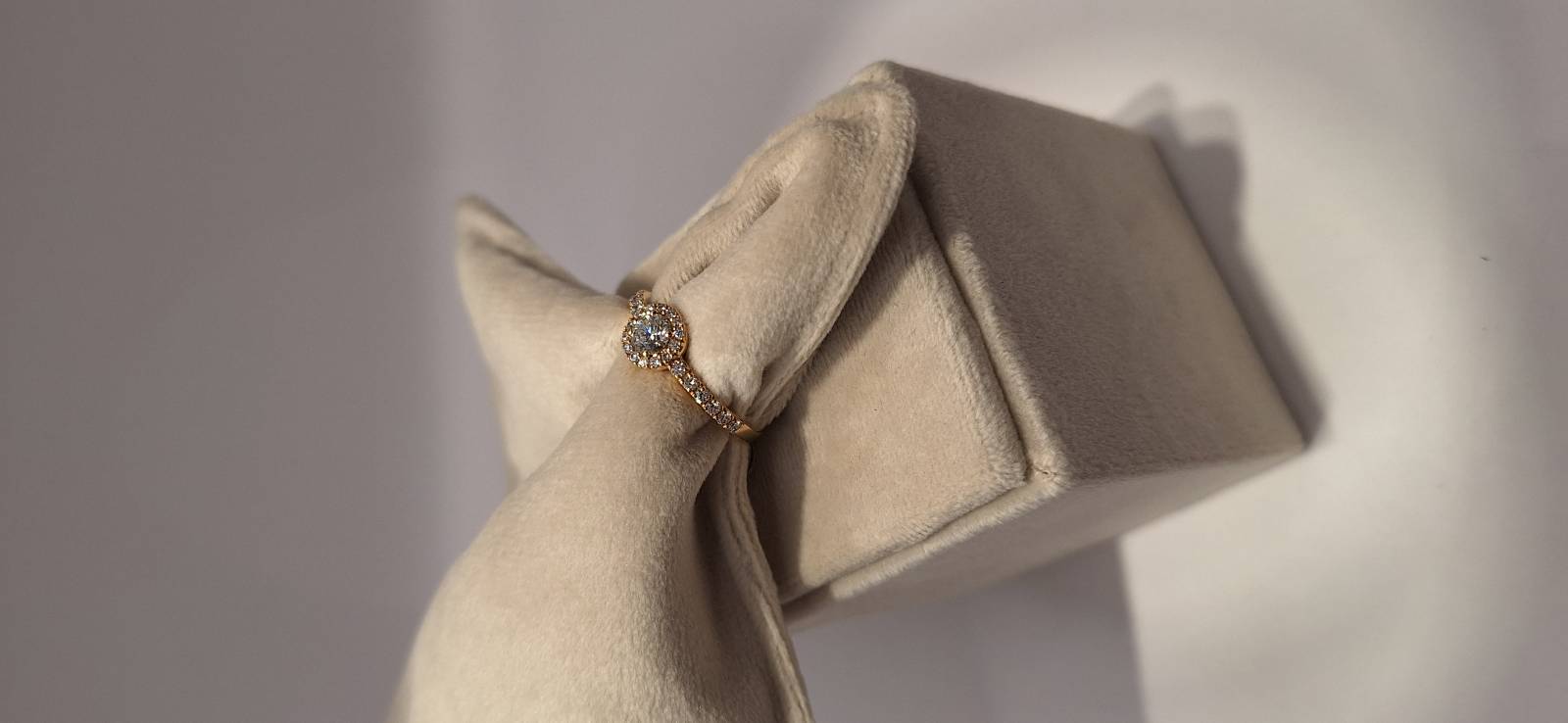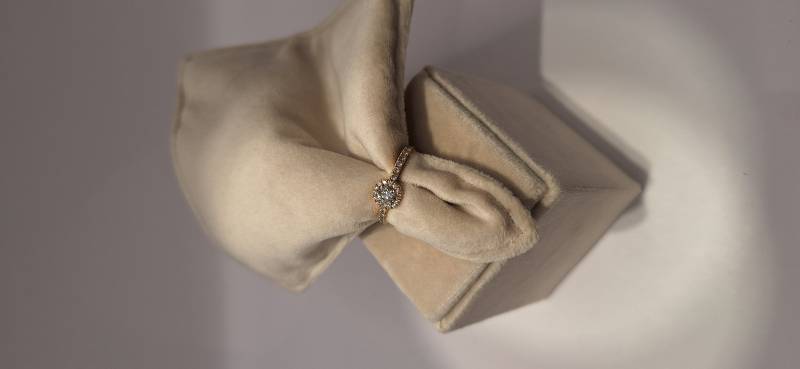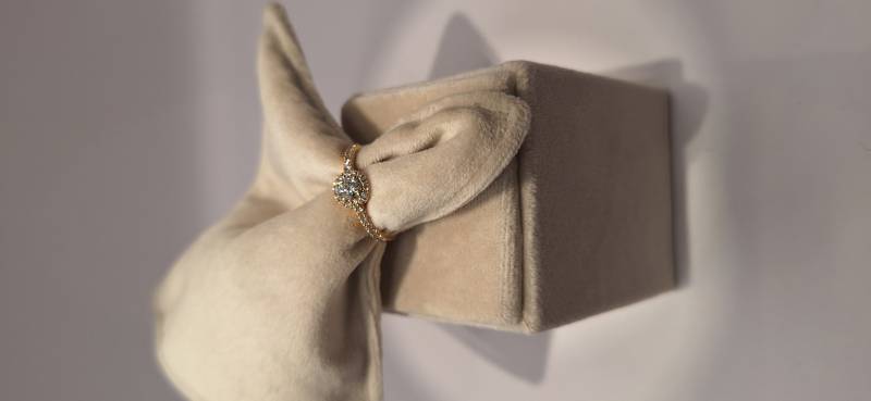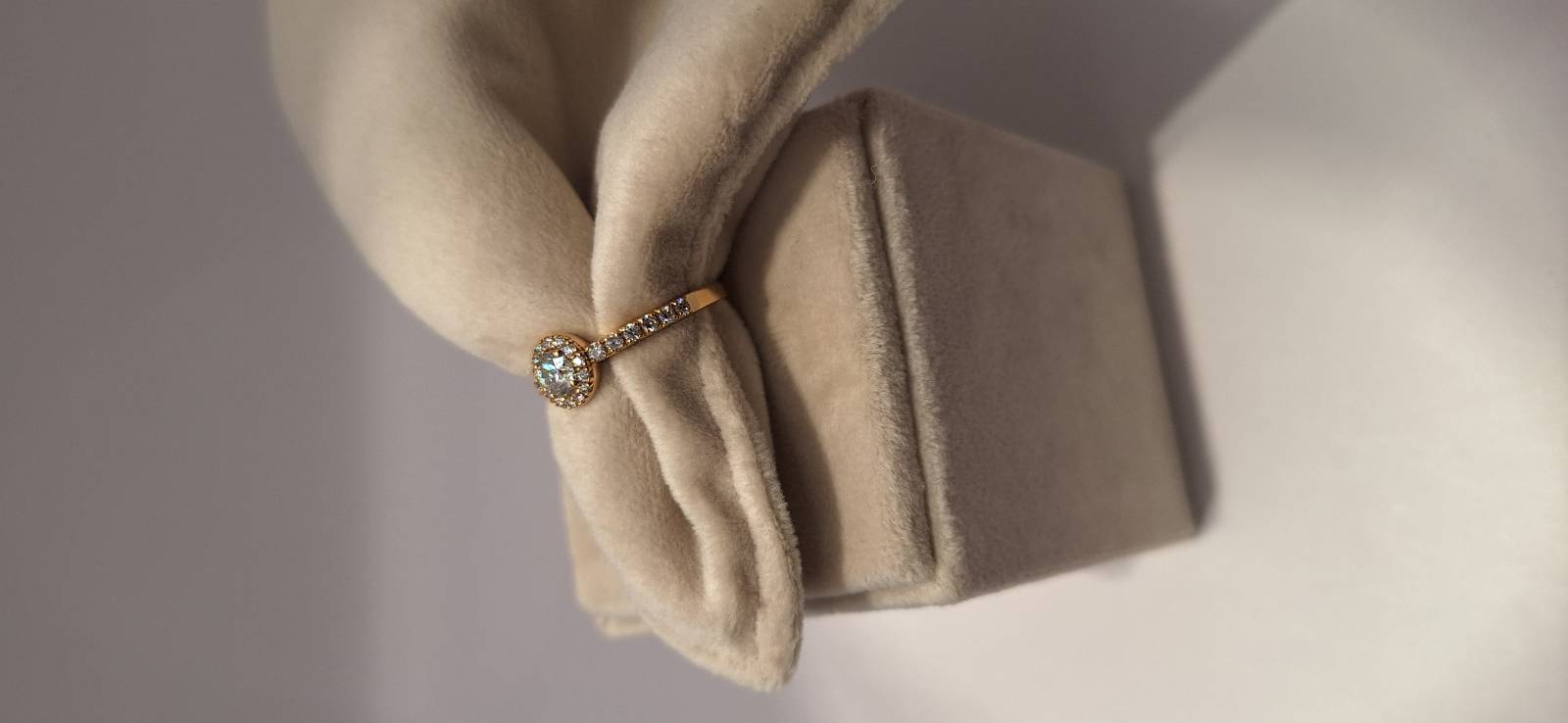 Delizioso anello in oro rosa 18 Kt composto da un motivo centrale con incassato un unico diamante taglio tondo di ct 0,37 colore G, purezza SI, circondato da brillanti che proseguono sul gambo per un totale di ct 0,32. L'anello raffigurato è misura 13 (o 53) ma può essere realizzato anche in misure diverse a seconda delle richieste.