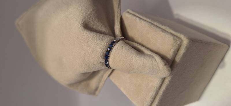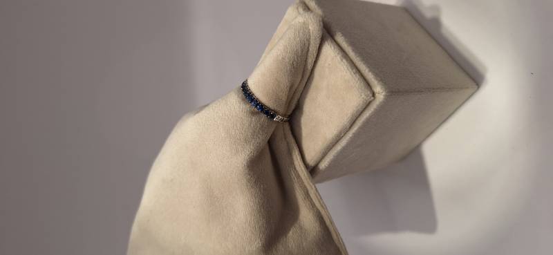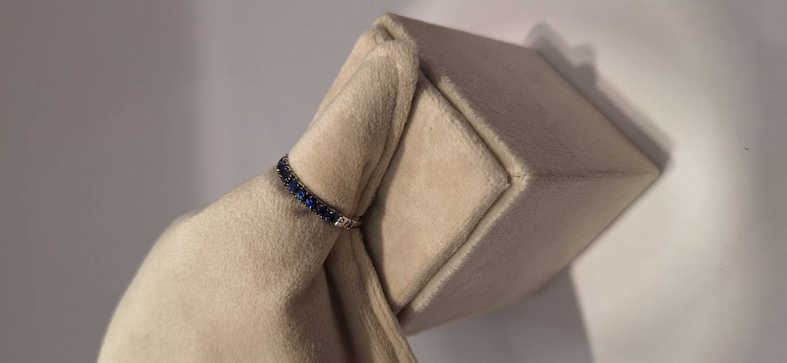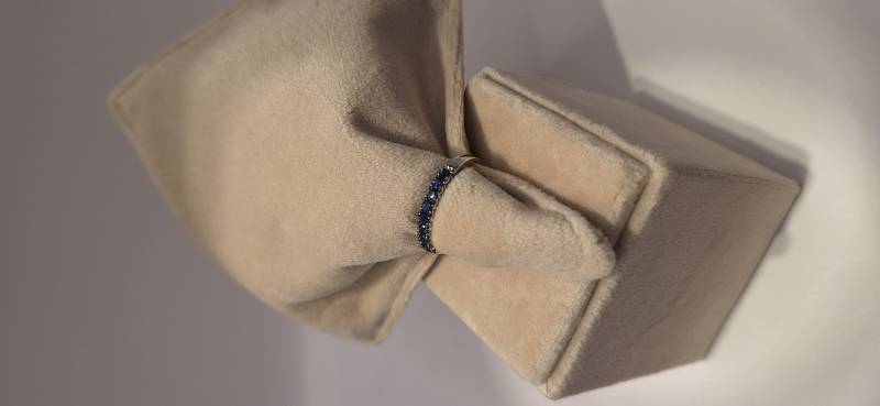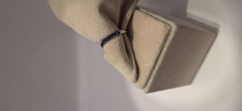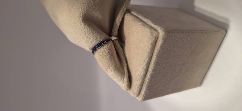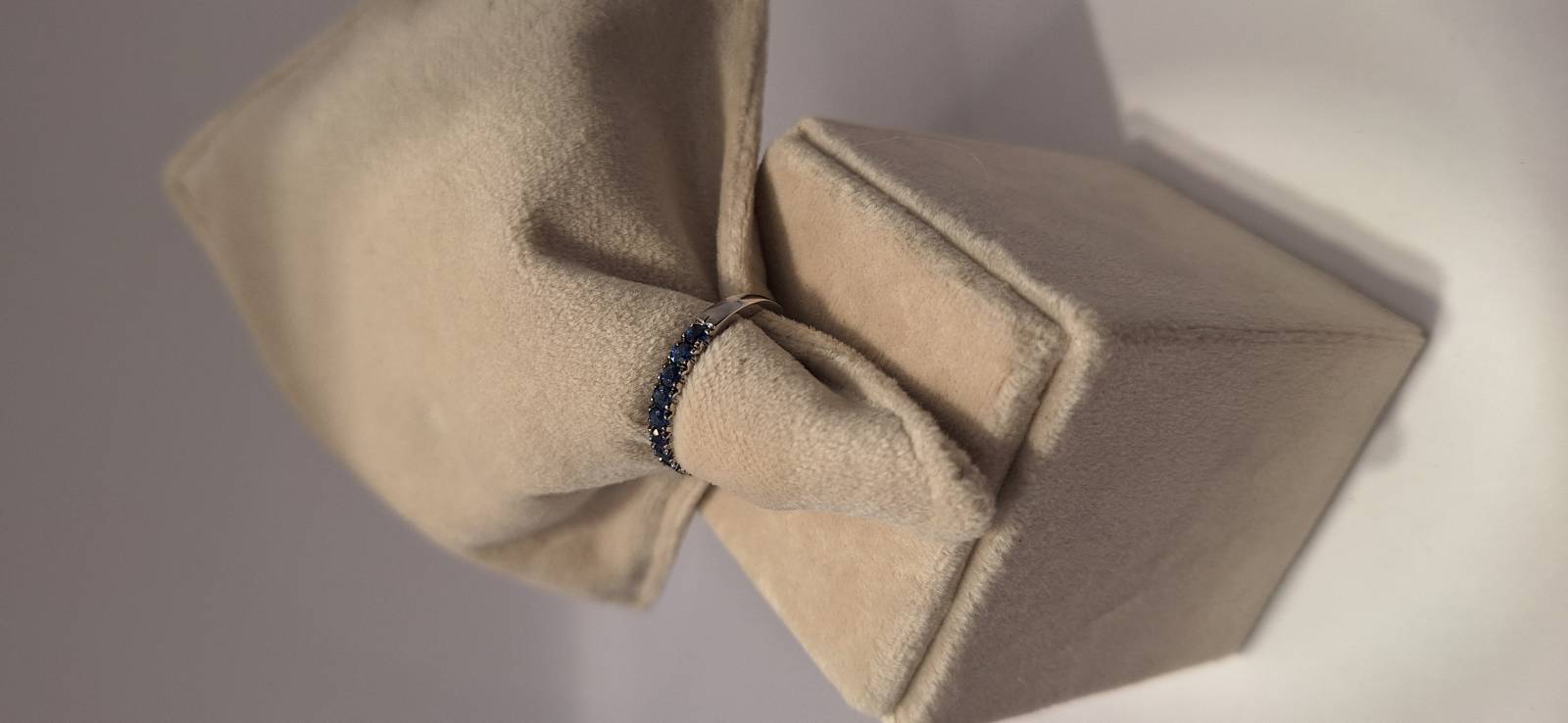 Deliziosa fedina in oro bianco 18 Kt con nove zaffiri montati su griffes per un totale di ct 0,60. L'anello fotografato è misura 13 (o 53) ma puo' essere realizzato su richiesta anche in misure diverse.