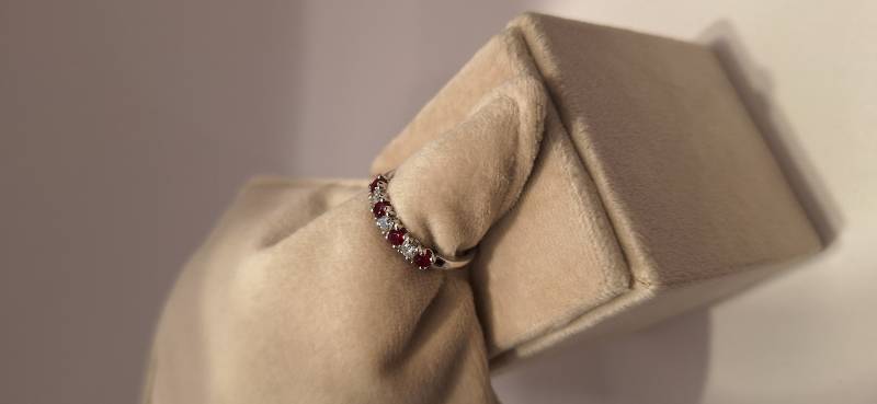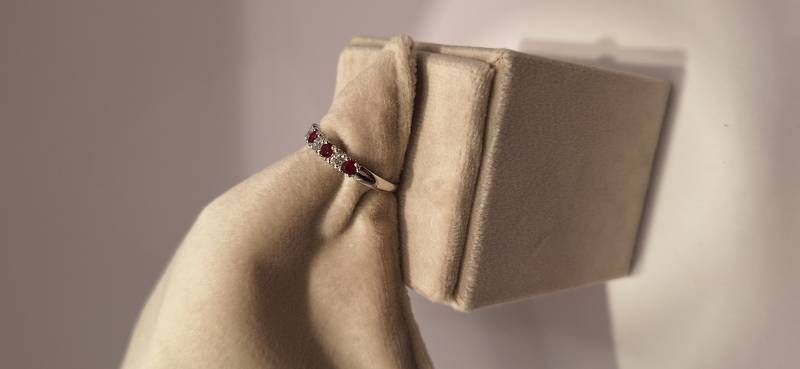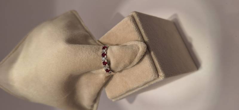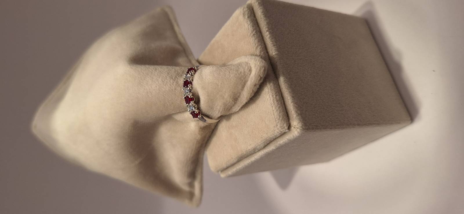 Deliziosa fedina in oro bianco 18 Kt con quattro rubini montati su griffes per un totale di ct 0,39 intervallati da brillanti per ct 0,22, colore G, purezza VS. L'anello fotografato è misura 15 (o 55) ma puo' essere realizzato su richiesta anche in misure diverse.