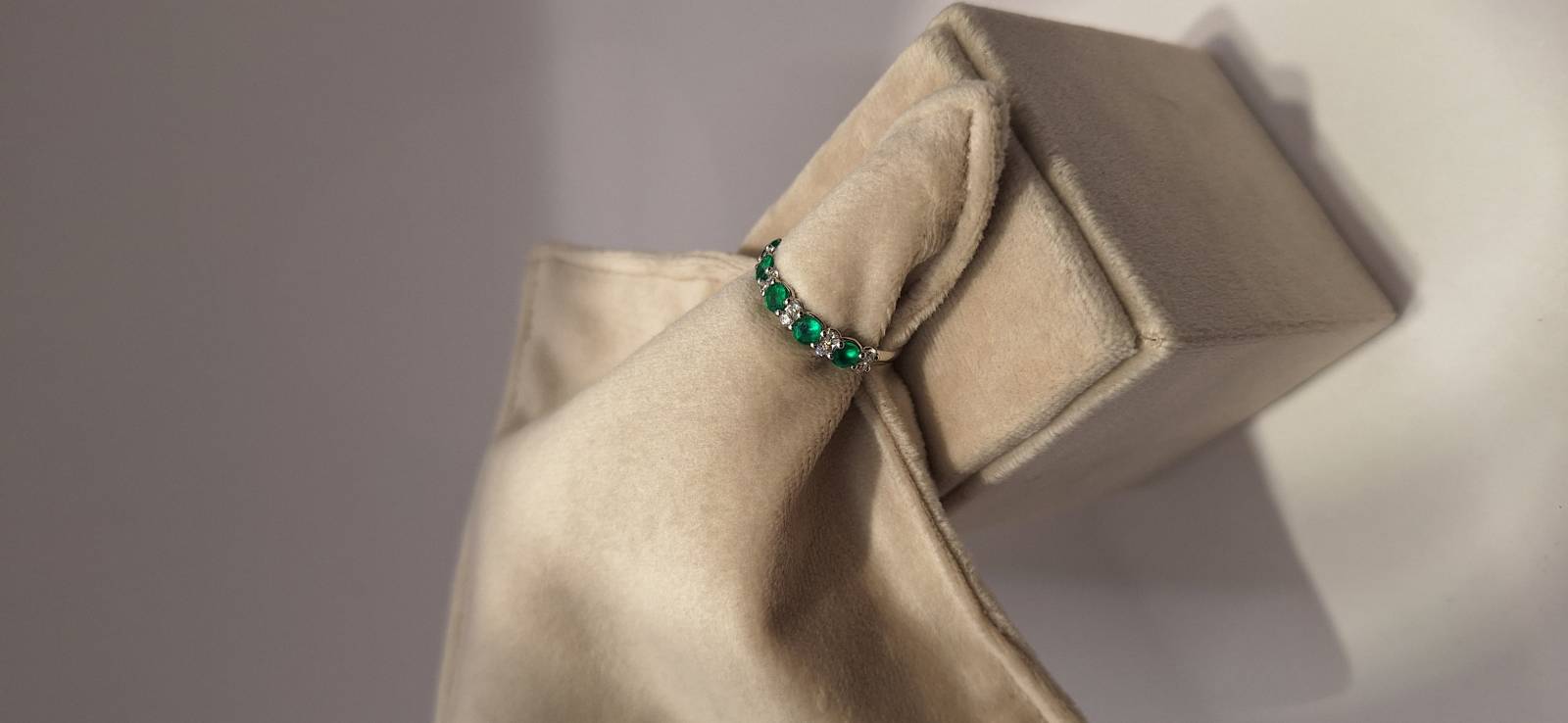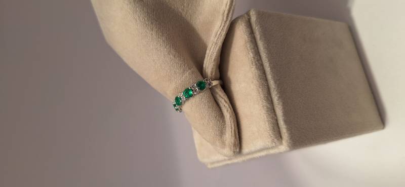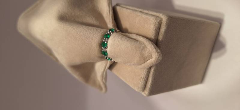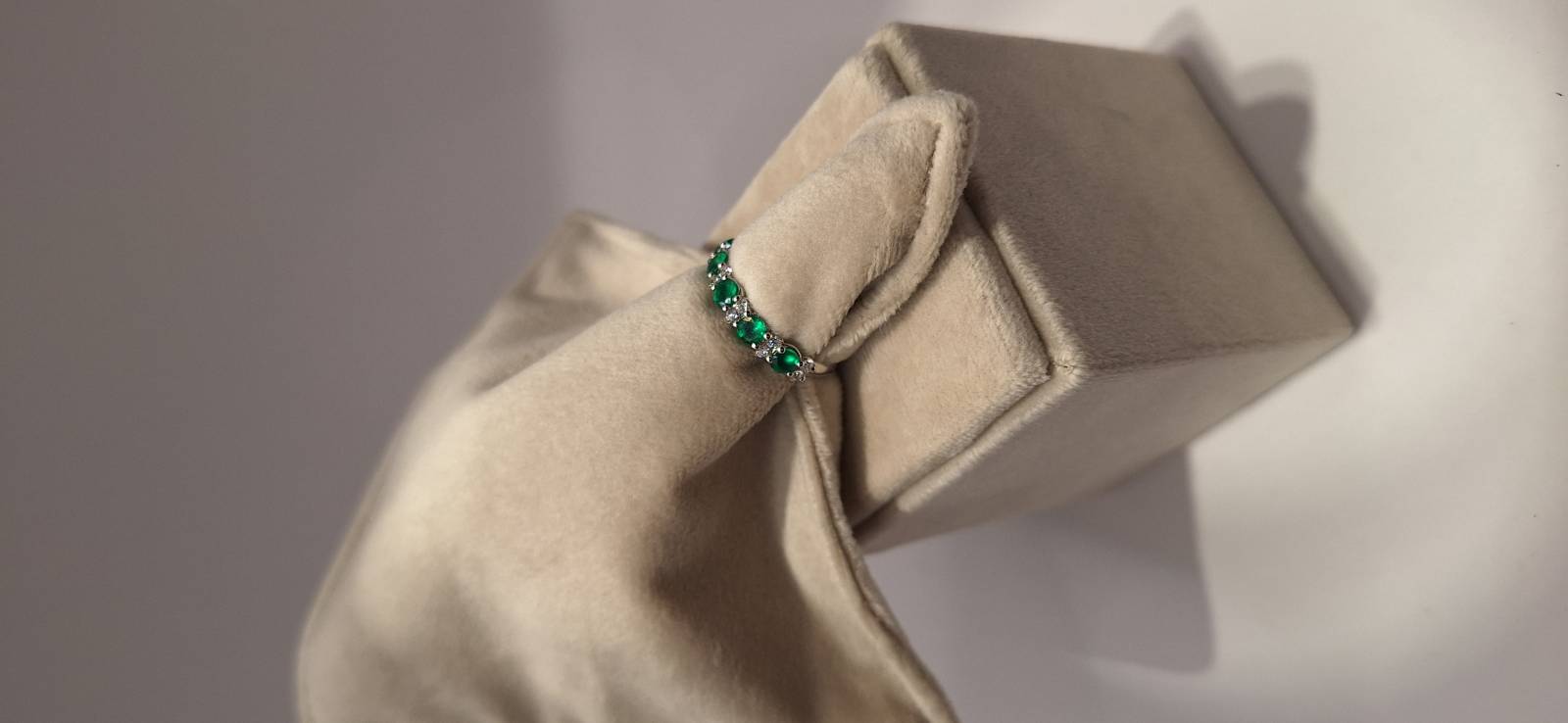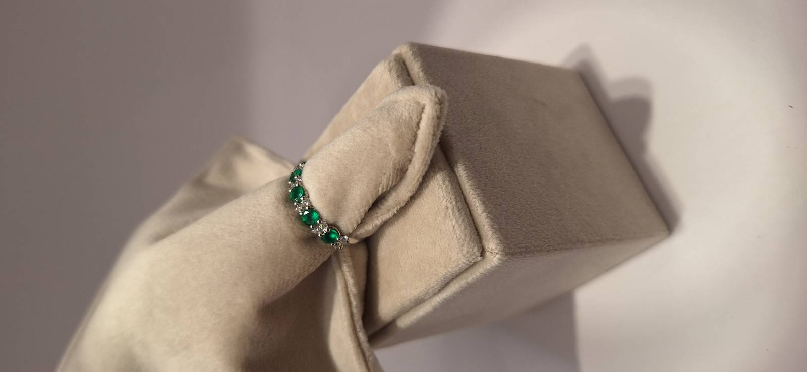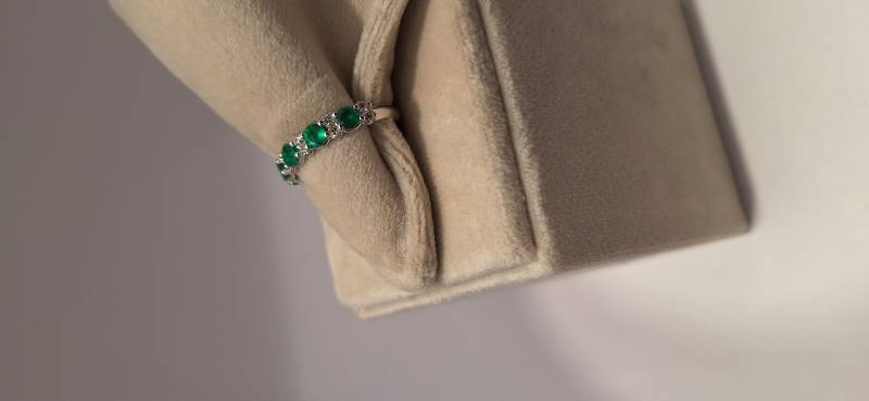 Deliziosa fedina in oro bianco 18 Kt con cinque smeraldi taglio tondo montati su griffes per un totale di ct 0,80 intervallati da brillanti per ct 0,40, colore G, purezza SI. L'anello fotografato è misura 13 (o 53) ma puo' essere realizzato su richiesta anche in misure diverse.