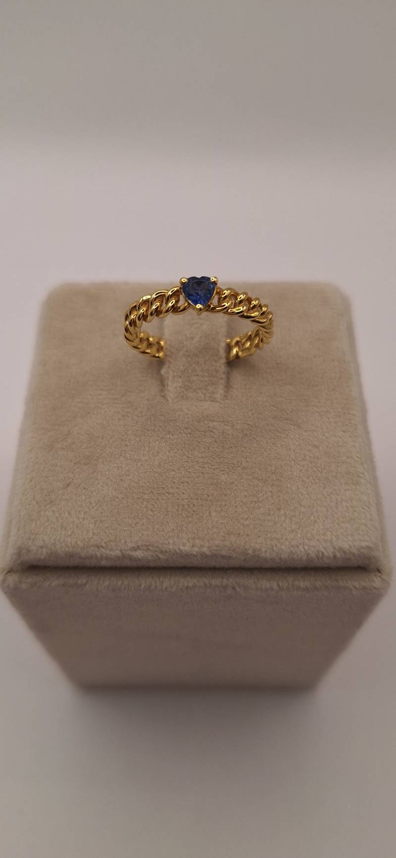 Delizioso anello in oro giallo 18 KT composto da una catena rigida con al centro uno zaffiro blu di ct 0,31 tagliato a cuore. L'anello fotografato è misura 13 (o 53) ma può essere realizzato anche in misure diverse.