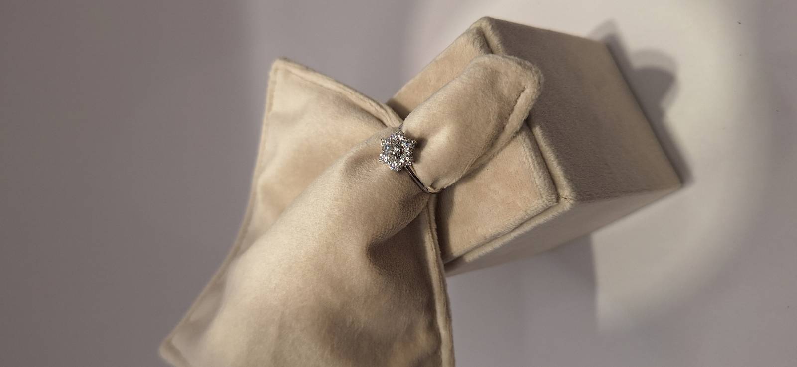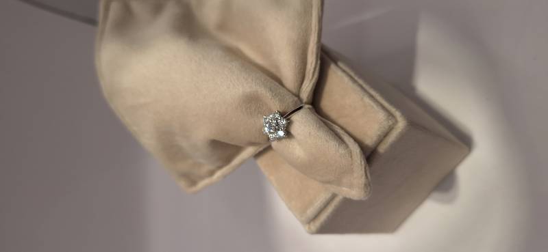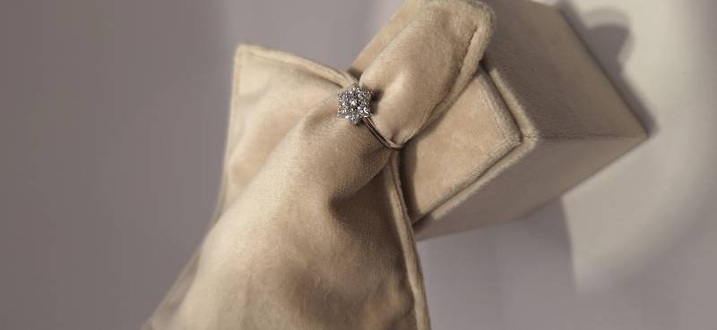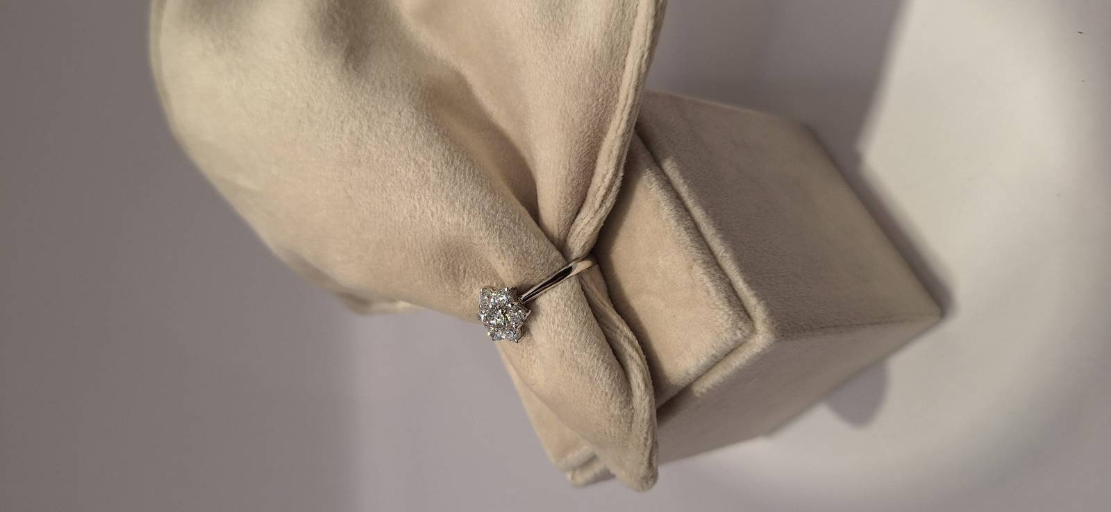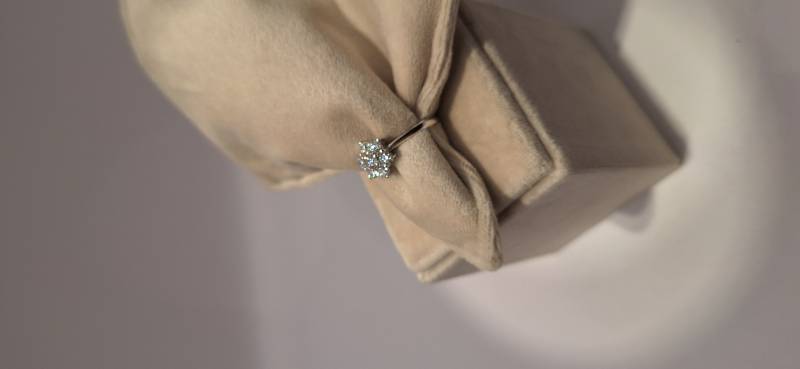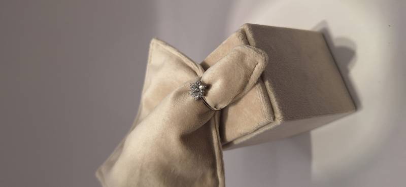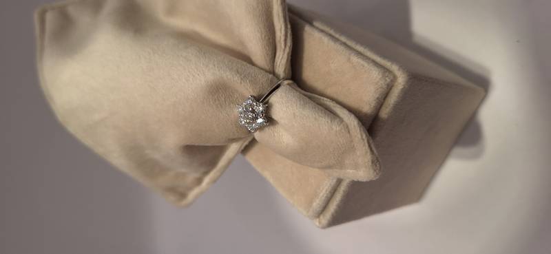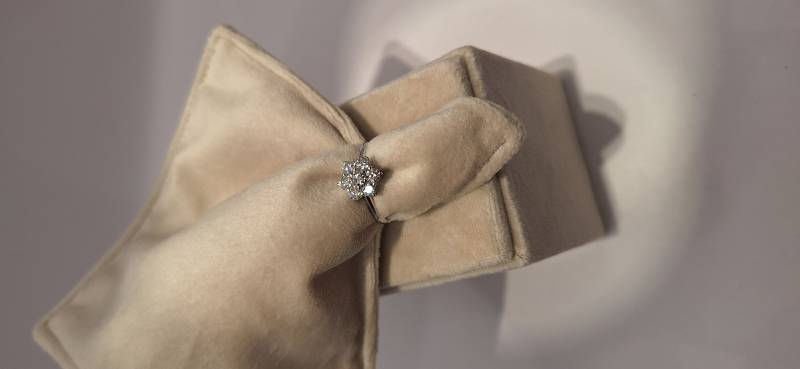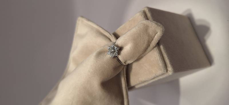 Delizioso anello in oro bianco 18 Kt composto da una sottile fedina con al centro una rosellina con brillanti incassati su griffes per una caratura di ct 0, 21(brillante centrale) e ct 0,66 il contorno. I brillanti sono colore G e purezza SI. L'anello raffigurato è misura 13 ma può essere realizzato anche in misure diverse.