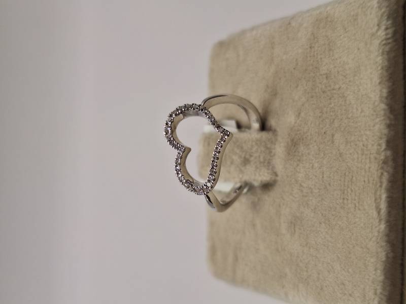 Delizioso anello in oro bianco 18 Kt composto da una sottile fedina con al centro un cuore tempestato di brillanti per un totale di ct 0,19. La foto rappresenta un anello misura 13 (o 53 misura internazionale) ma è disponibile anche in altre dimensioni su richiesta.