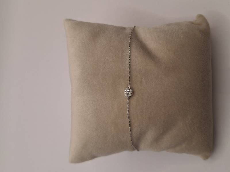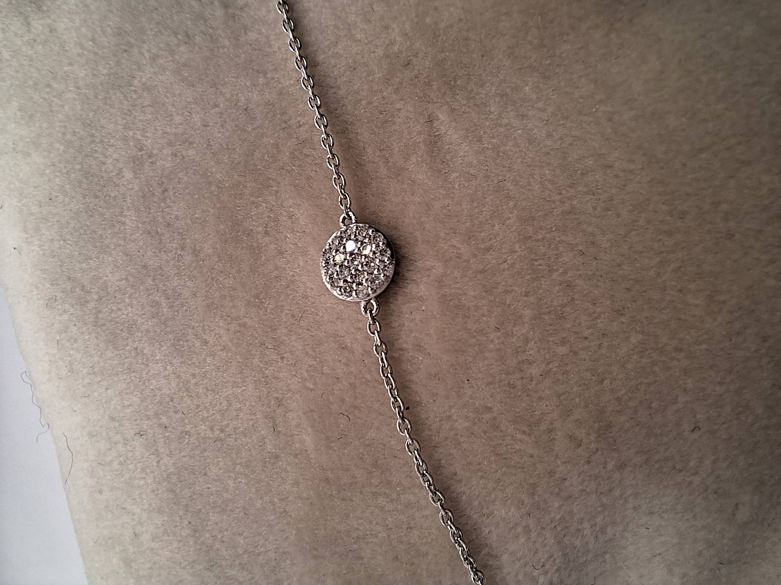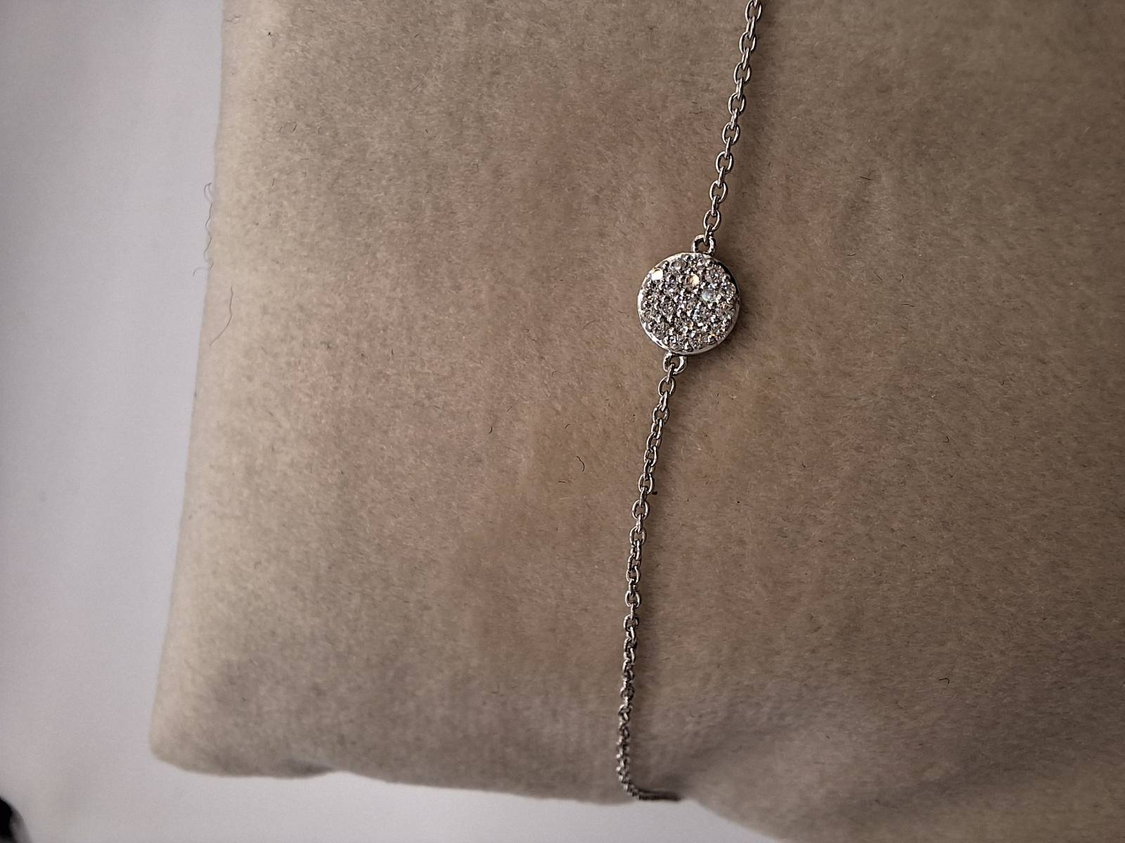 Delizioso bracciale in oro bianco 18 kt con catena sottile e motivo di dischetto al centro tempestato di brillanti per ct 0,06 totali. Si adatta a polsi di diverse dimensioni avendo anellini di chiusura a cm 15-16,6 e 18.