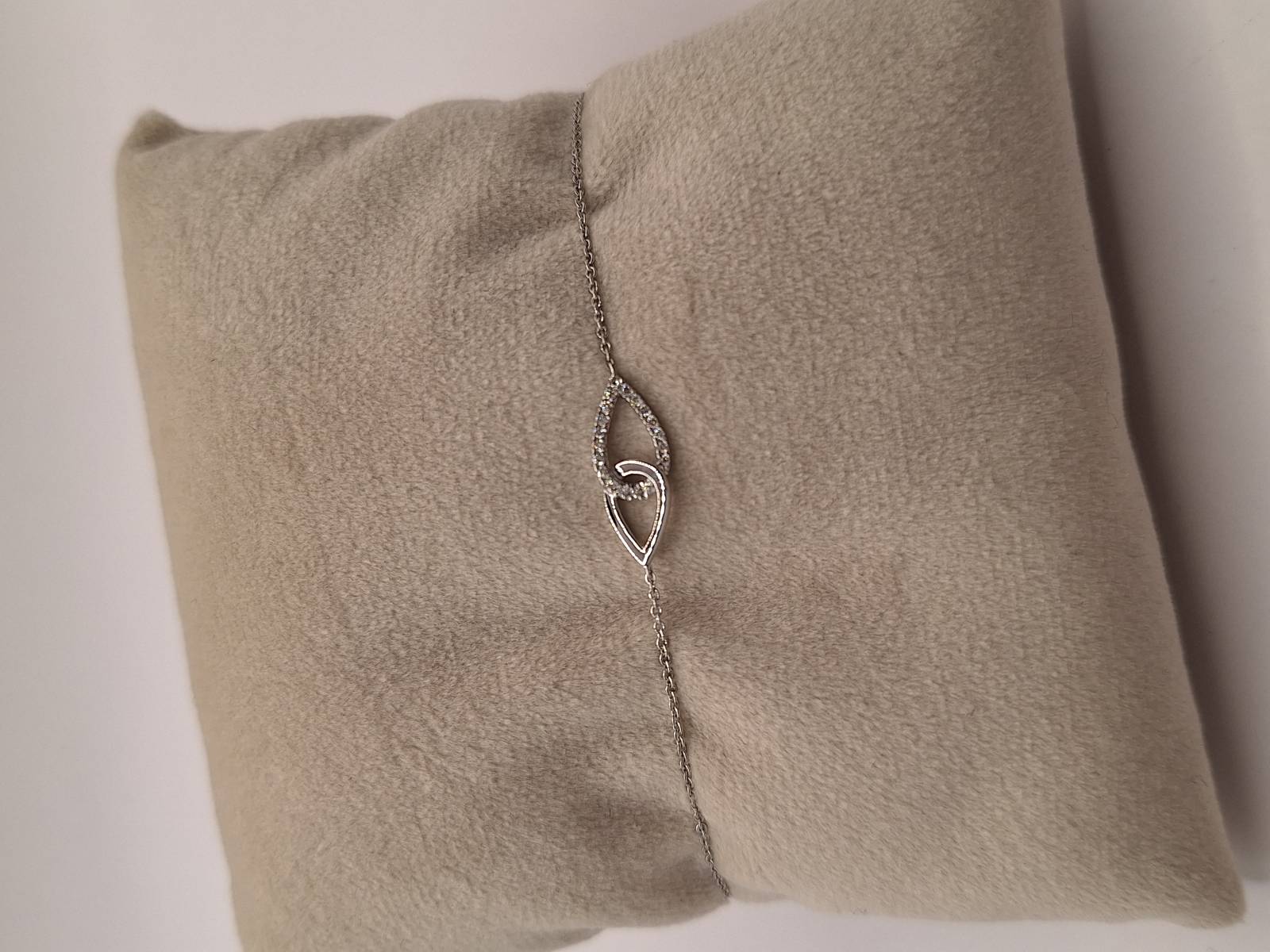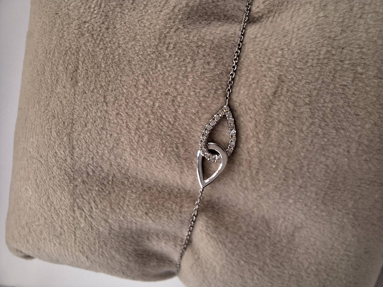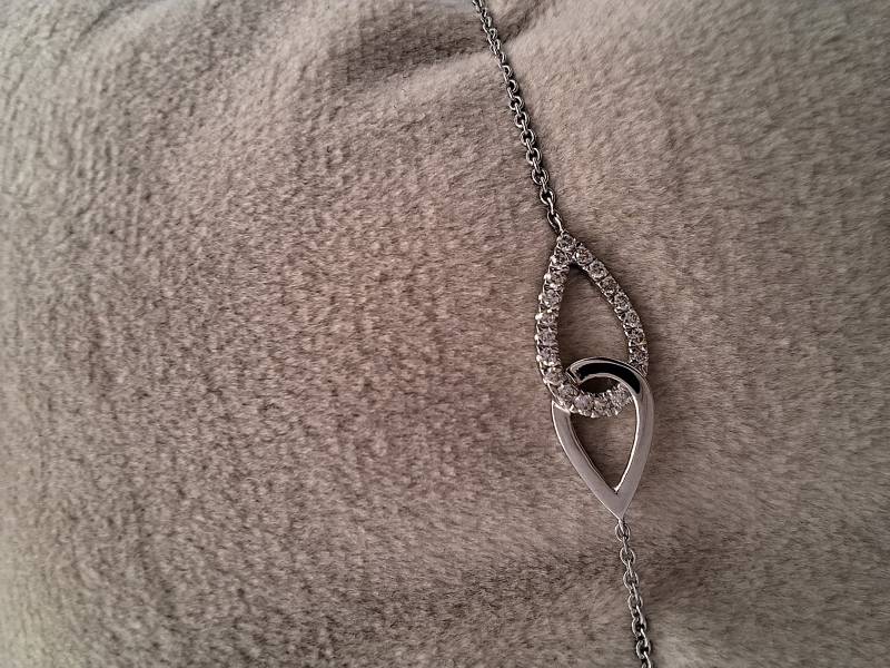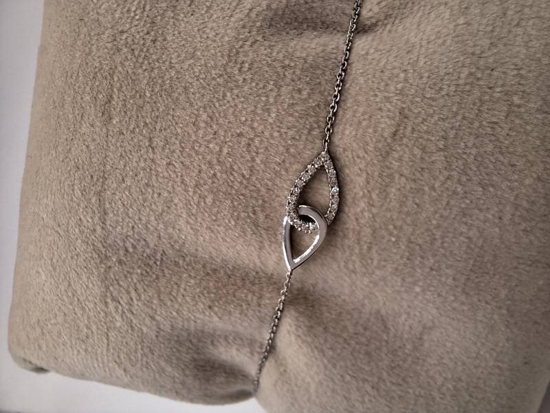 Delizioso bracciale in oro bianco 18 kt con catena sottile e motivo di intreccio al centro tempestato di brillanti per ct 0,07 totali. Si adatta a polsi di diverse dimensioni avendo anellini di chiusura a cm 15-16,6 e 18.