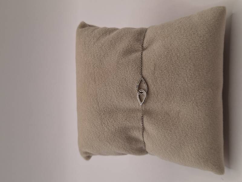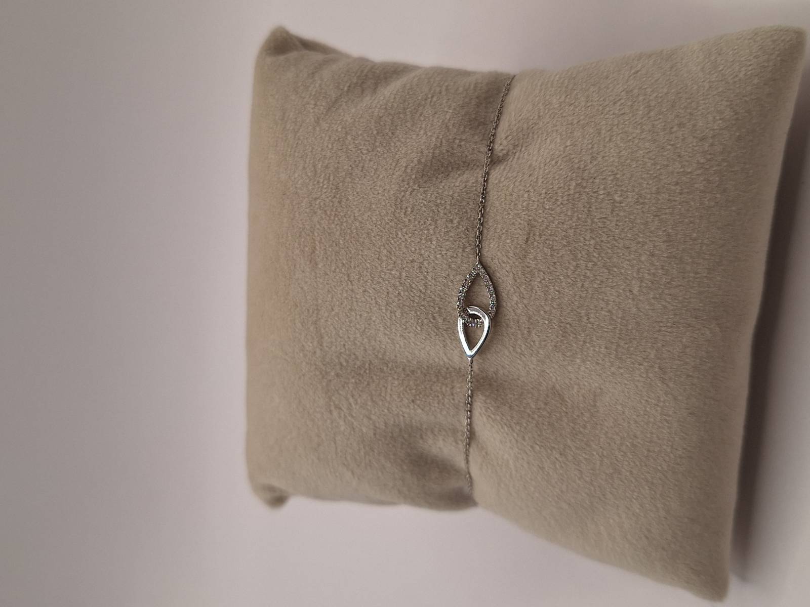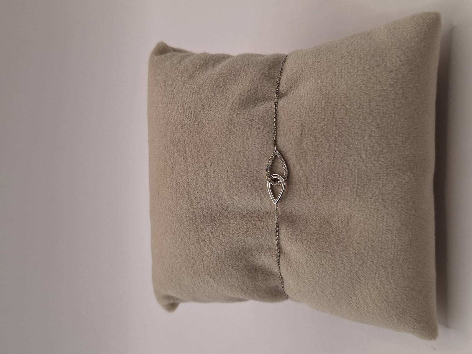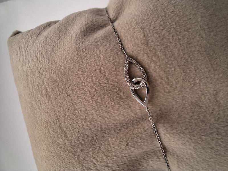 Delizioso bracciale in oro bianco 18 kt con catena sottile e motivo di intreccio al centro tempestato di brillanti per ct 0,07 totali. Si adatta a polsi di diverse dimensioni avendo anellini di chiusura a cm 15-16,6 e 18.