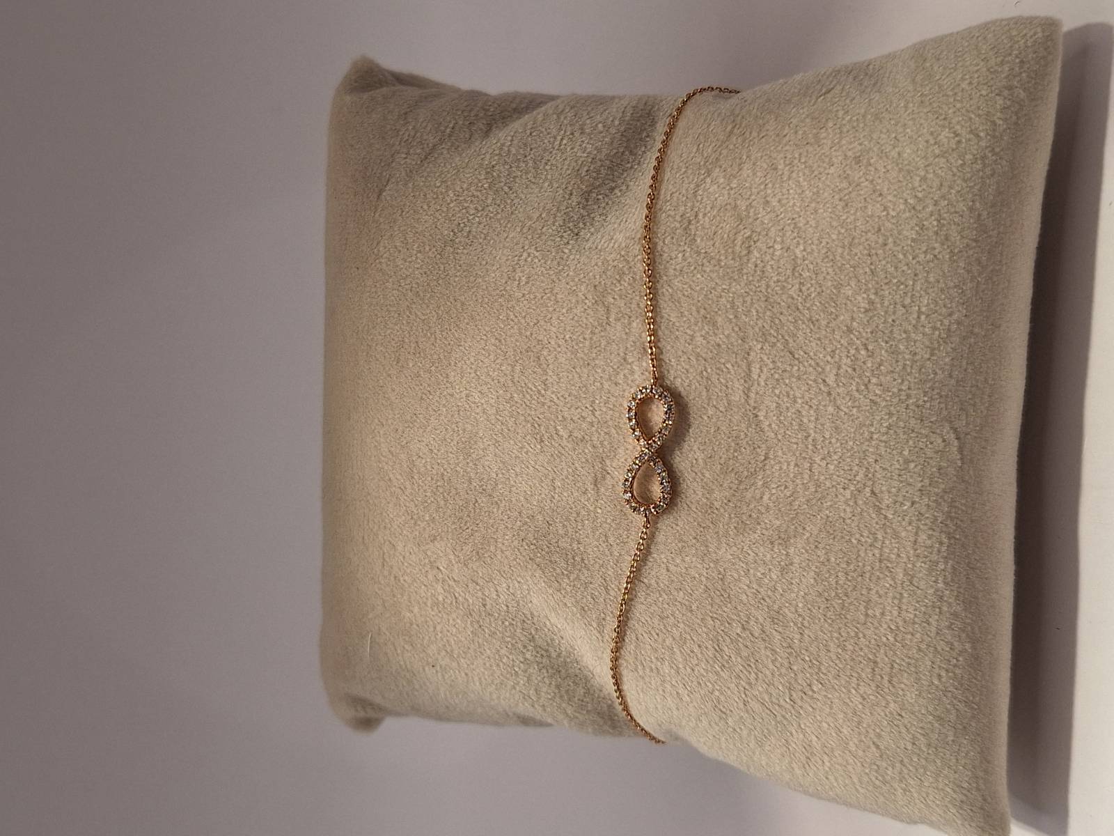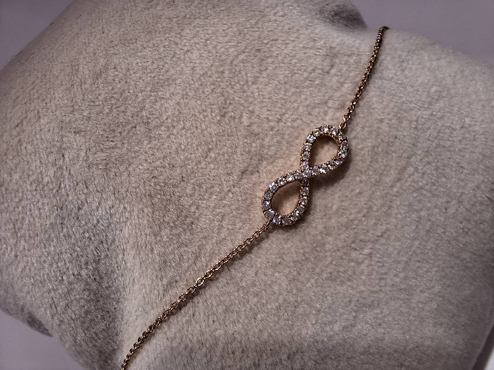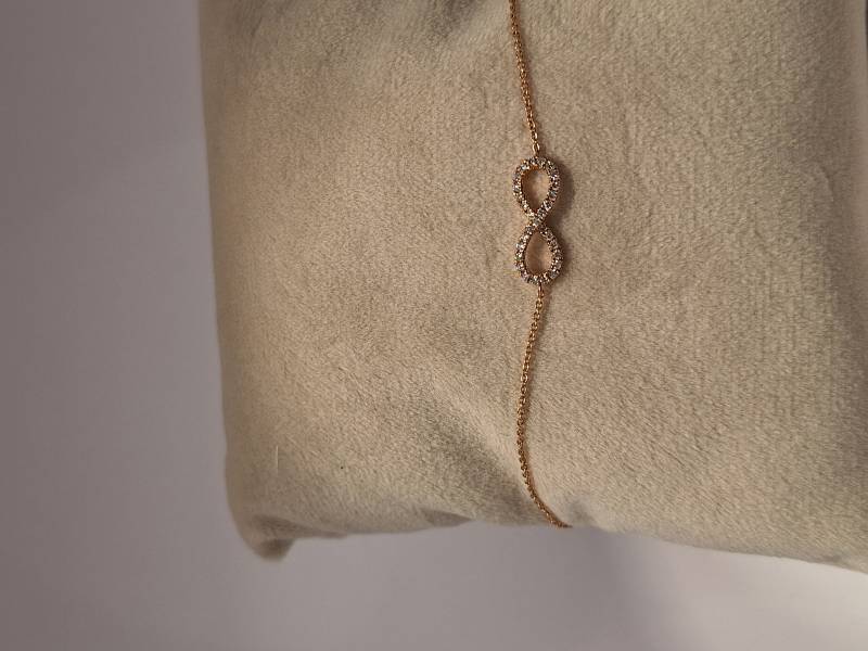 Delizioso bracciale in oro rosa 18 kt con catena sottile e motivo dell'infinito al centro tempestato di brillanti per ct 0,13. Si adatta a polsi di diverse dimensioni avendo anellini di chiusura a cm 15-16,6 e 18.