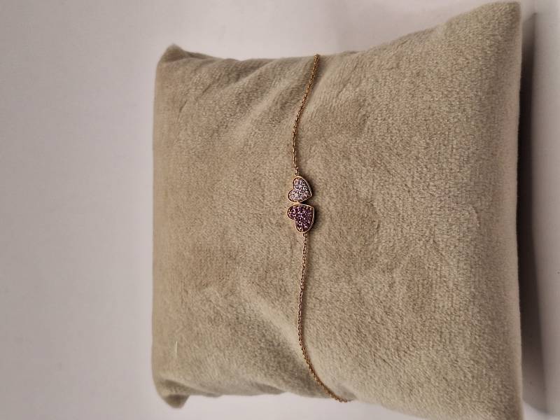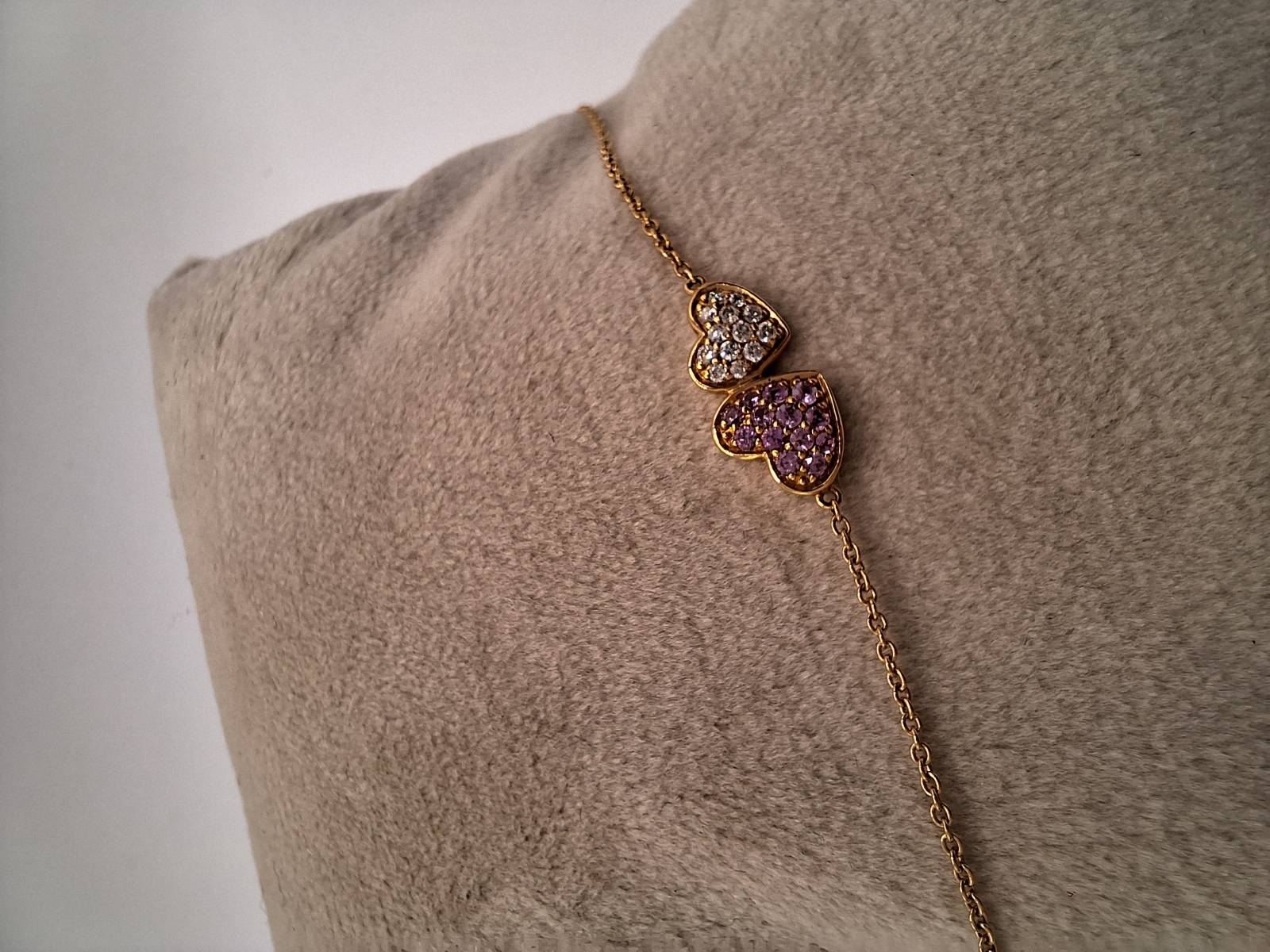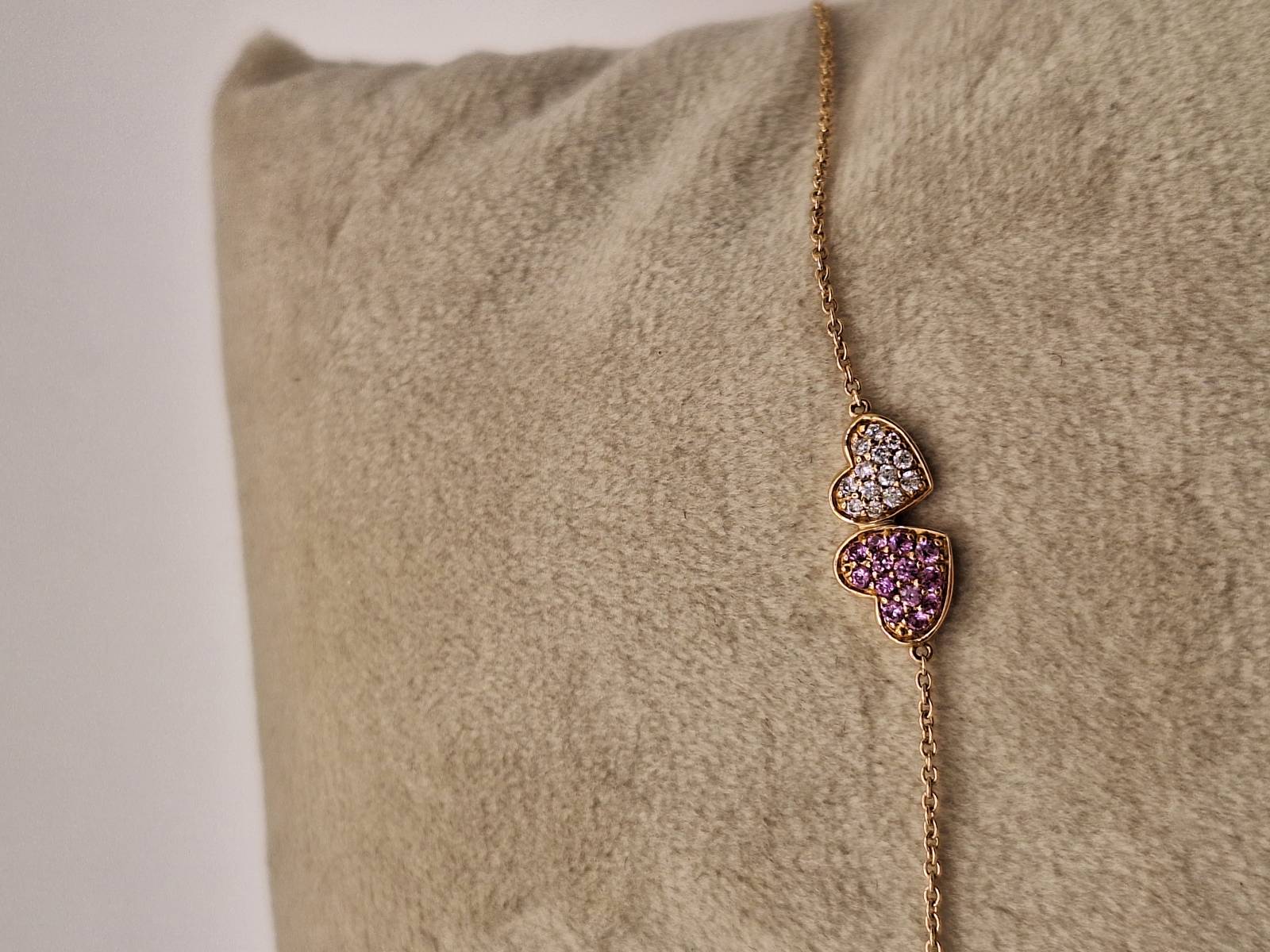 Delizioso bracciale in oro rosa 18 kt con catena sottile e motivo di due cuori al centro tempestati di brillanti (ct 0,06) e zaffiri rosa (ct 0,10). Si adatta a polsi di diverse dimensioni avendo anellini di chiusura a cm 15-16,6 e 18.