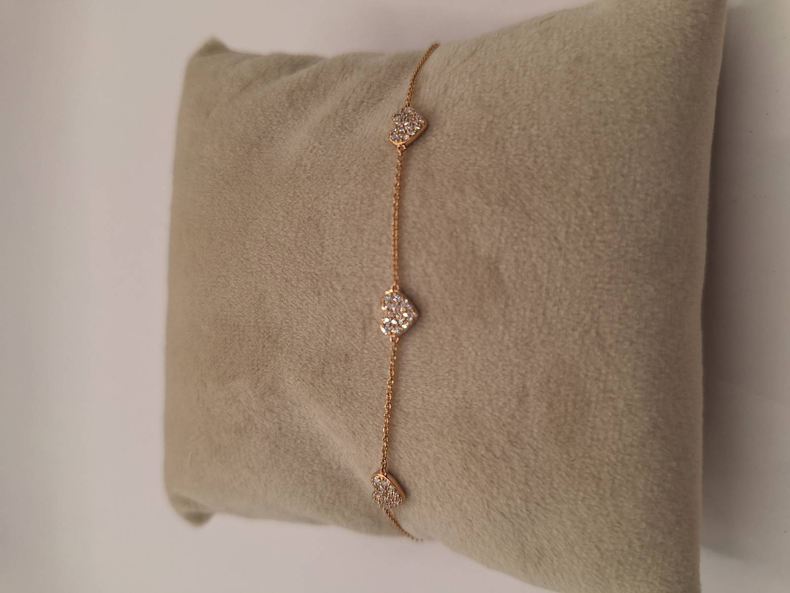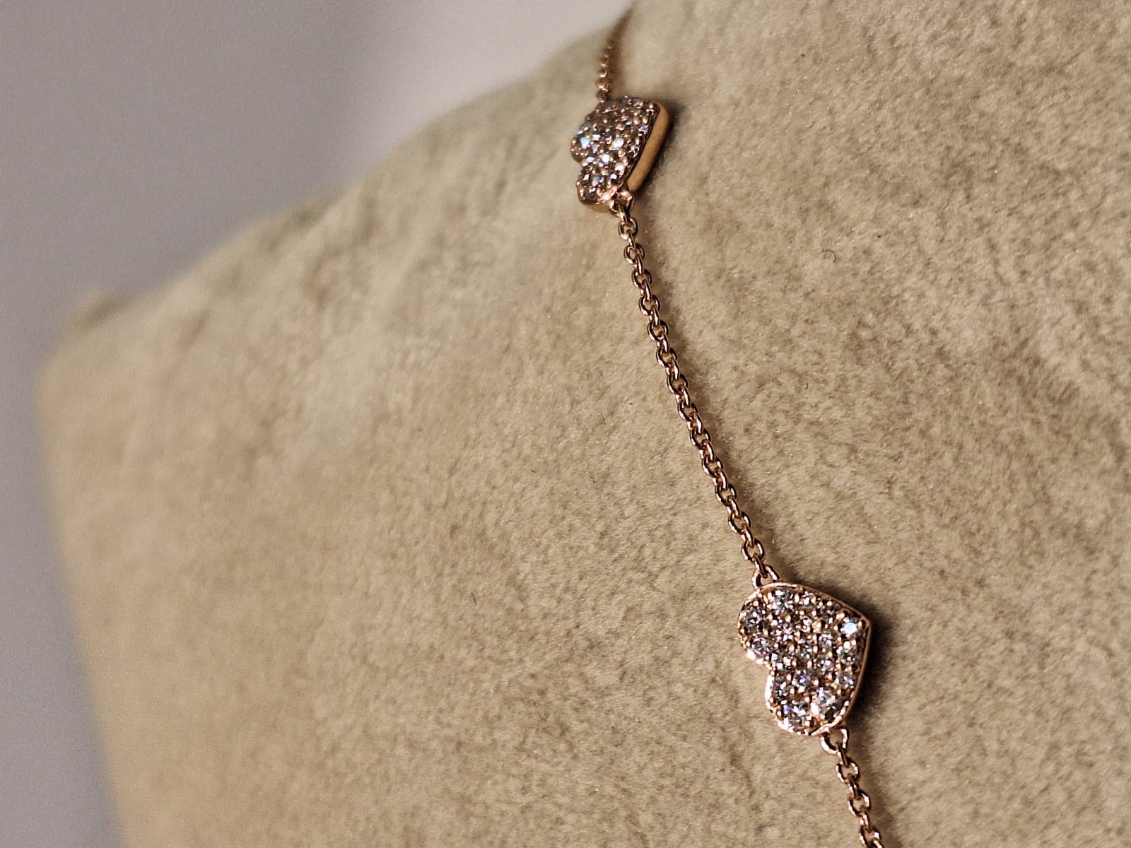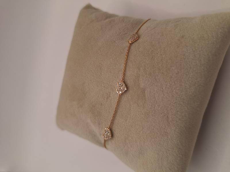 Delizioso bracciale in oro rosa 18 kt con catena sottile e motivo di tre cuori al centro tempestati di brillanti per ct 0,22. Si adatta a polsi di diverse dimensioni avendo anellini di chiusura a cm 15-16,6 e 18.