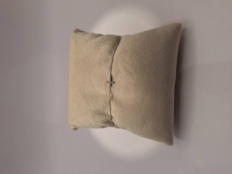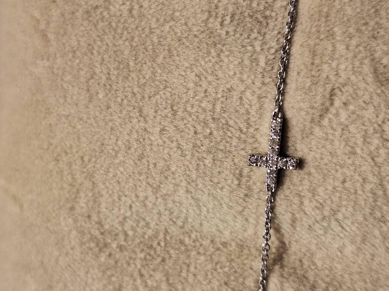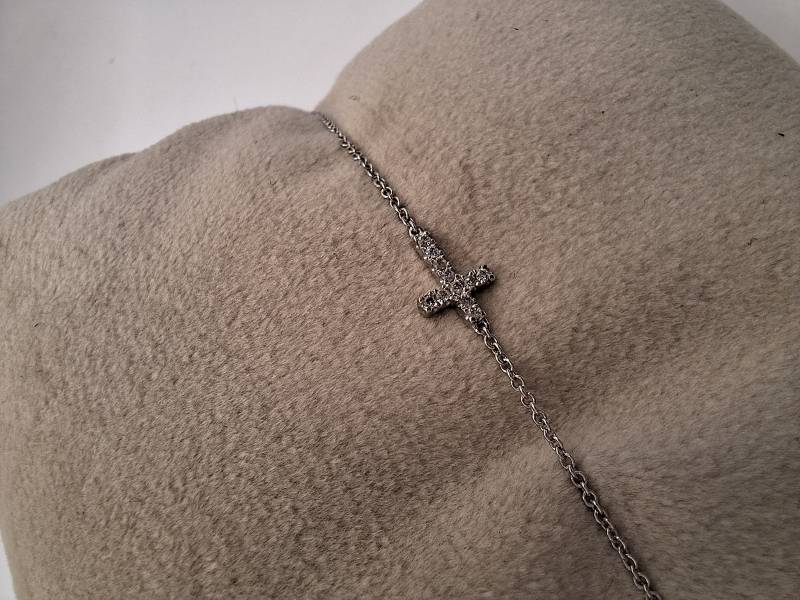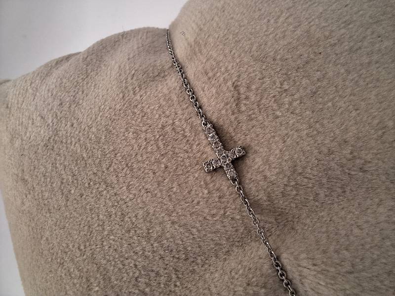 Delizioso bracciale in oro bianco 18 kt con catena sottile e motivo di croce al centro tempestata di brillanti per ct 0,05 totali. Si adatta a polsi di diverse dimensioni avendo anellini di chiusura a cm 15-16,6 e 18.