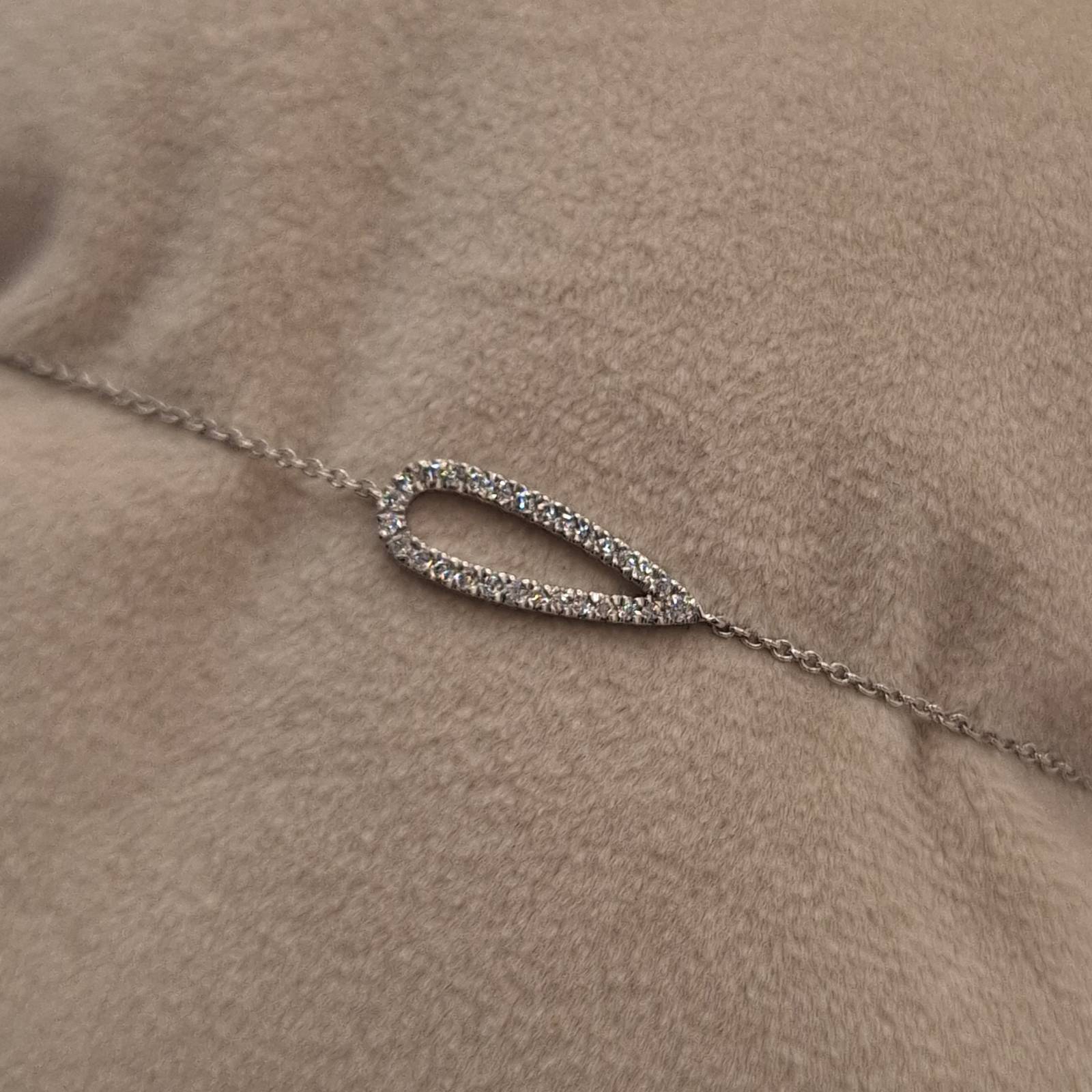 Delizioso bracciale in oro bianco 18 kt con catena sottile e motivo di goccia al centro tempestata di brillanti per ct 0,10 totali. Si adatta a polsi di diverse dimensioni avendo anellini di chiusura a cm 15-16,6 e 18.