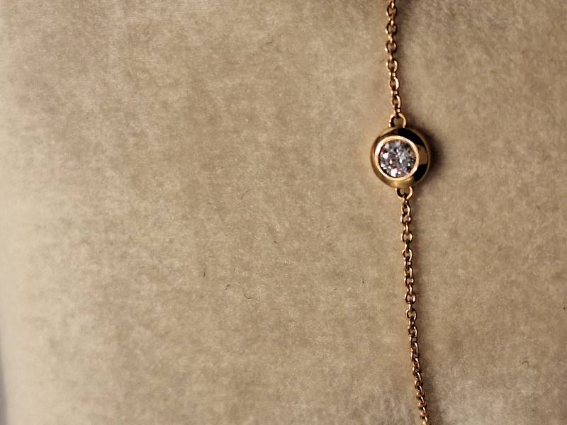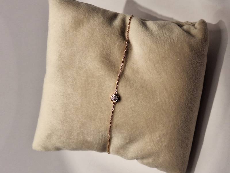 Delizioso bracciale in oro rosa 18 kt con catena sottile e motivo di dischetto al centro in cui è incassato un brillante solitario di ct 0,10 colore G, purezza SI. Si adatta a polsi di diverse dimensioni avendo anellini di chiusura a cm 15-16,6 e 18.