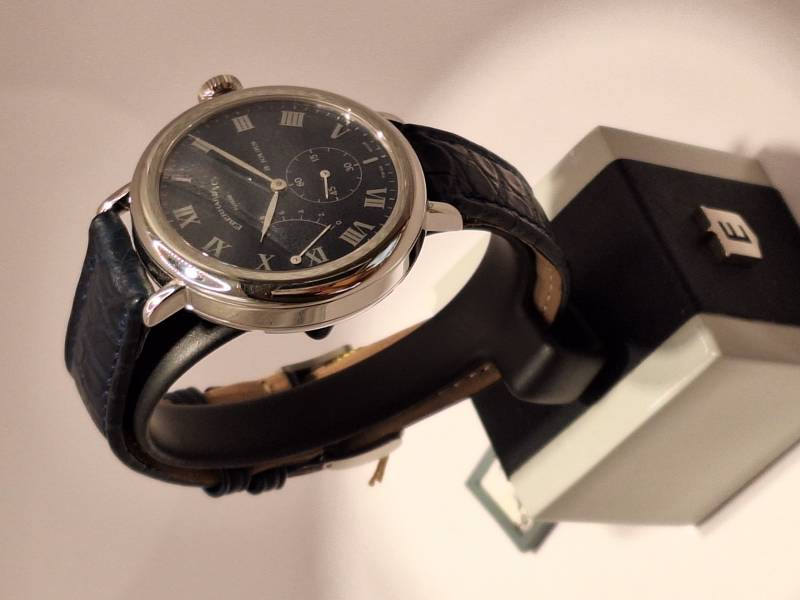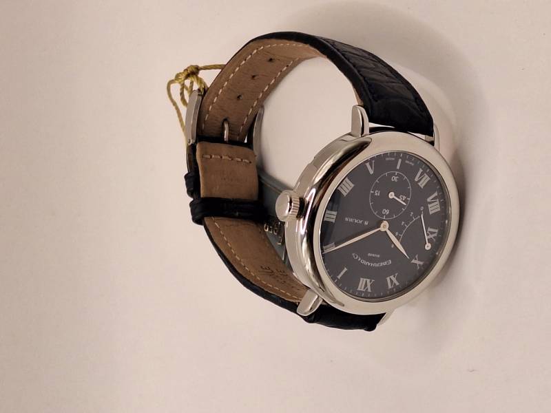 Orologio a carica manuale con indicazione della riserva di carica a ore 9 e piccoli secondi ad ore 6. La presenza di due molle di lunghezza superiore al metro e mezzo che agiscono in modo combinato consente un'autonomia di carica di otto giorni (192 h). La presenza di una lancetta indicante l'autonomia in giorni permette di ricaricare l'orologio quando necessita. Cassa in acciaio diametro 39 mm e spessore mm 11,80. Vetro zaffiro bombato e fondello in acciaio fermato da sei viti. Impermeabilità a 3 atm