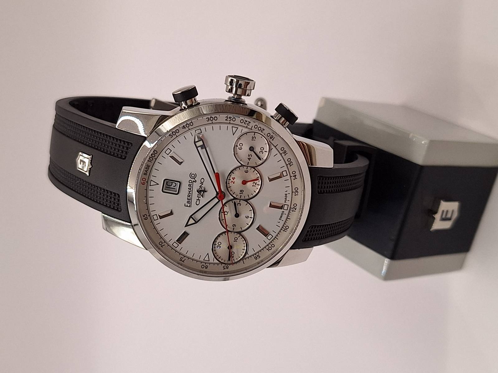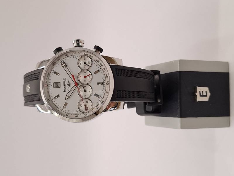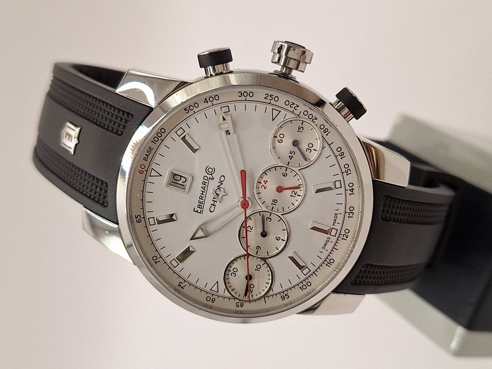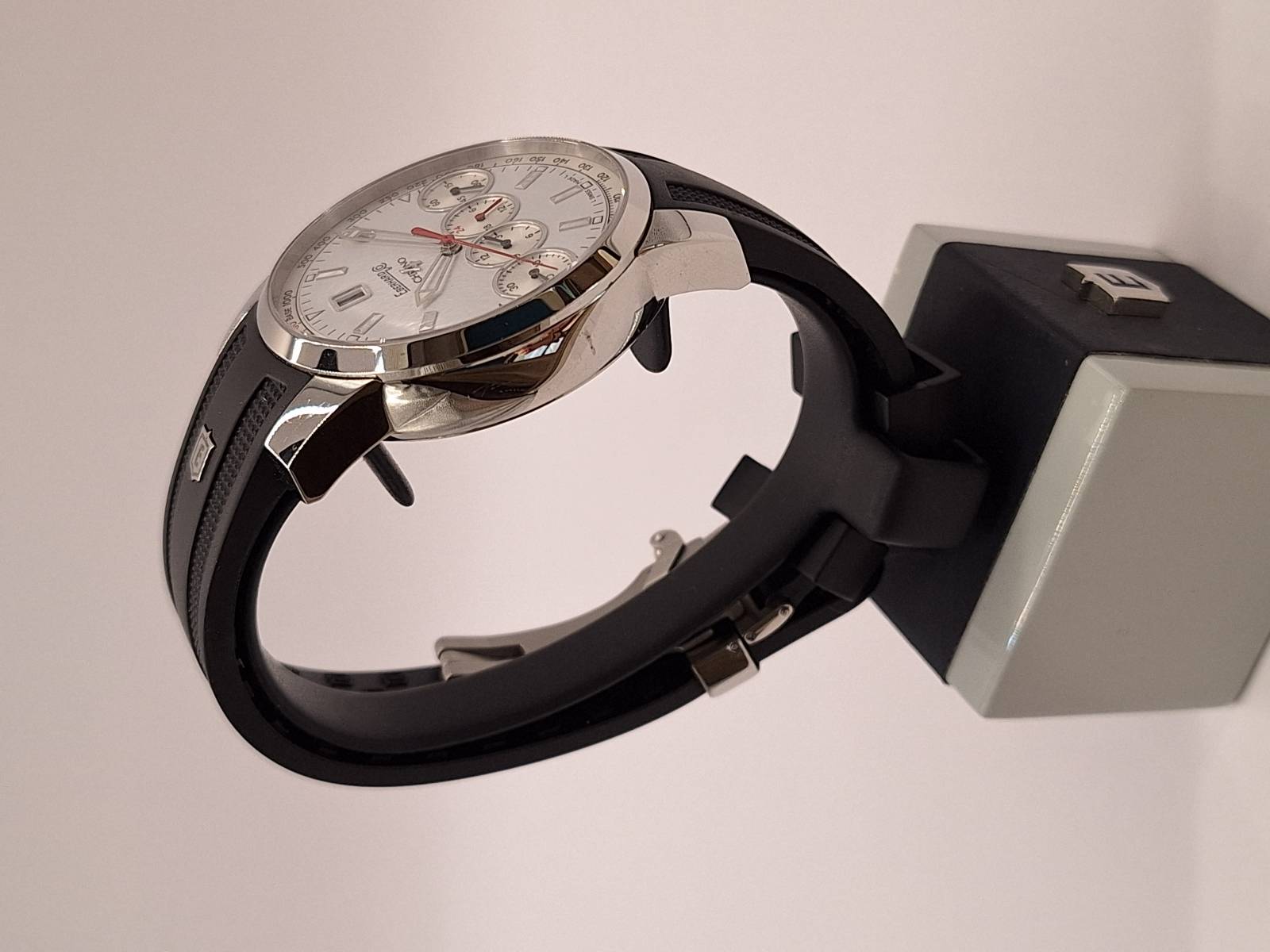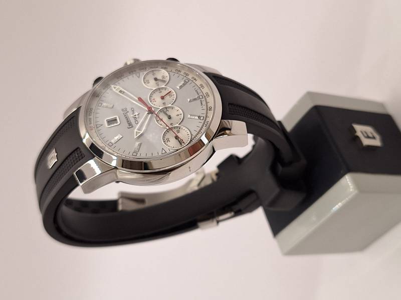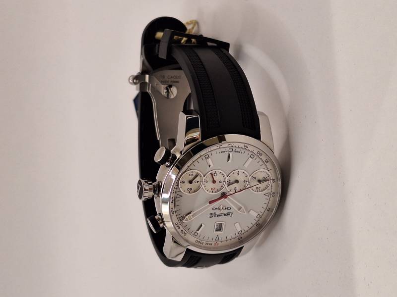Orologio nuovo con cronografo, data e quattro contatori allineati che indicano i secondi indipendenti, il totalizzatore dei minuti, il totalizzatore delle ore e le 24 h dell'orologio. Cassa in acciaio diametro 43 mm e spessore mm 13,8. Fondello serrato da otto viti, vetro zaffiro antiriflesso, corona a vite e pulsanti a pressione. Impermeabilità a 5 bar.