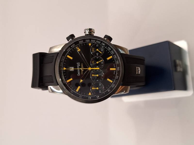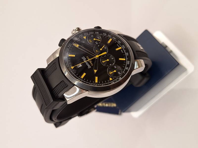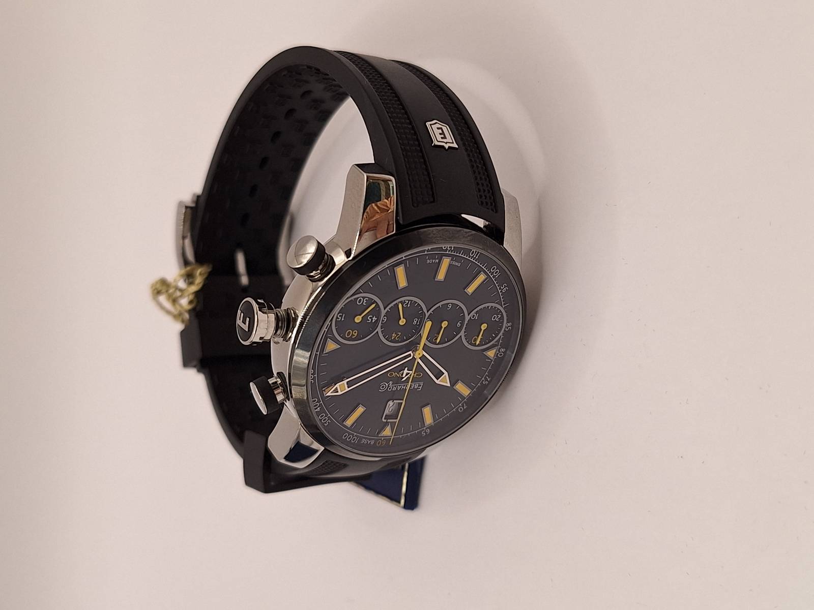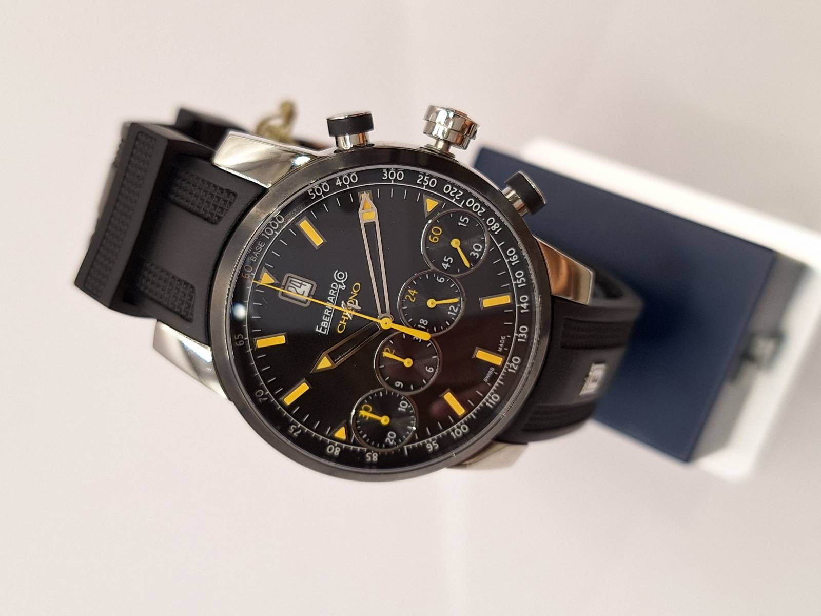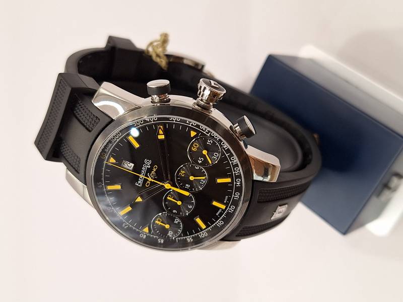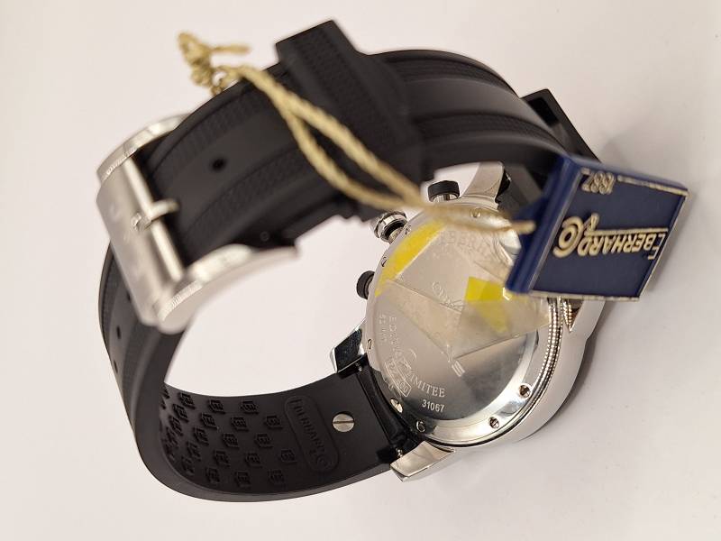 Orologio nuovo con cronografo, data e quattro contatori allineati che indicano i secondi indipendenti, il totalizzatore dei minuti, il totalizzatore delle ore e le 24 h dell'orologio. Cassa in acciaio diametro 43 mm e spessore mm 13,8. Fondello serrato da otto viti, vetro zaffiro antiriflesso, corona a vite e pulsanti a pressione. Impermeabilità a 5 bar.