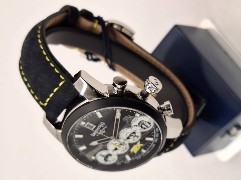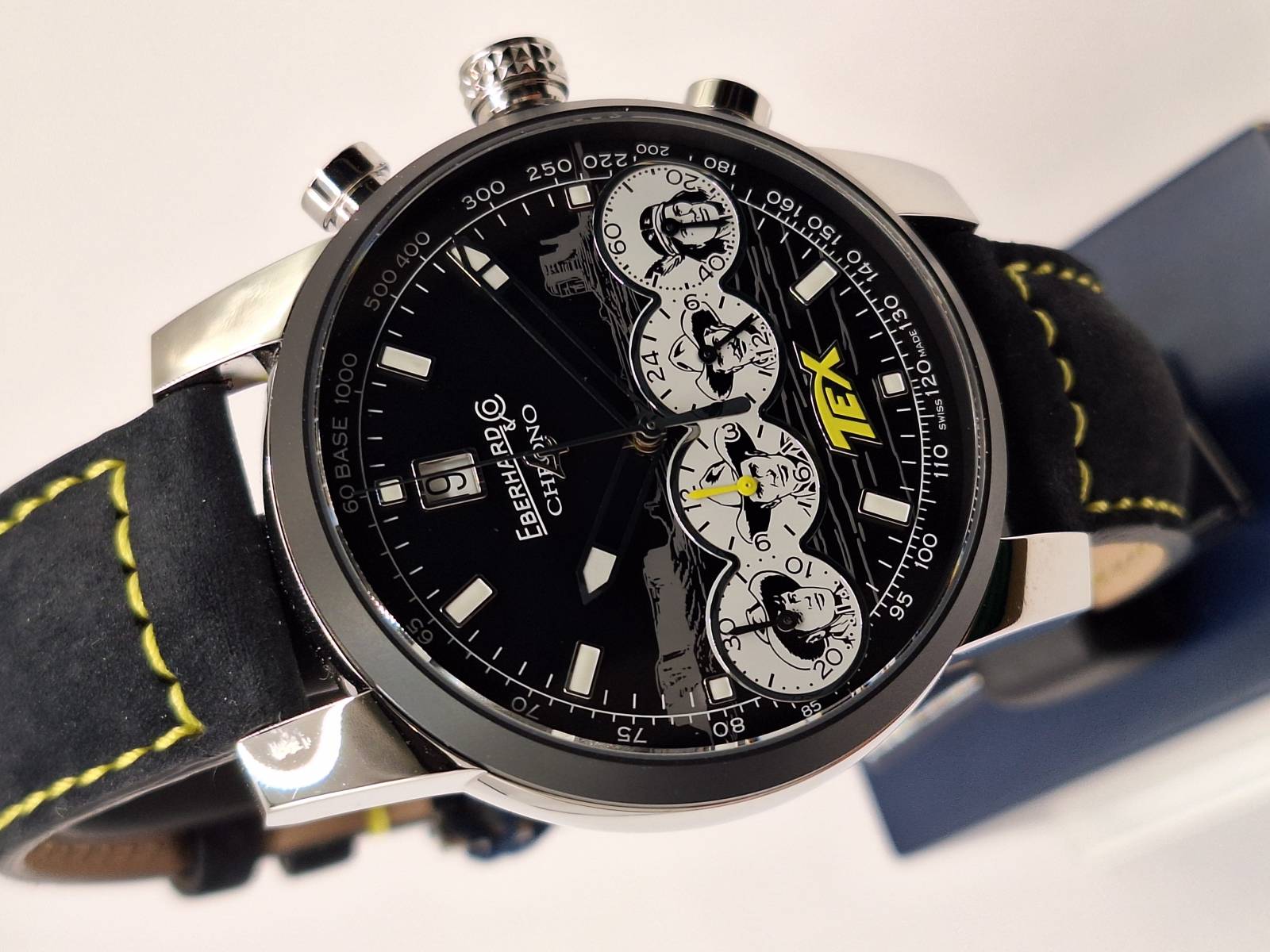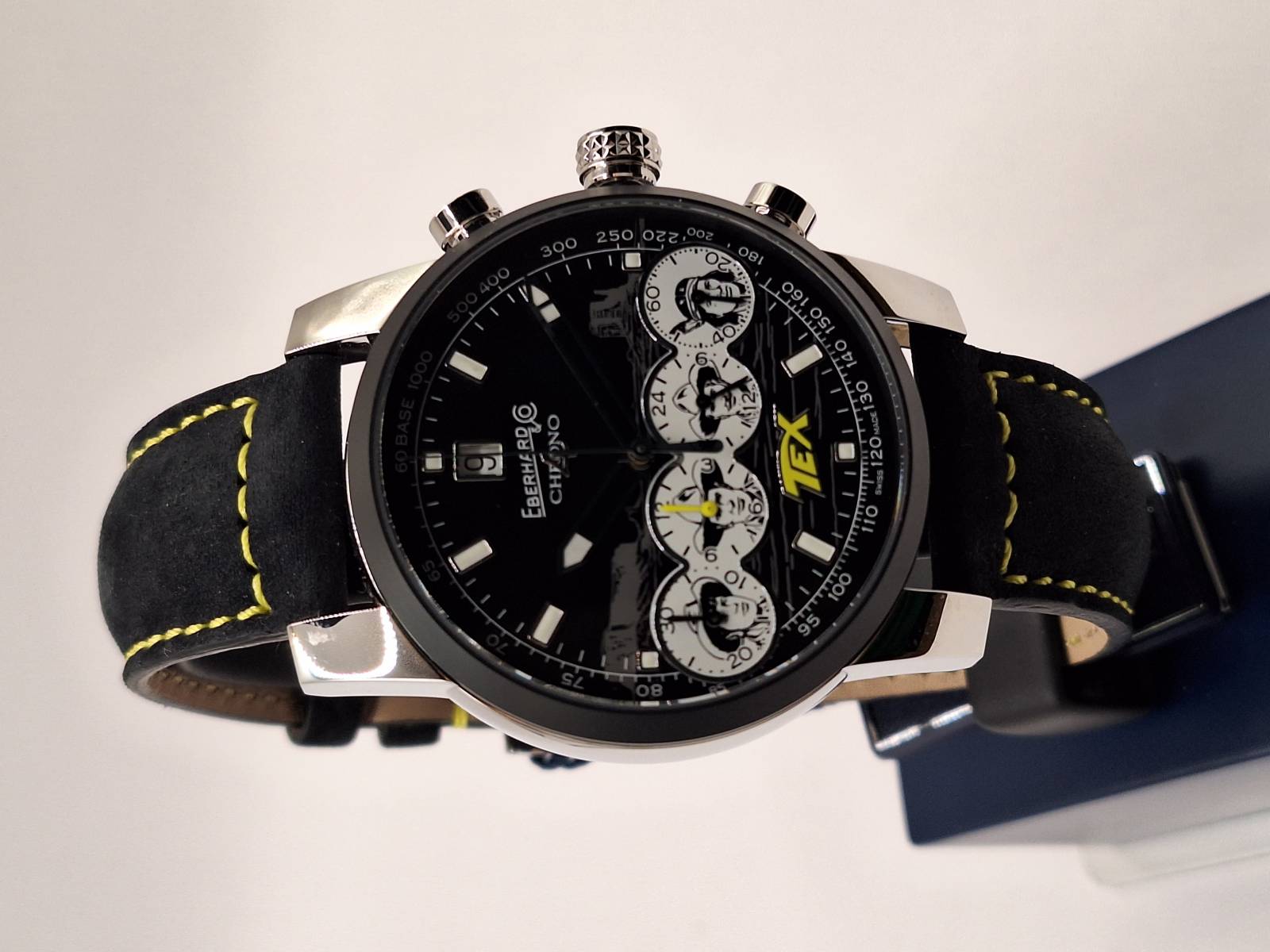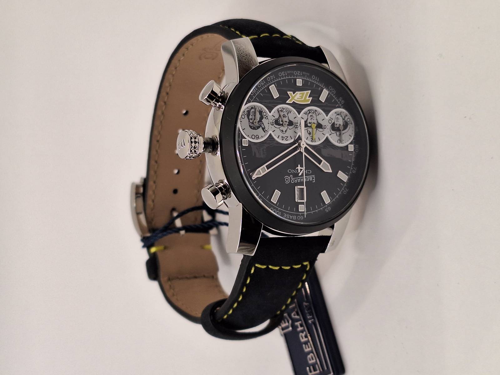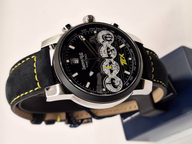 Orologio nuovo con cronografo, data e quattro contatori allineati che indicano i secondi indipendenti, il totalizzatore dei minuti, il totalizzatore delle ore e le 24 h dell'orologio. Cassa in acciaio diametro 42 mm e spessore mm 13,5, bracciale in acciaiio con personalizzazione Pards. Quadrante blu e tabacco con personalizzazione Tex.Edizione in serie limitata di 150 pezzi, pezzo n. 98 vetro zaffiro antiriflesso e ghiera in ceramica blu.