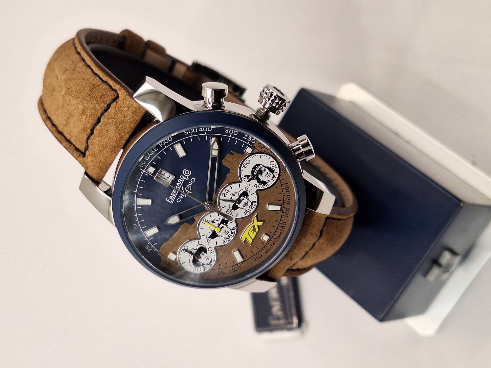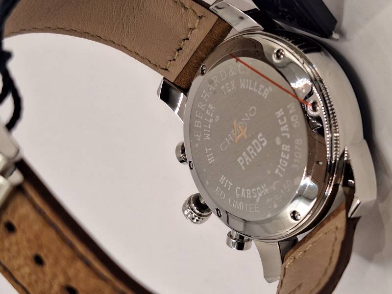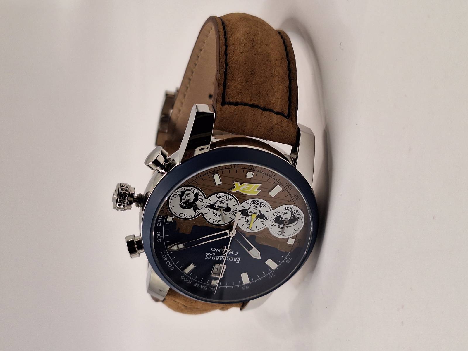 Orologio nuovo con cronografo, data e quattro contatori allineati che indicano i secondi indipendenti, il totalizzatore dei minuti, il totalizzatore delle ore e le 24 h dell'orologio. Cassa in acciaio diametro 43 mm e spessore mm 13,8. Fondello serrato da otto viti, vetro zaffiro antiriflesso, corona a vite e pulsanti a pressione. Impermeabilità a 5 bar.
