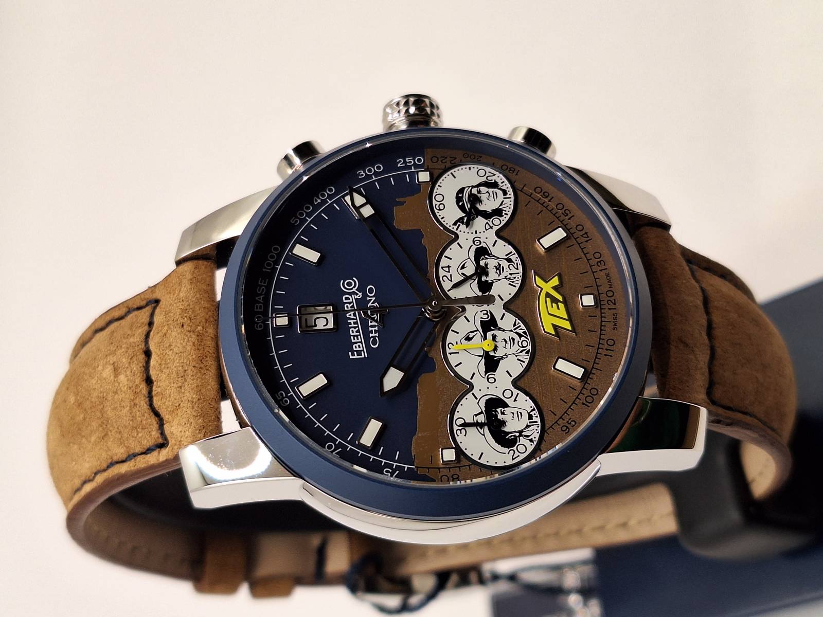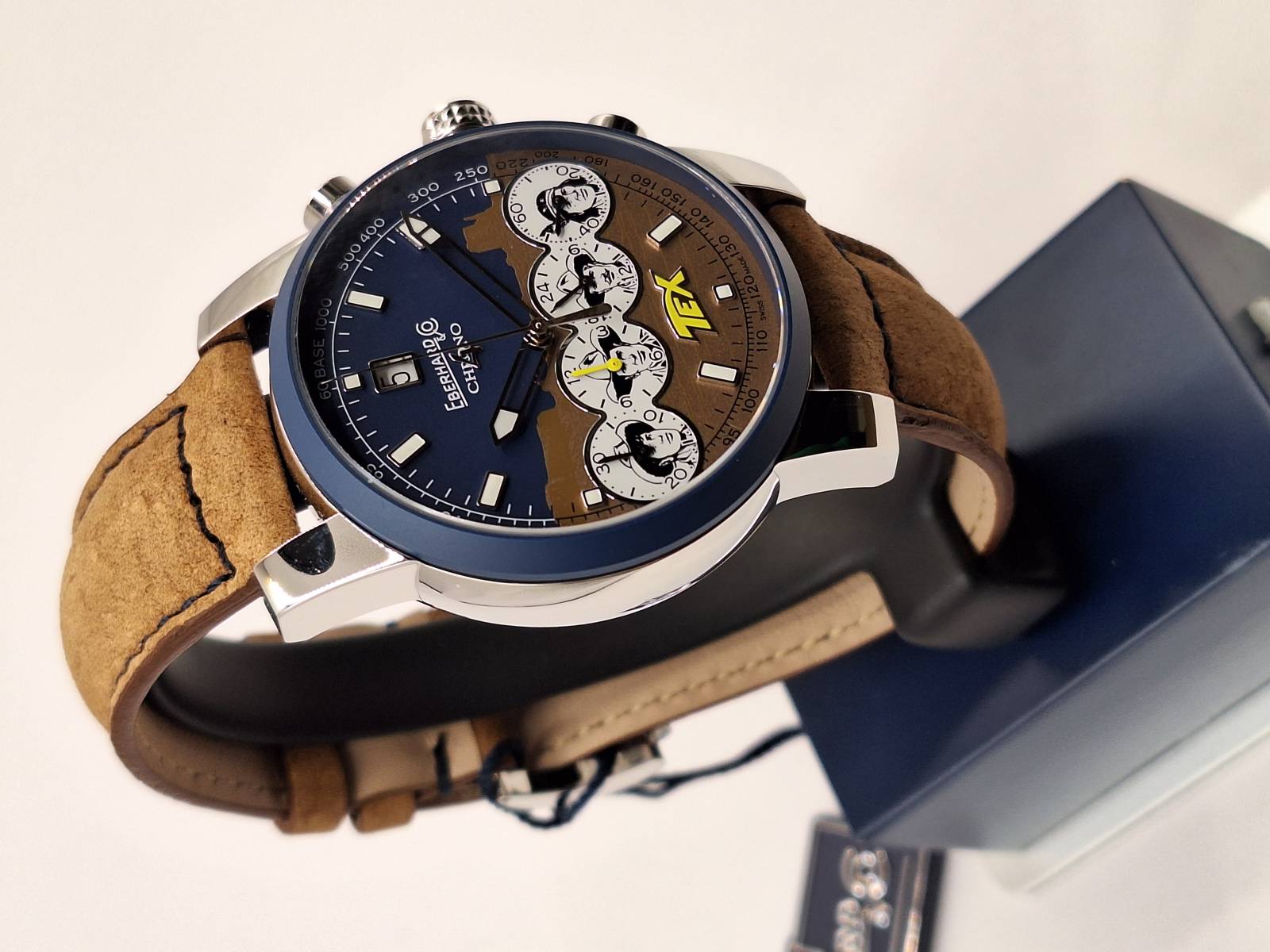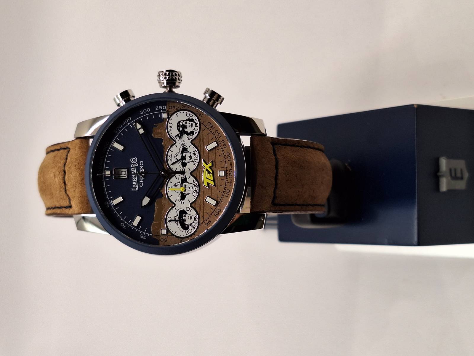Orologio nuovo con cronografo, data e quattro contatori allineati che indicano i secondi indipendenti, il totalizzatore dei minuti, il totalizzatore delle ore e le 24 h dell'orologio. Cassa in acciaio diametro 43 mm e spessore mm 13,8. Fondello serrato da otto viti, vetro zaffiro antiriflesso, corona a vite e pulsanti a pressione. Impermeabilità a 5 bar.