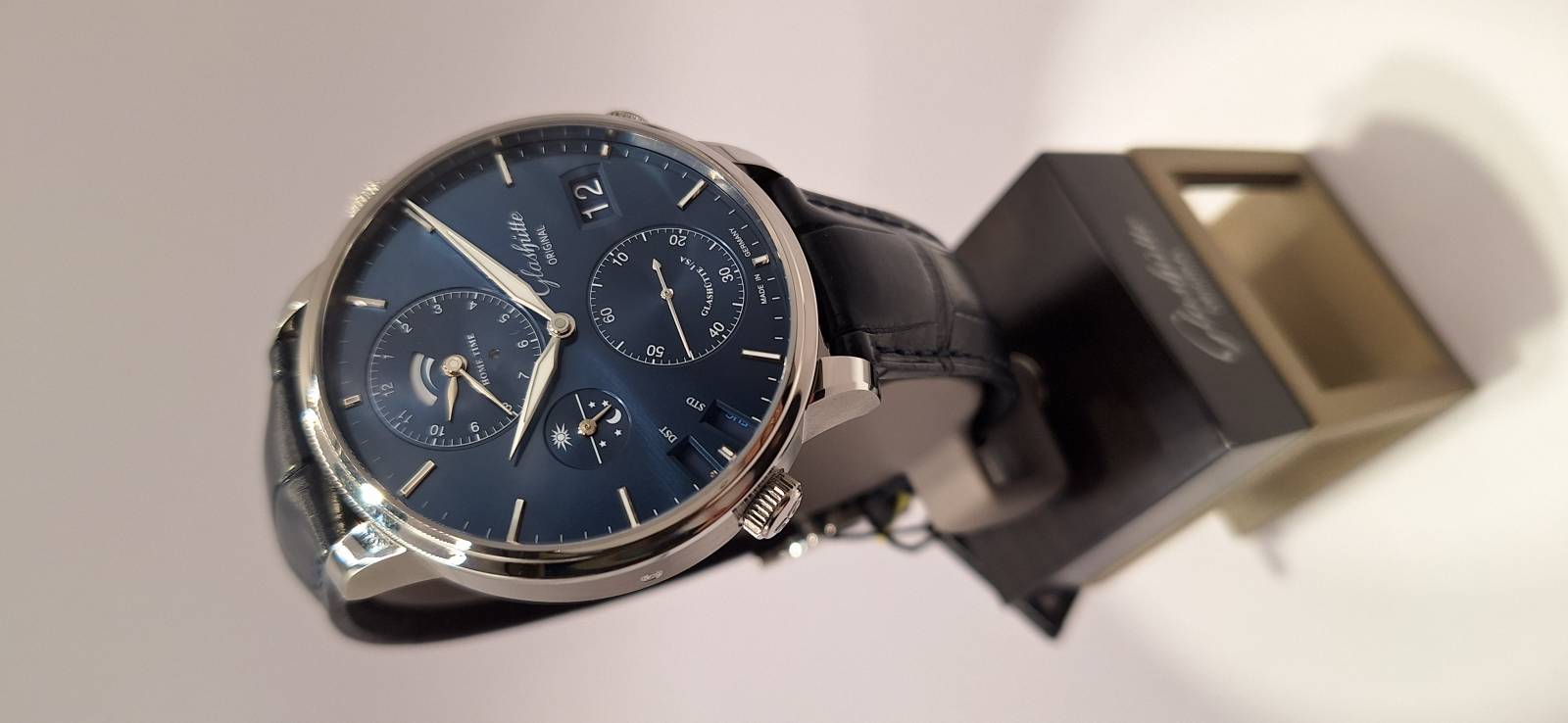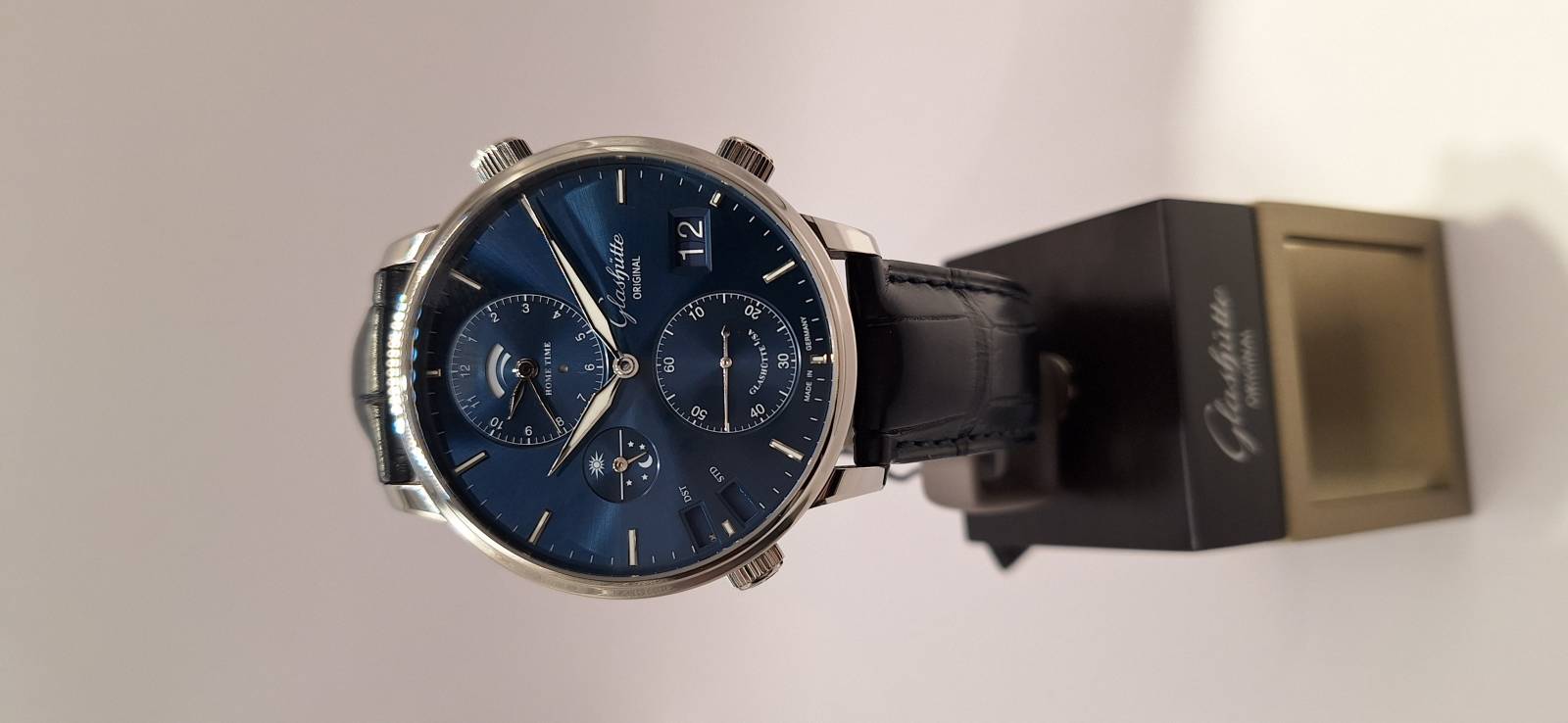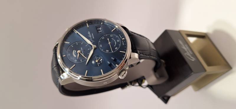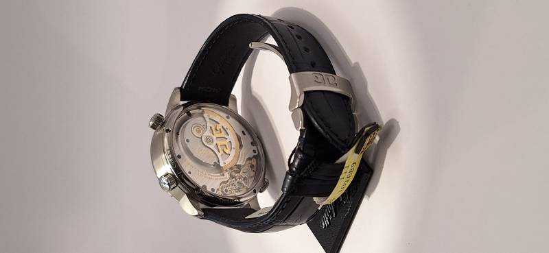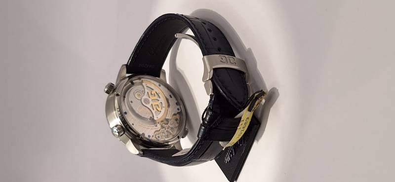Orologio nuovo, carica automatica,secondi indipendenti al 6, data panoarmica, indicazione di un secondo fuso orario indicazione giorno/notte per il fuso locale, ore del mondo con memorizzaione dei fusi orari del mondo compresi i fusi da mezz'ora e tre quarti d'ora. Cassa in acciaio mm 44 di diametro e spessore mm 14 vetro zaffiro superiore e in vetro zaffiro. Impermeabile a 5 bar. Movimento a carica automatica calibro di manifattura 89-02, rotore con appliacazioni in oro 21 Kt .