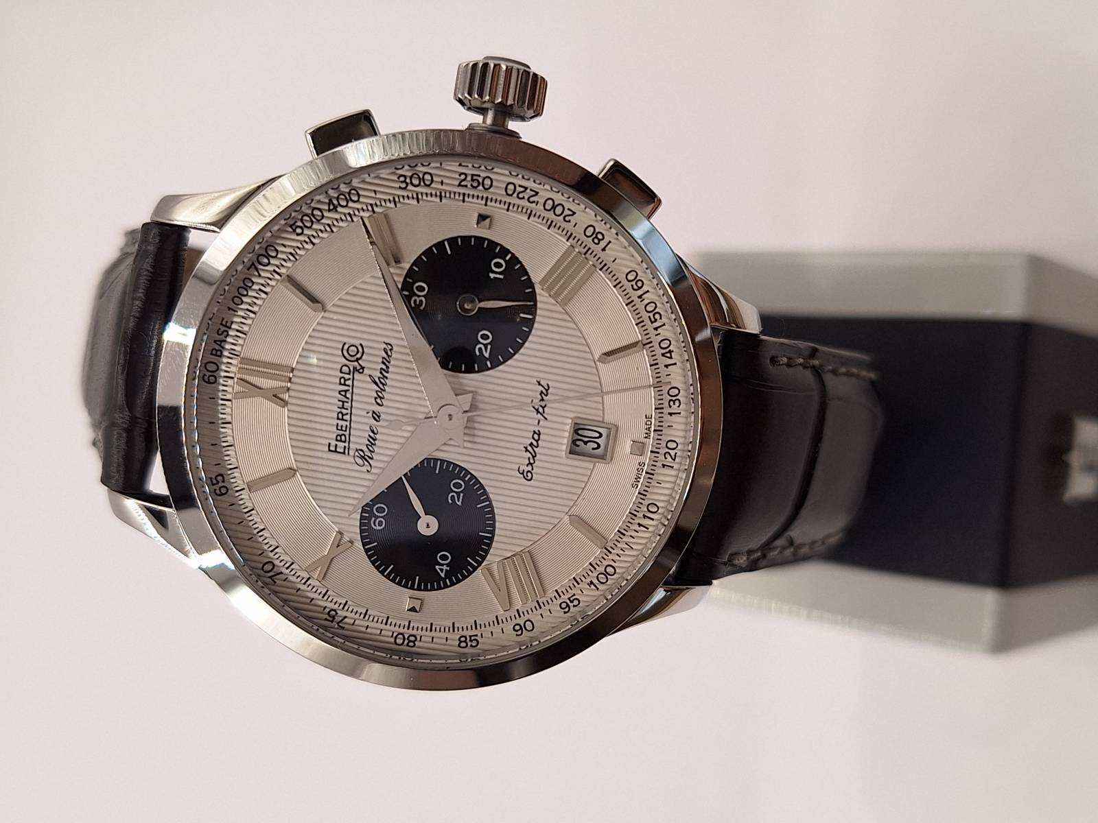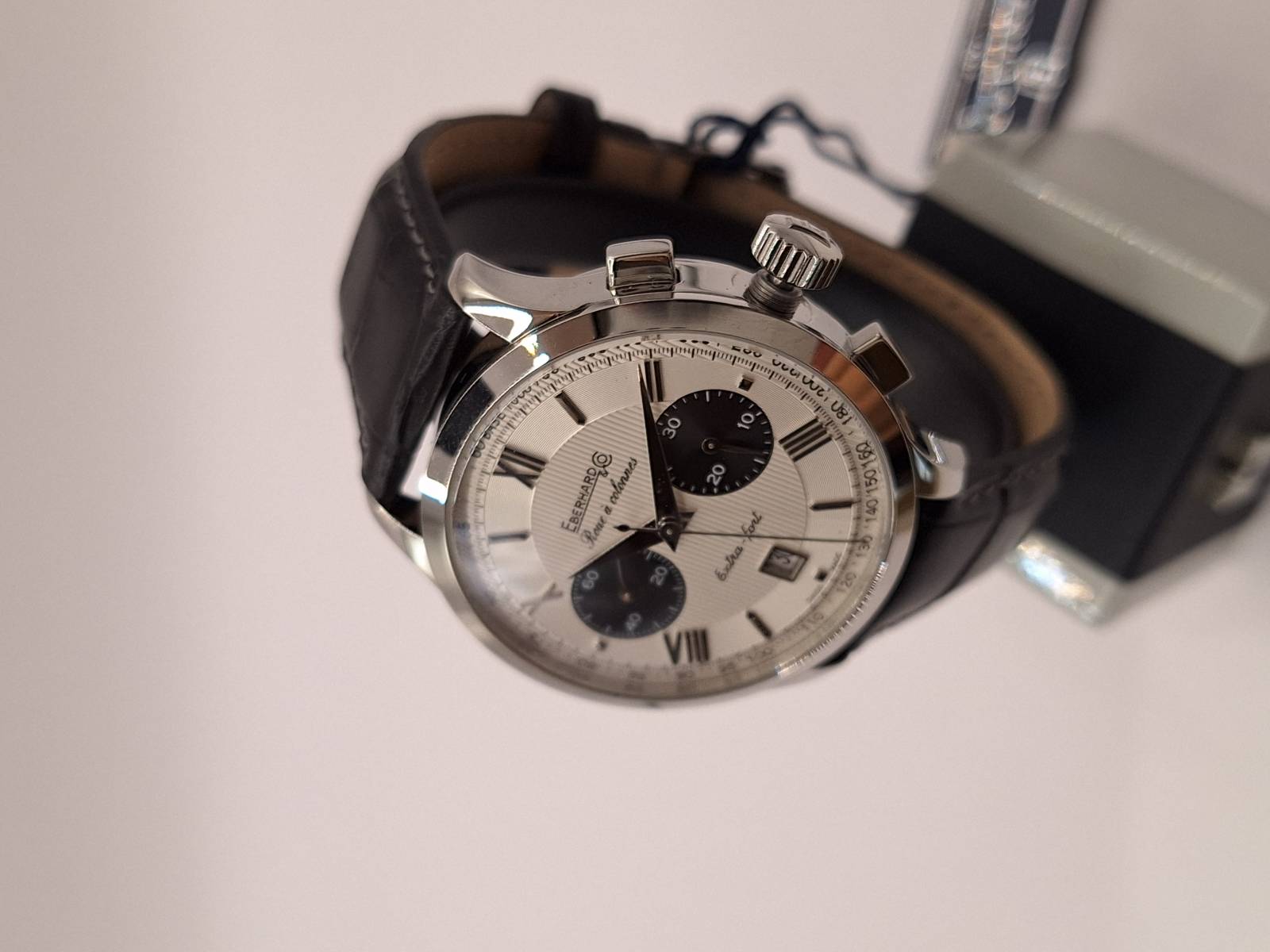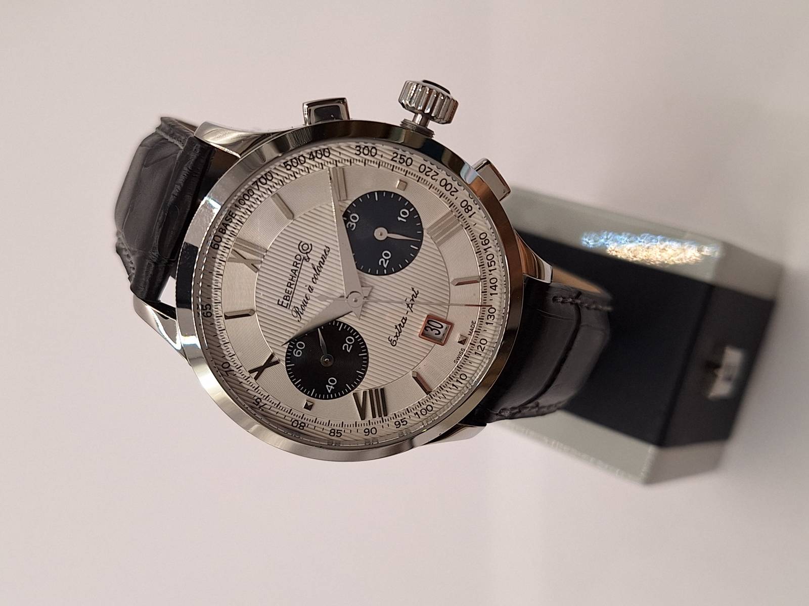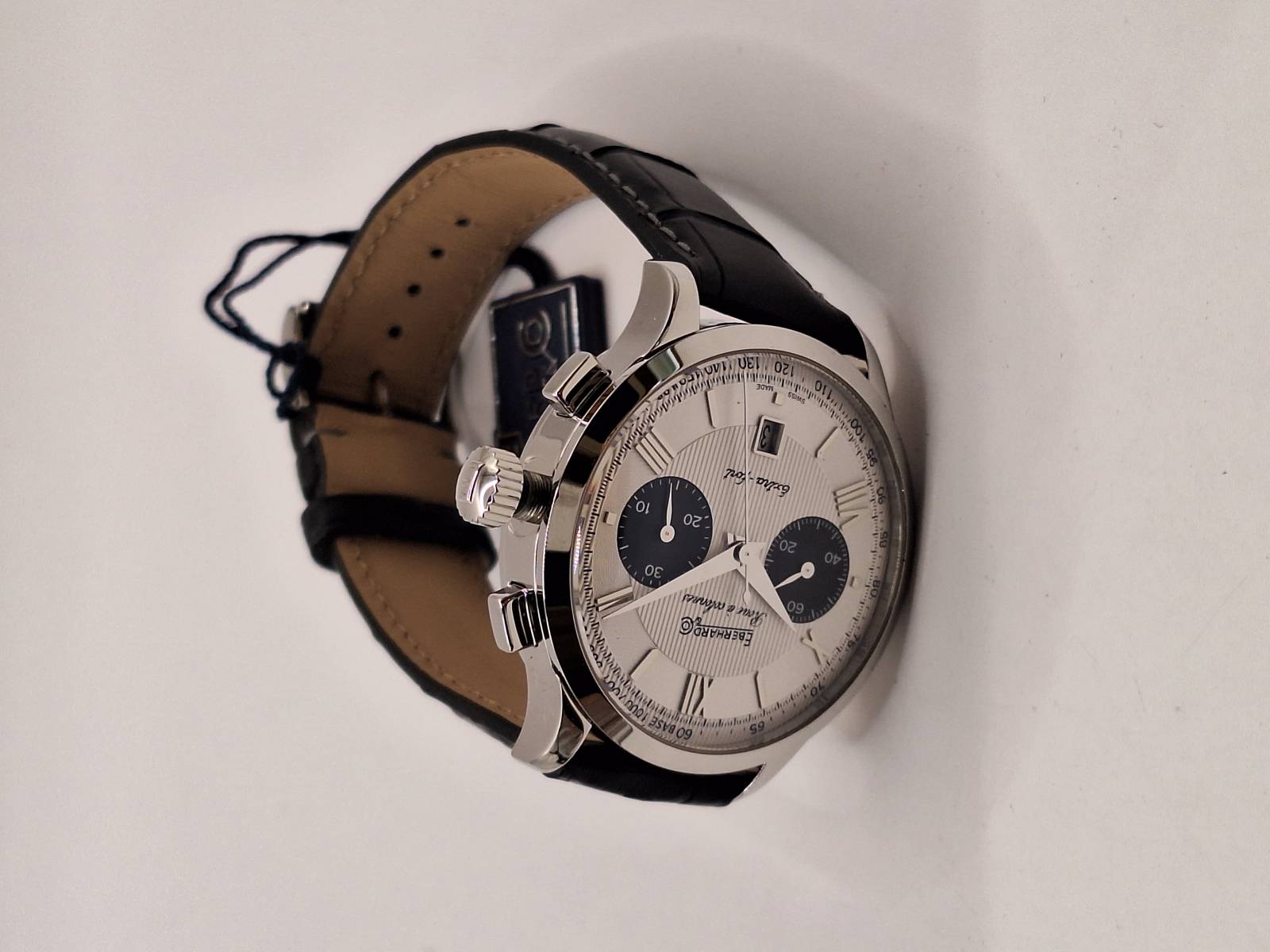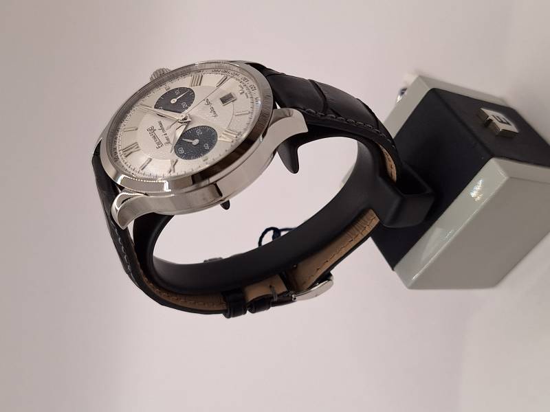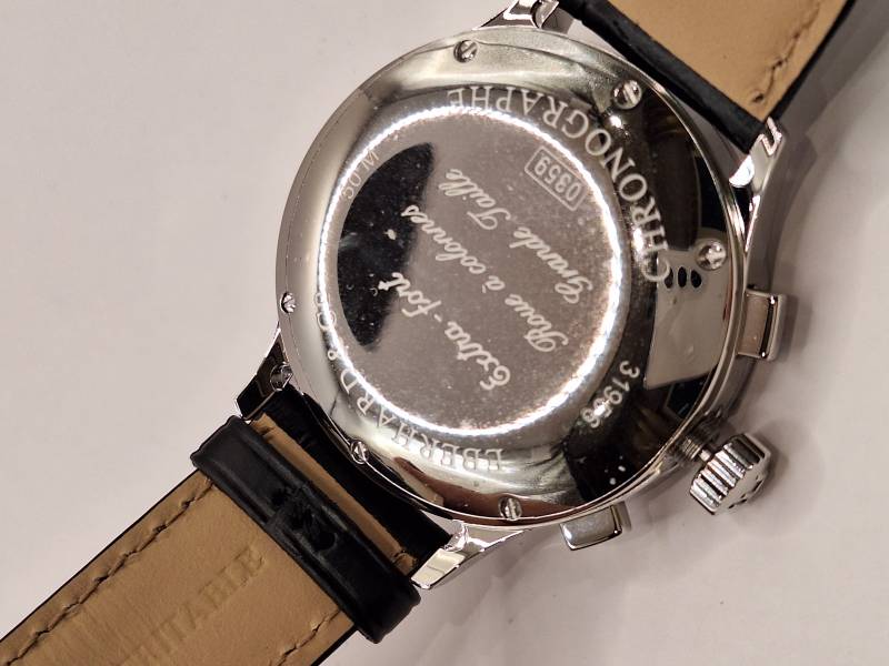 Orologio nuovo a carica automatica con cronografo a due contatori e datario al 6. Cassa in acciaio diametro 41 mm e spessore 14,5 mm. Vetro zaffiro bombato con trattamento antiriflesso e fondo in acciaio fermato da 6 viti. Corona a vite e pulsanti a pressione. Impermeabilità a 5 atm. Cronografo con ruota a colonna