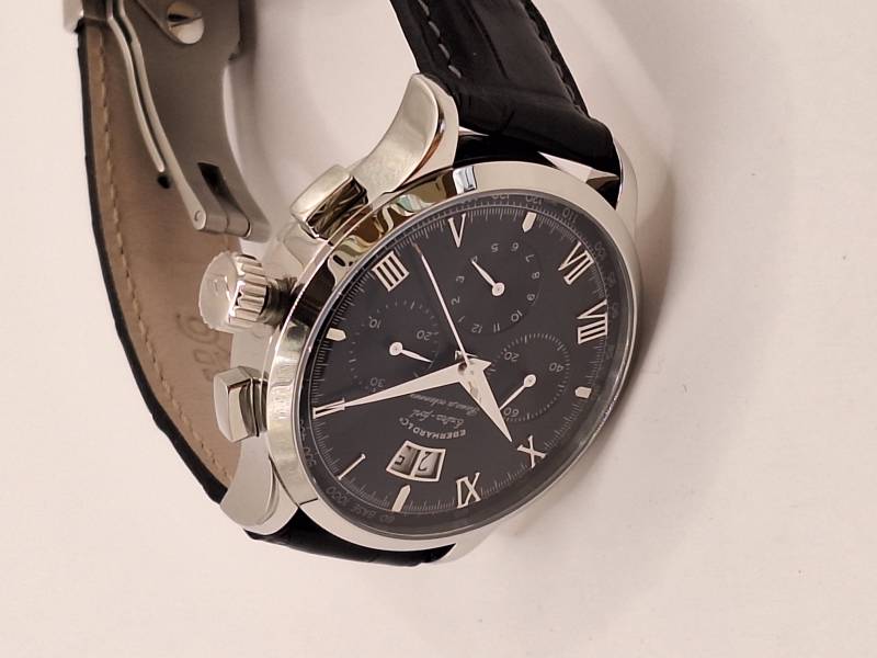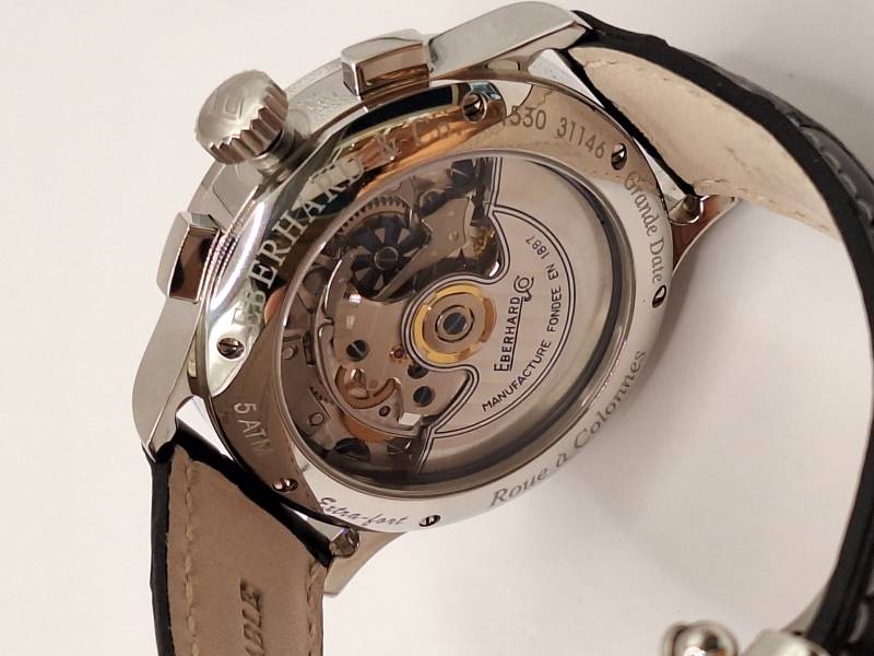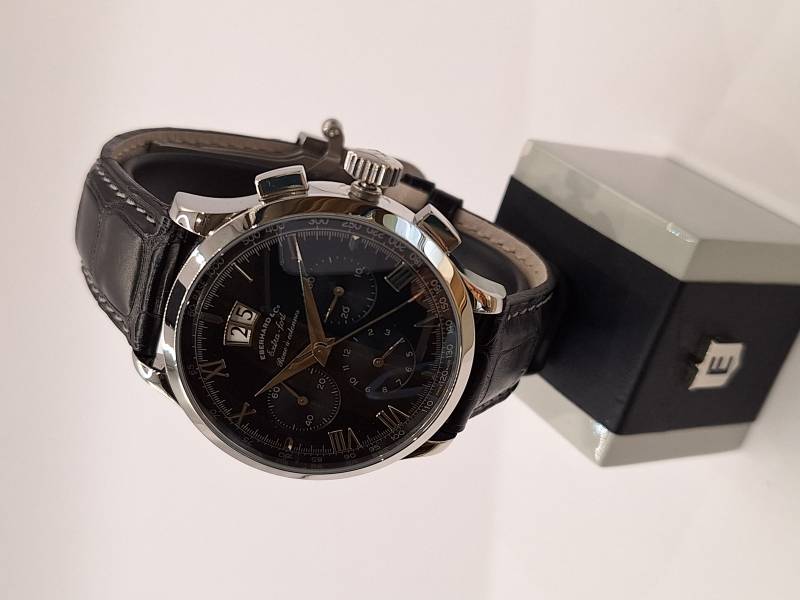 Orologio nuovo a carica automatica con Cronografo con ruote a colonna. Serie limitata di 500 pezzi creata per commemorare i 125 anni della Maison. Esemplare n. 108 a tre contatori e gran data al 12. Cassa in acciaio diametro 41 mm e spessore 14,9 mm. Vetro zaffiro bombato con trattamento antiriflesso e fondo zaffiro fermato da sei viti. Corona a vite e pulsanti a pressione, impermeabilità a 5 atm.