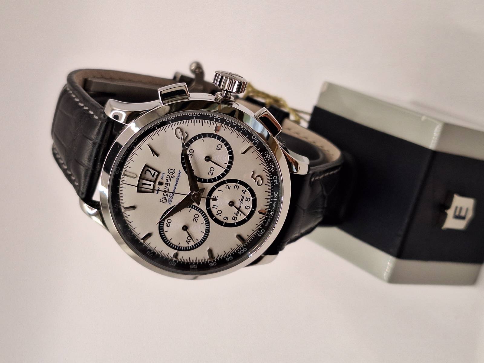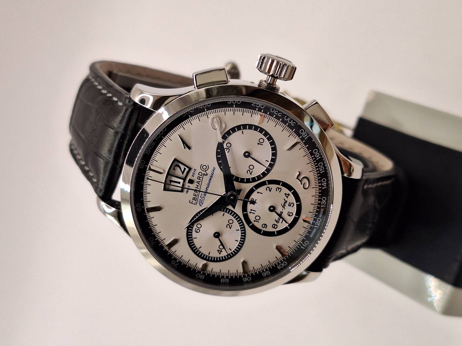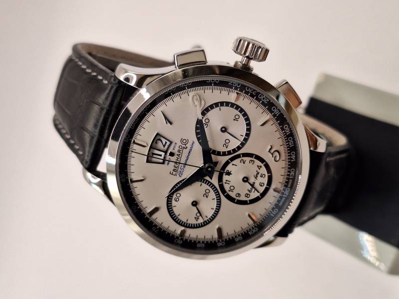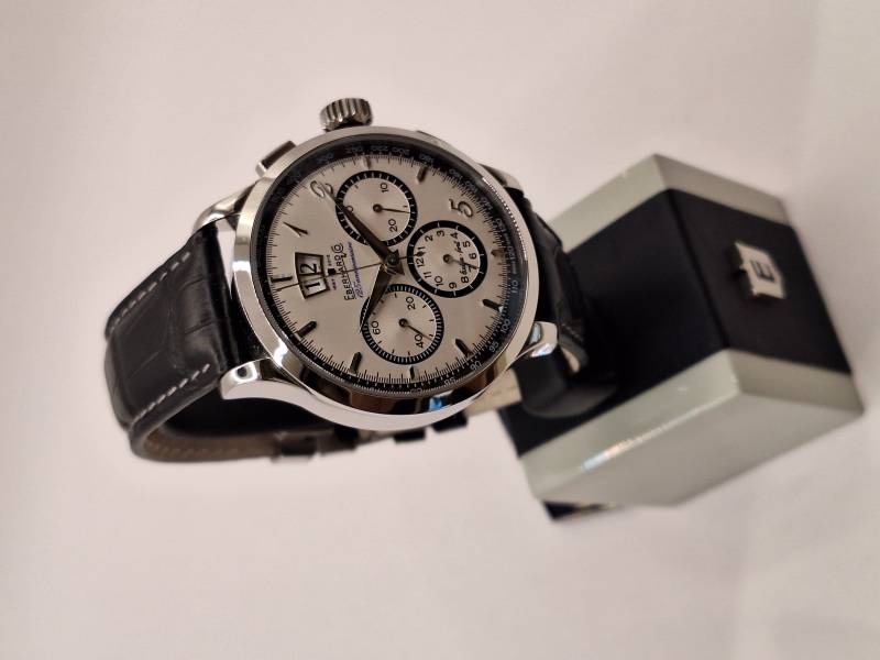 Orologio nuovo a carica automatica con cronografo a tre contatori e gran data al 12. Cassa in oro rosa 18 Kt diametro 41 mm e spessore 14,9 mm. Vetro zaffiro bombato con trattamento antifriflesso e fondo zaffiro fermato da sei viti. Corona a vite e pulsanti a pressione in oro rosa. Impermeabilità a 3 atm. Cronografo con ruote a colonna