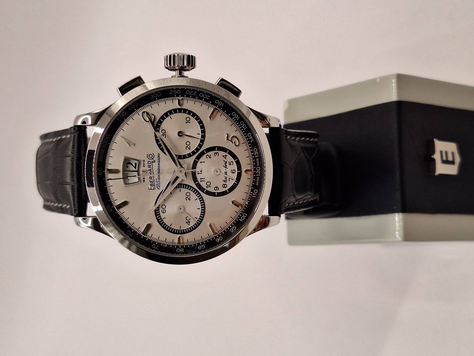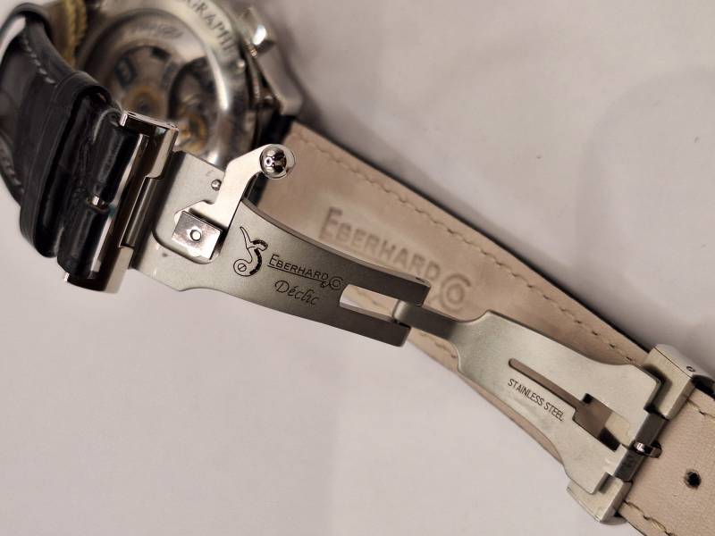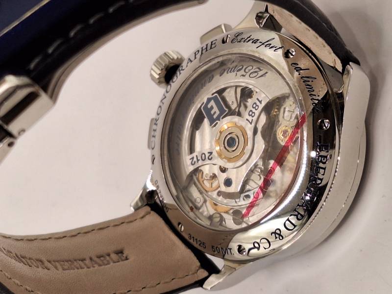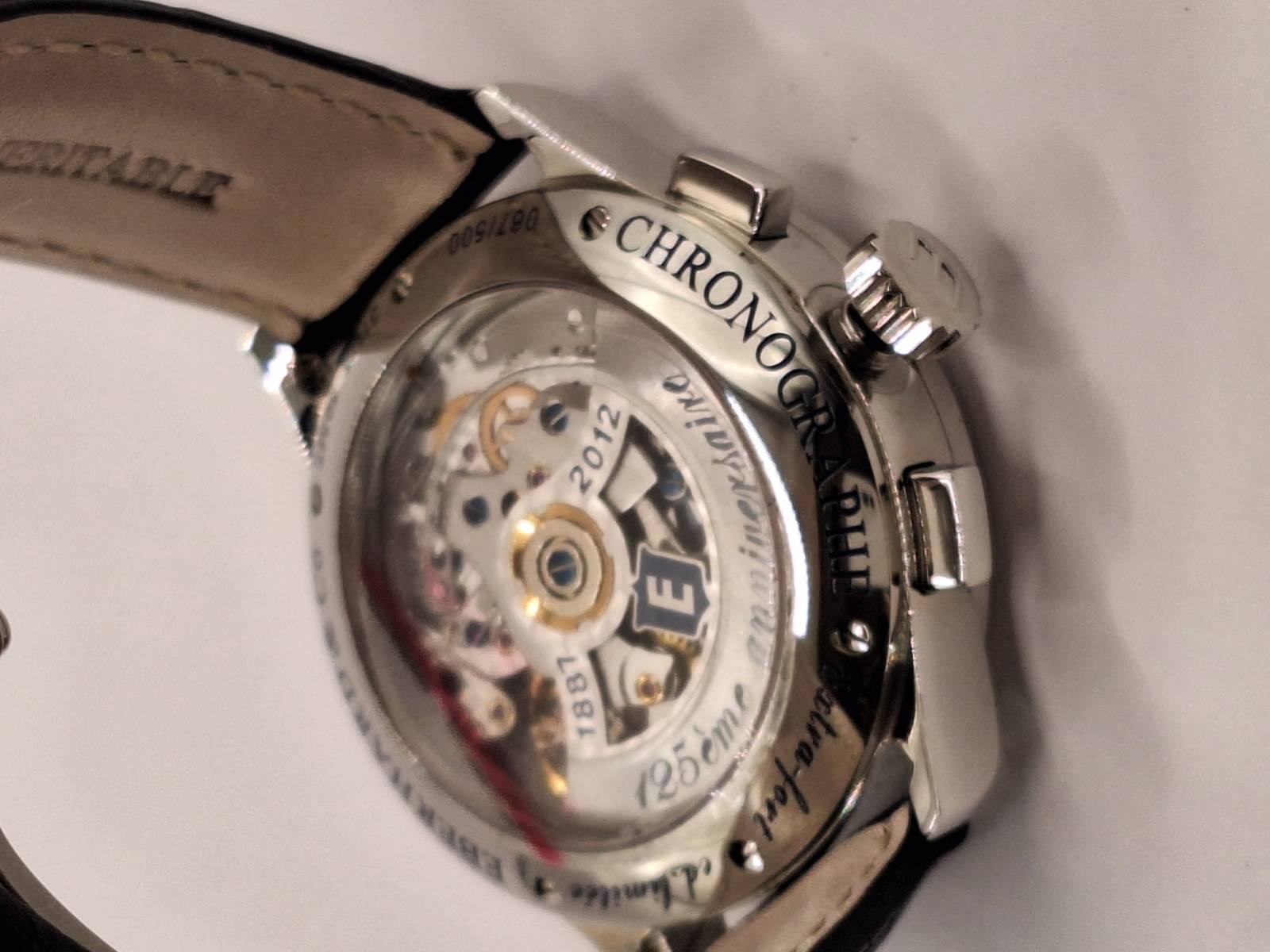 Orologio nuovo a carica automatica con cronografo a tre contatori e gran data al 12. Cassa in oro rosa 18 Kt diametro 41 mm e spessore 14,9 mm. Vetro zaffiro bombato con trattamento antifriflesso e fondo zaffiro fermato da sei viti. Corona a vite e pulsanti a pressione in oro rosa. Impermeabilità a 3 atm. Cronografo con ruote a colonna