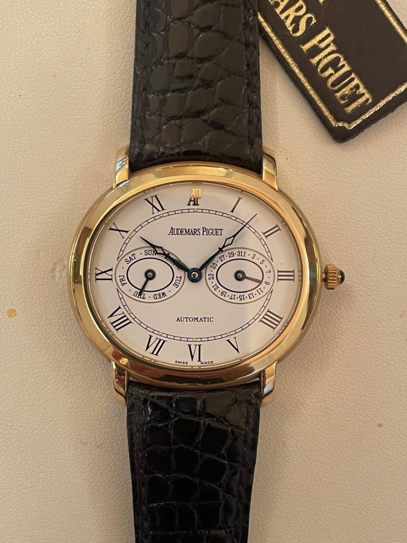 Elegante orologio a carica automatica con cassa in oro giallo 18 kt indicante il giorno della settimana e la data oltre ad ore e minuti.