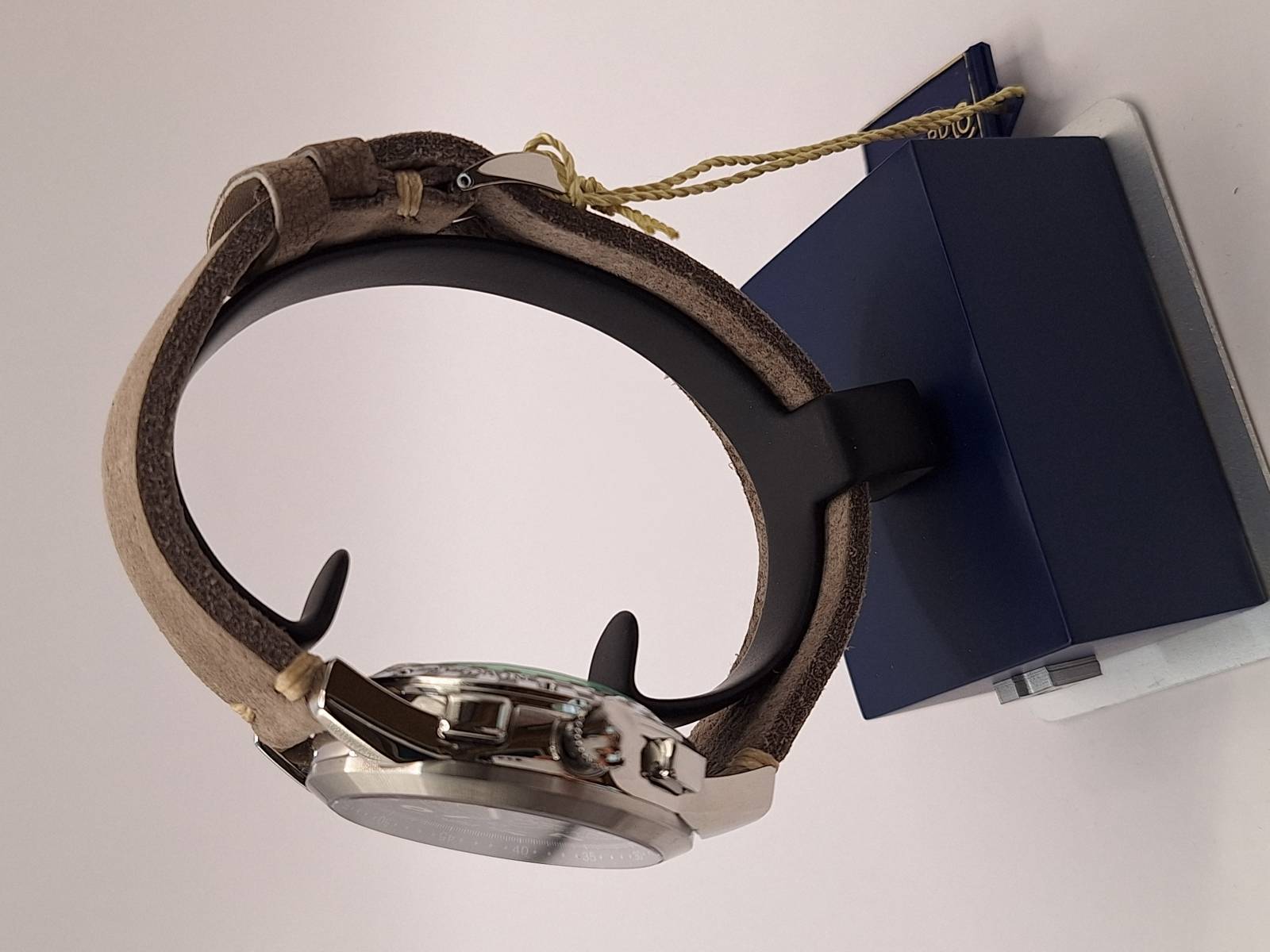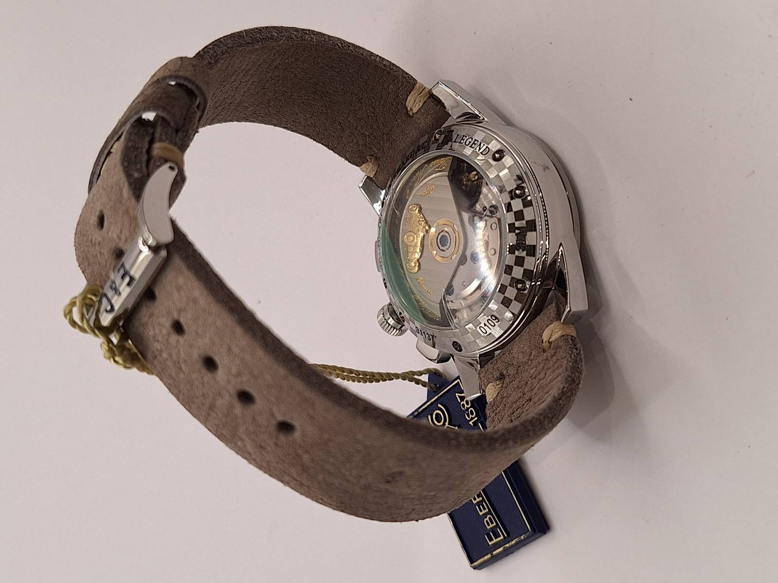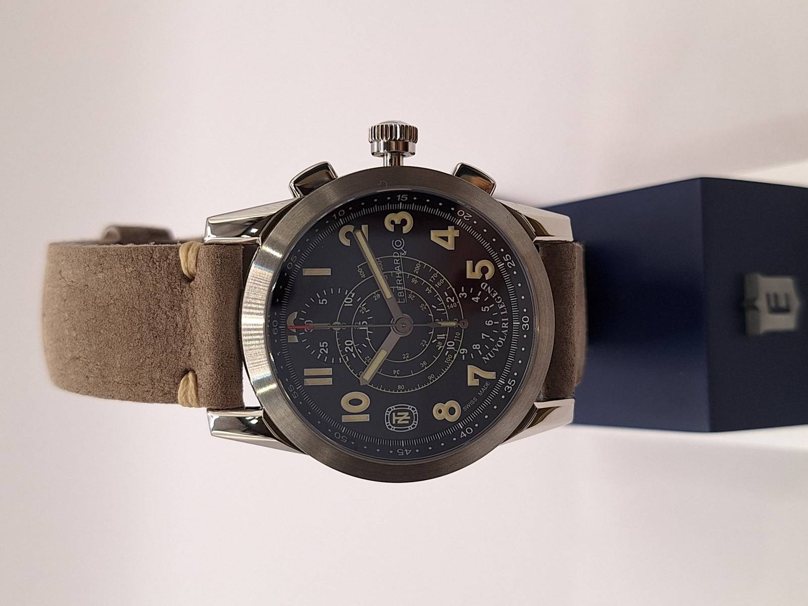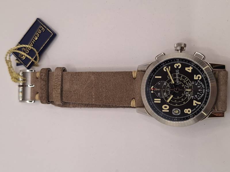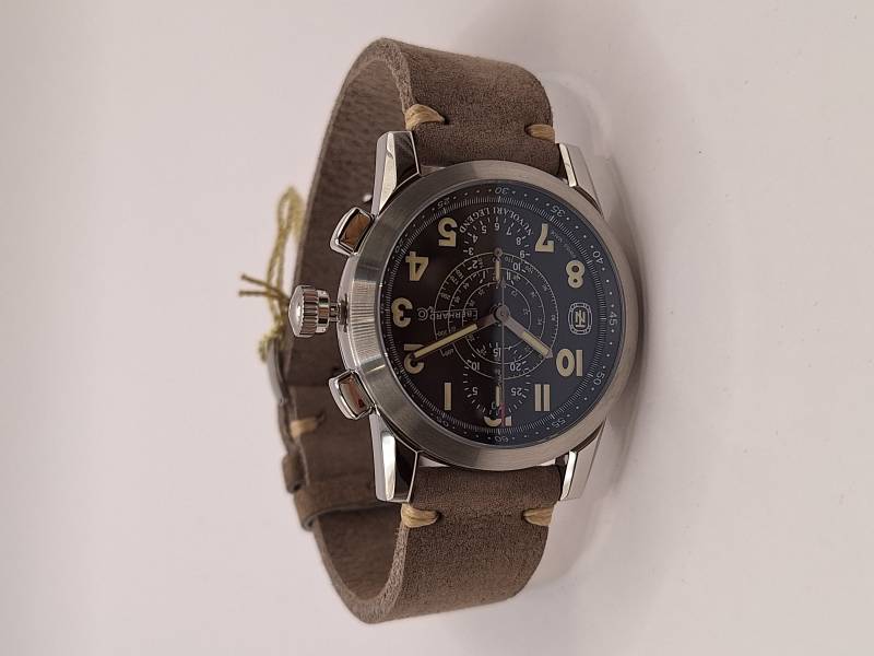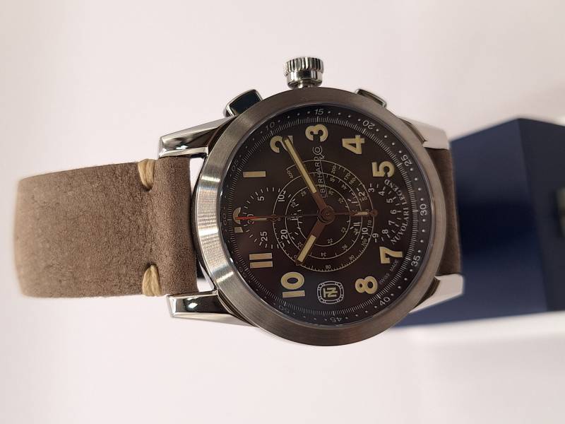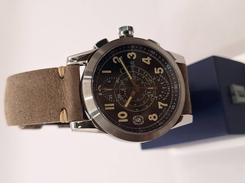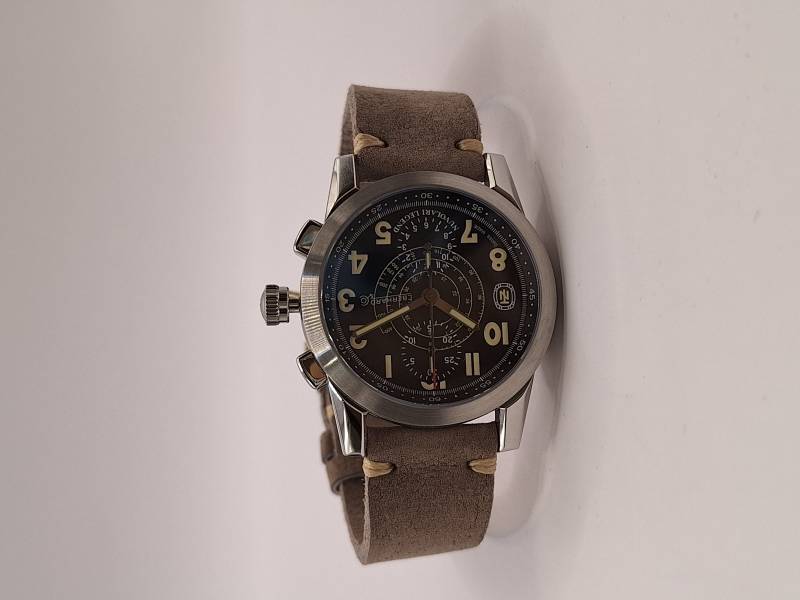 Edizione del celebre cronografo della Maison arricchito dalla presenza del datario al 6. Orologio a carica automatica con funzioni cronografiche a due contatori (ore e minuti). Cassa in acciaio diametro 43 mm e spessore mm 13,3, vetro zaffiro e fondello in acciaio fermato da otto viti e inciso con la firma del celebre pilota e la sua tartaruga portafortuna. Ghiera in acciaio riportante la scala tachimetrica in miglia/h. Corona a vite e pulsanti a pressione. Impermeabilità a 3 atm.