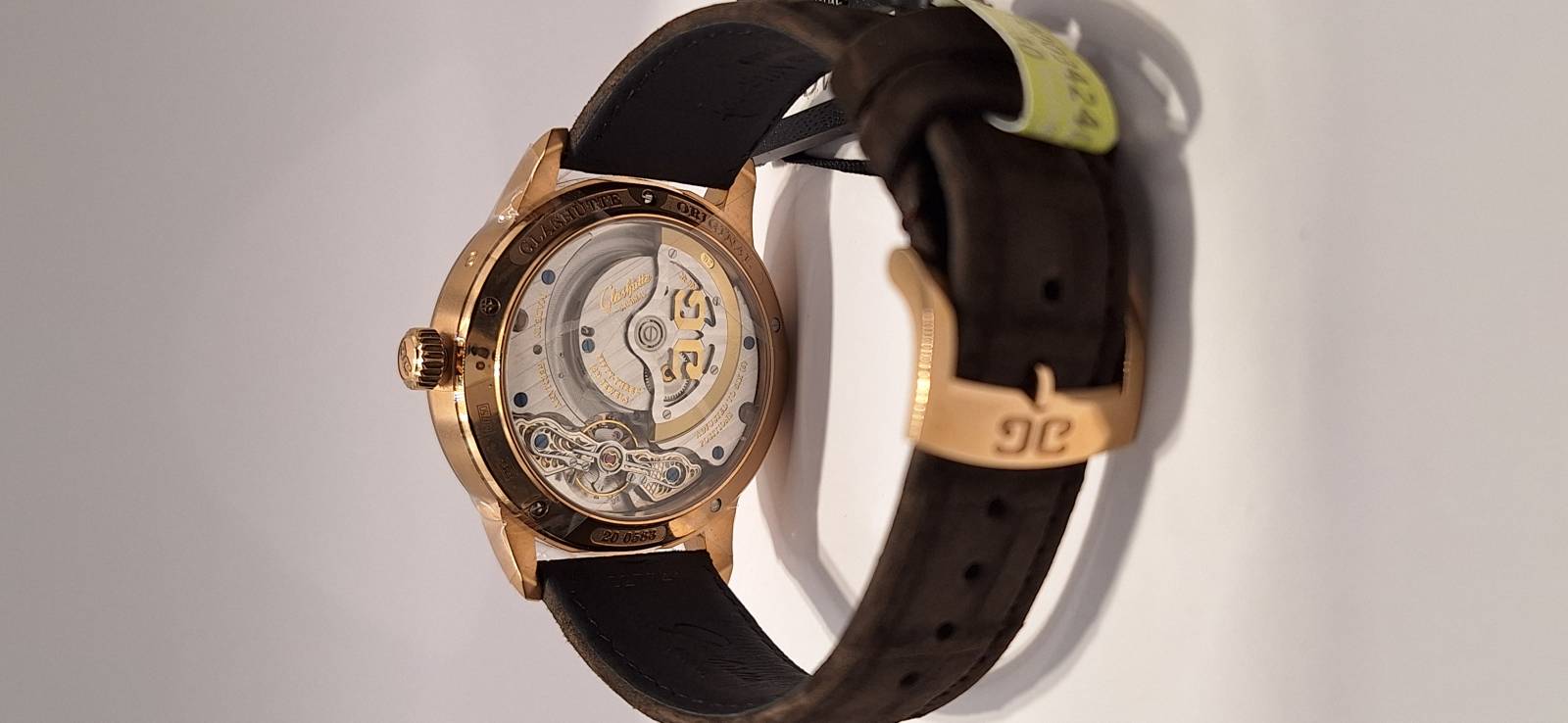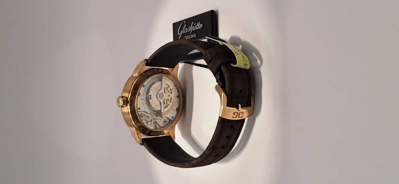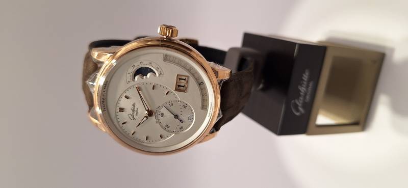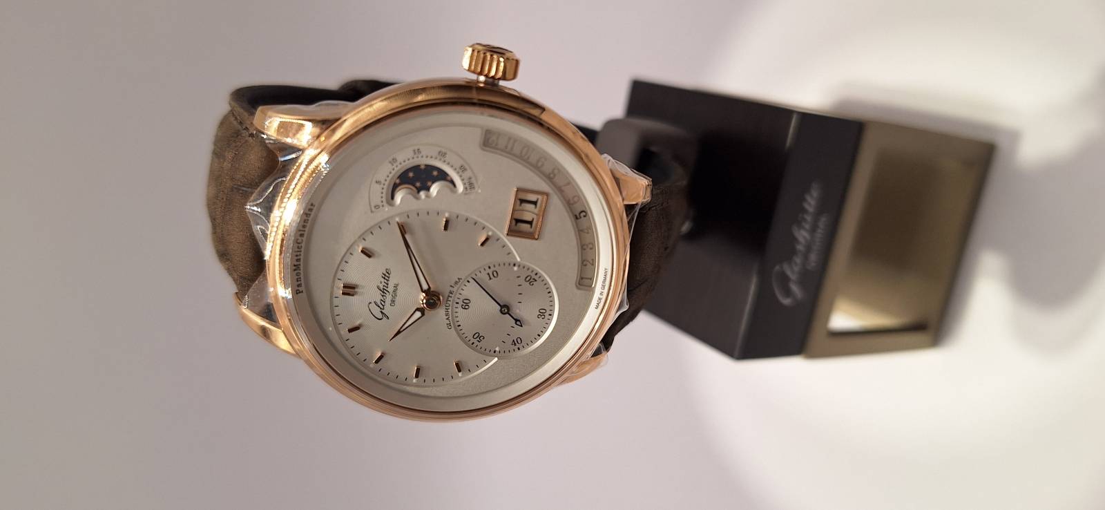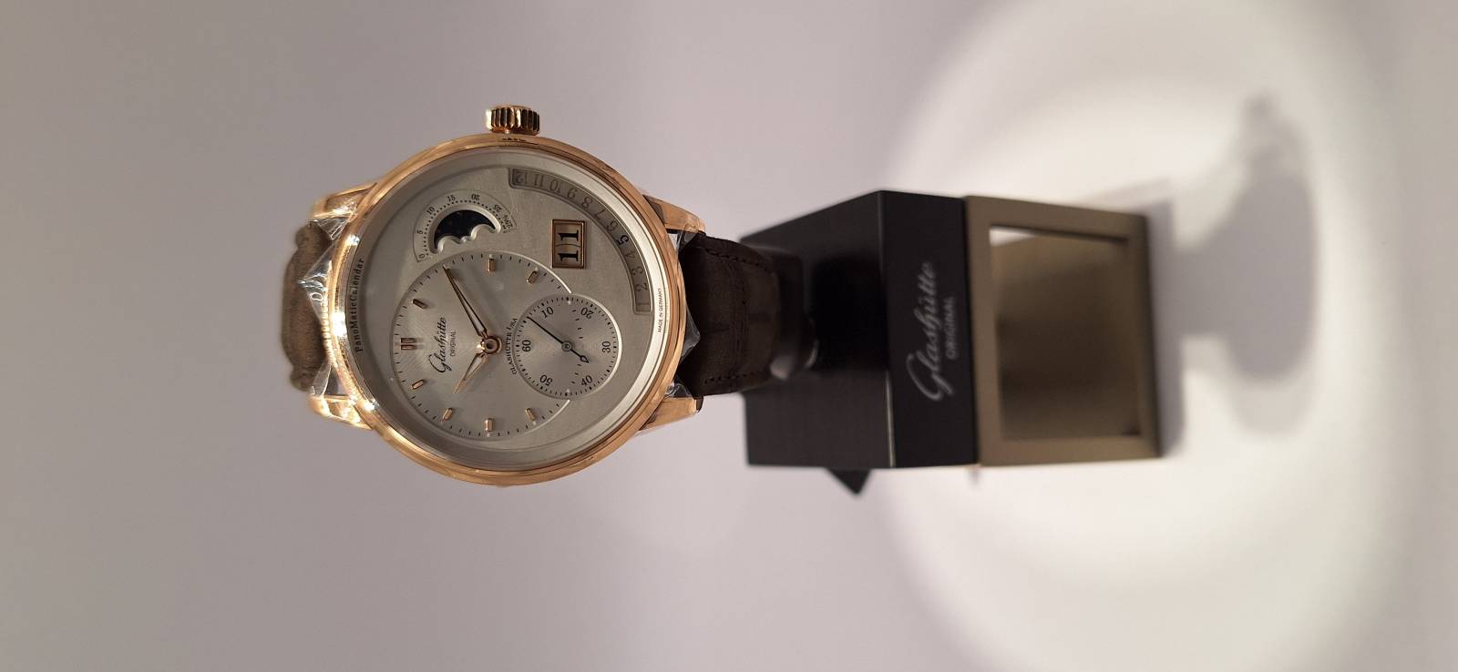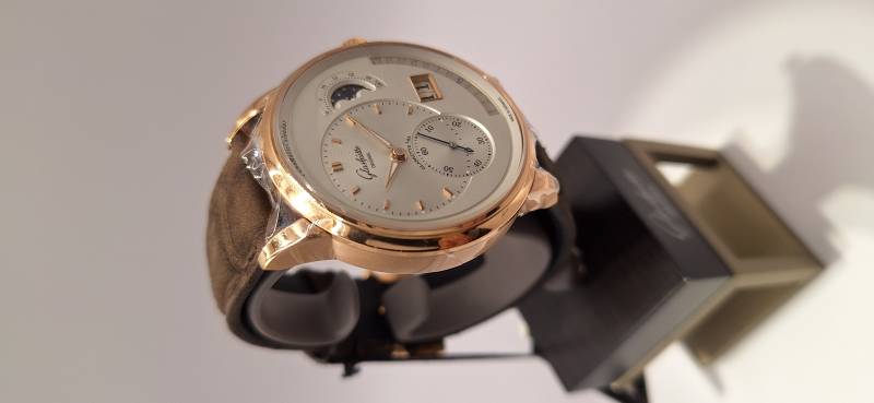 Orologio nuovo, carica automatica, secondi indipendenti al 6, data panoramica, fasi di luna e calendario annuale con indicazione retrograda del mese diametro cassa mm 42, spessore 12,4 mm, vetro zaffiro superiore e fondello in vetro zaffiro, movimento di manifattura cal. 92-09 con rotore con applicazioni in oro 21 Kt